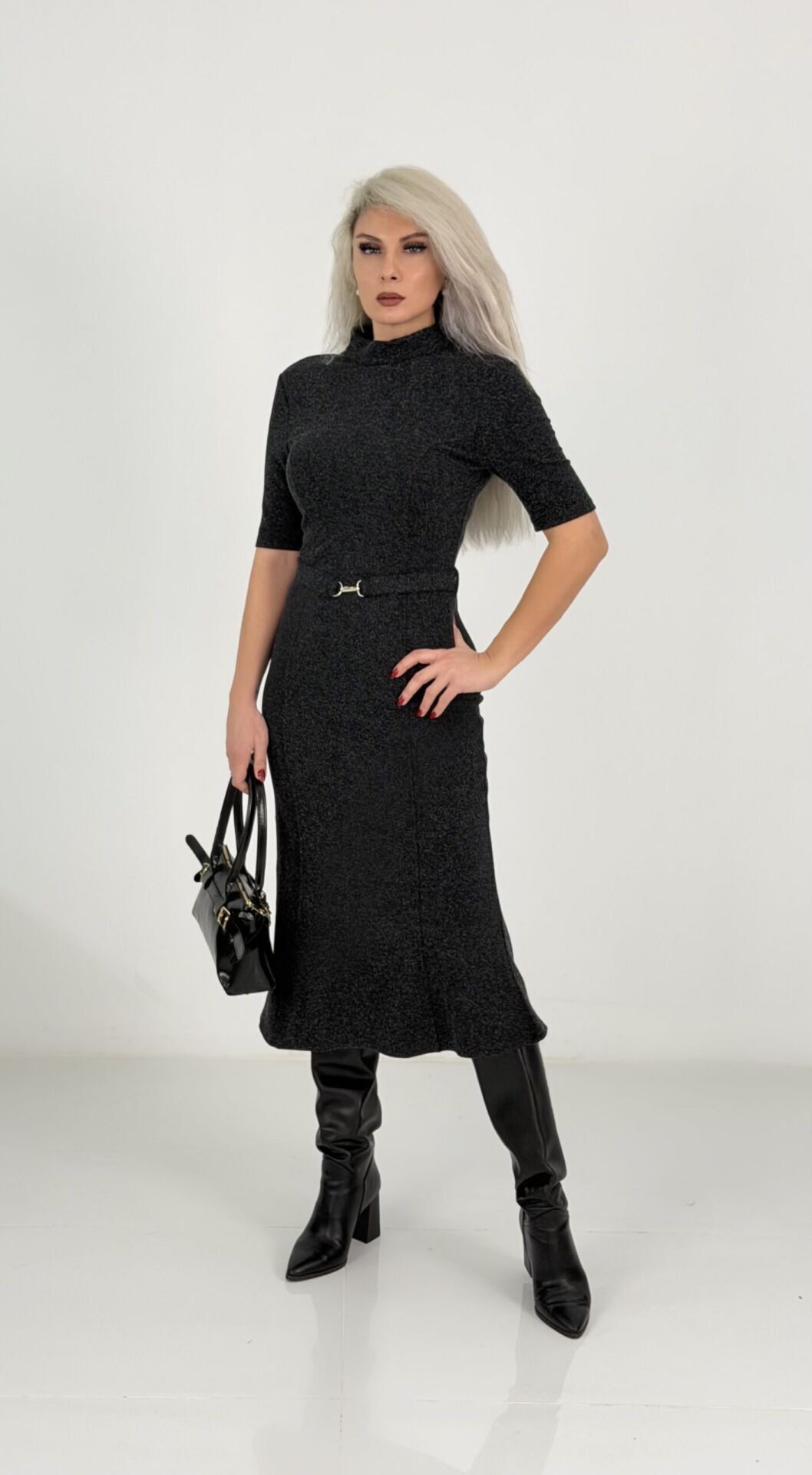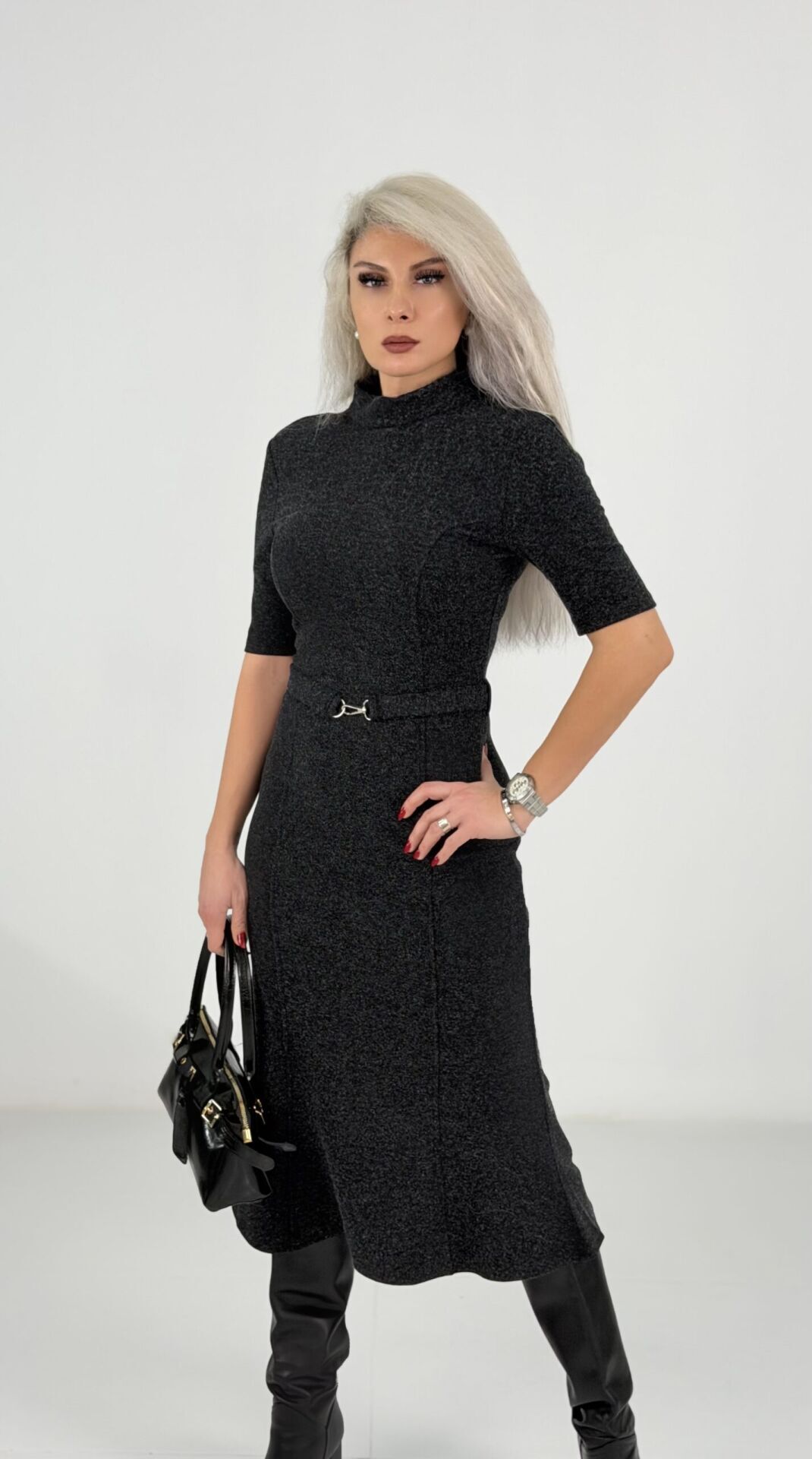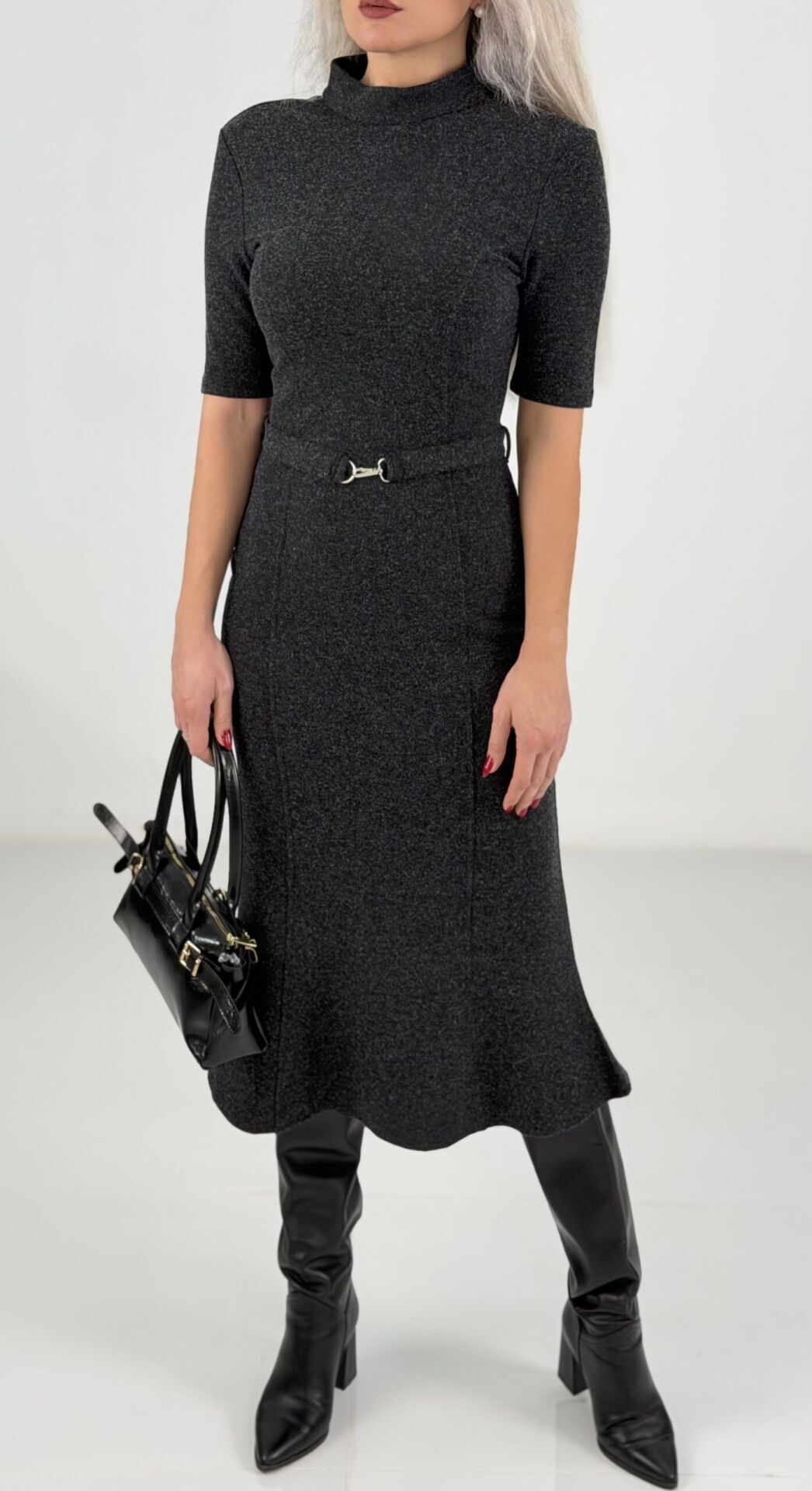 Antrasit Yarım Balıkçı Çelik Kumaş Midi Elbise