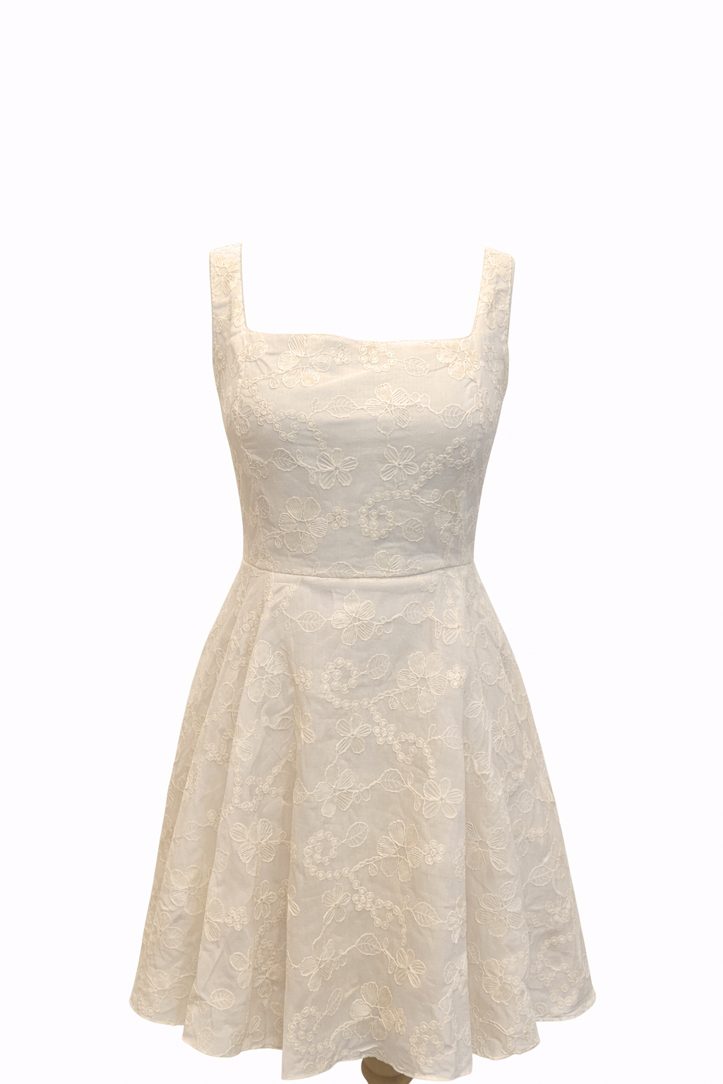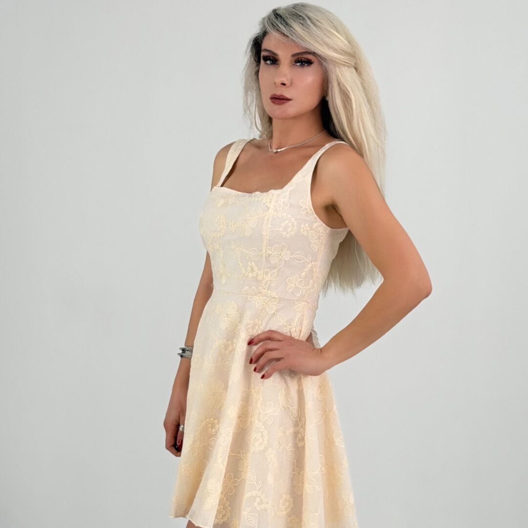 Bej Güpür Çiçek Detay Askılı Balon Mini Elbise