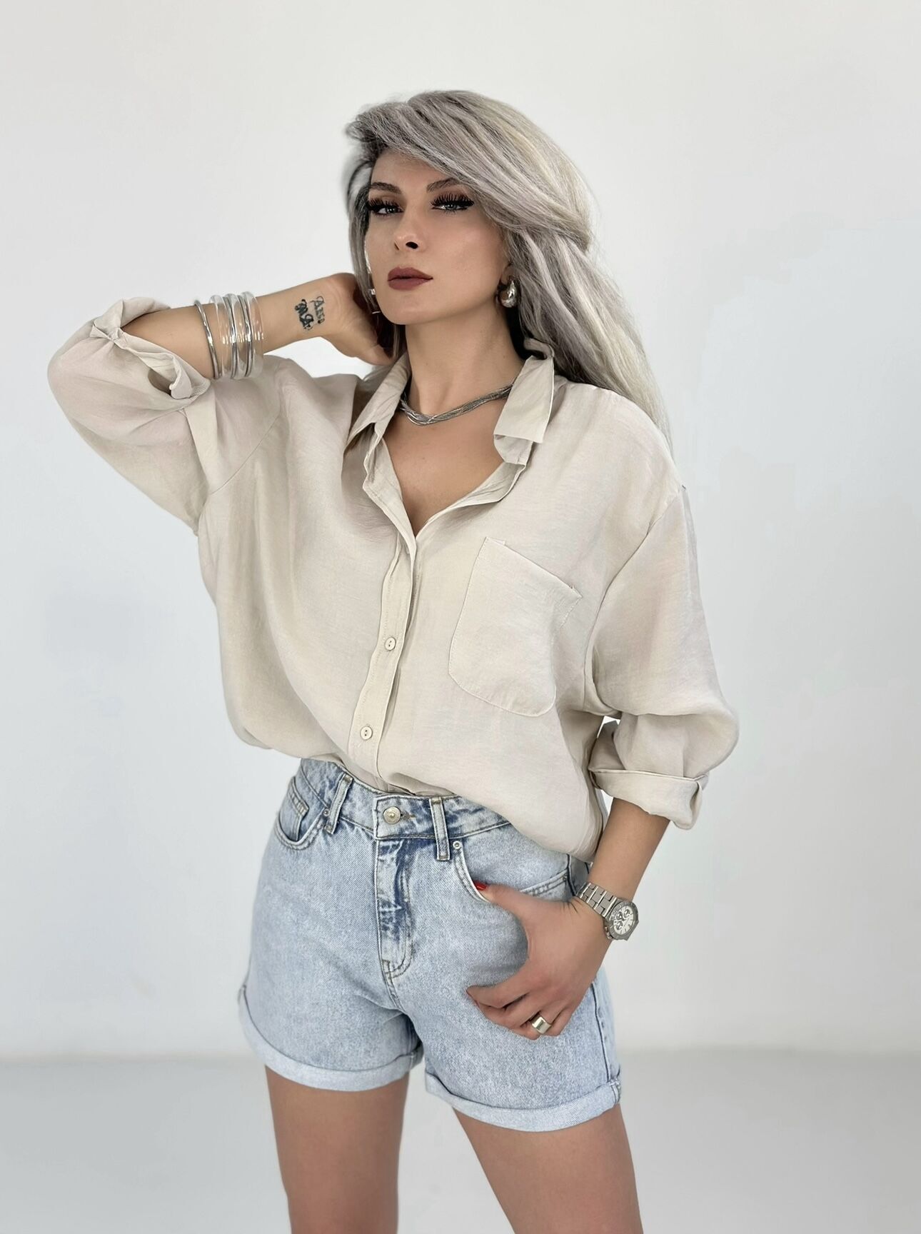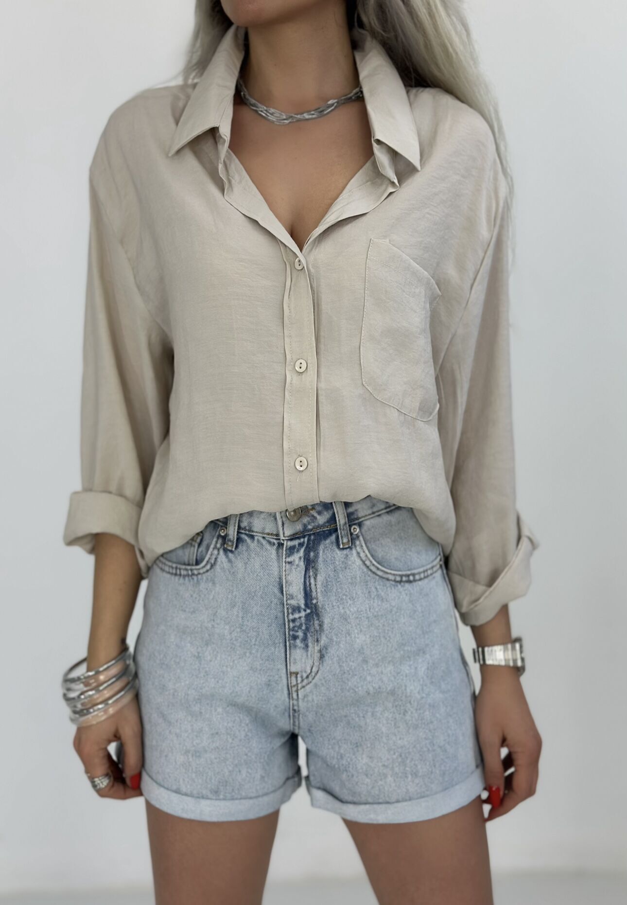 Bej Salaş Pamuk Saten Gömlek