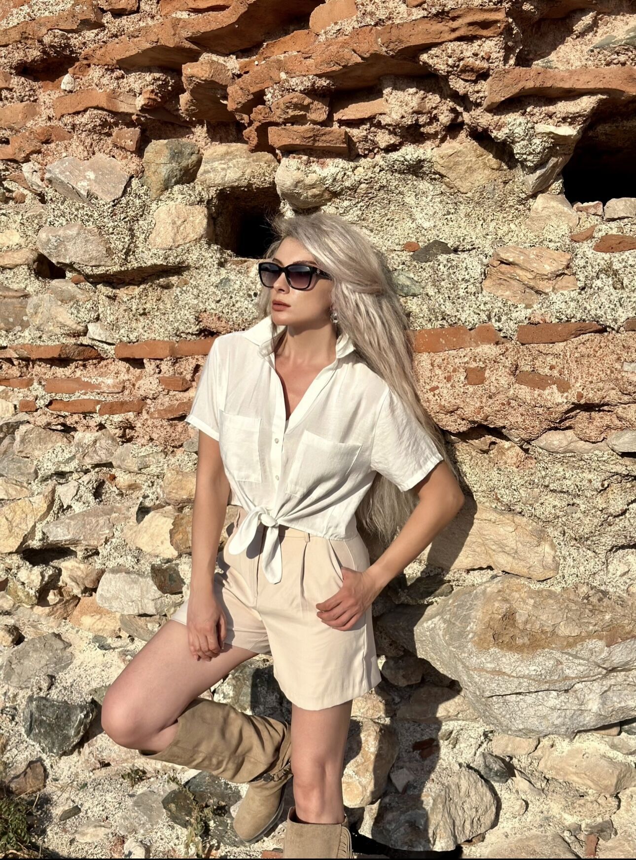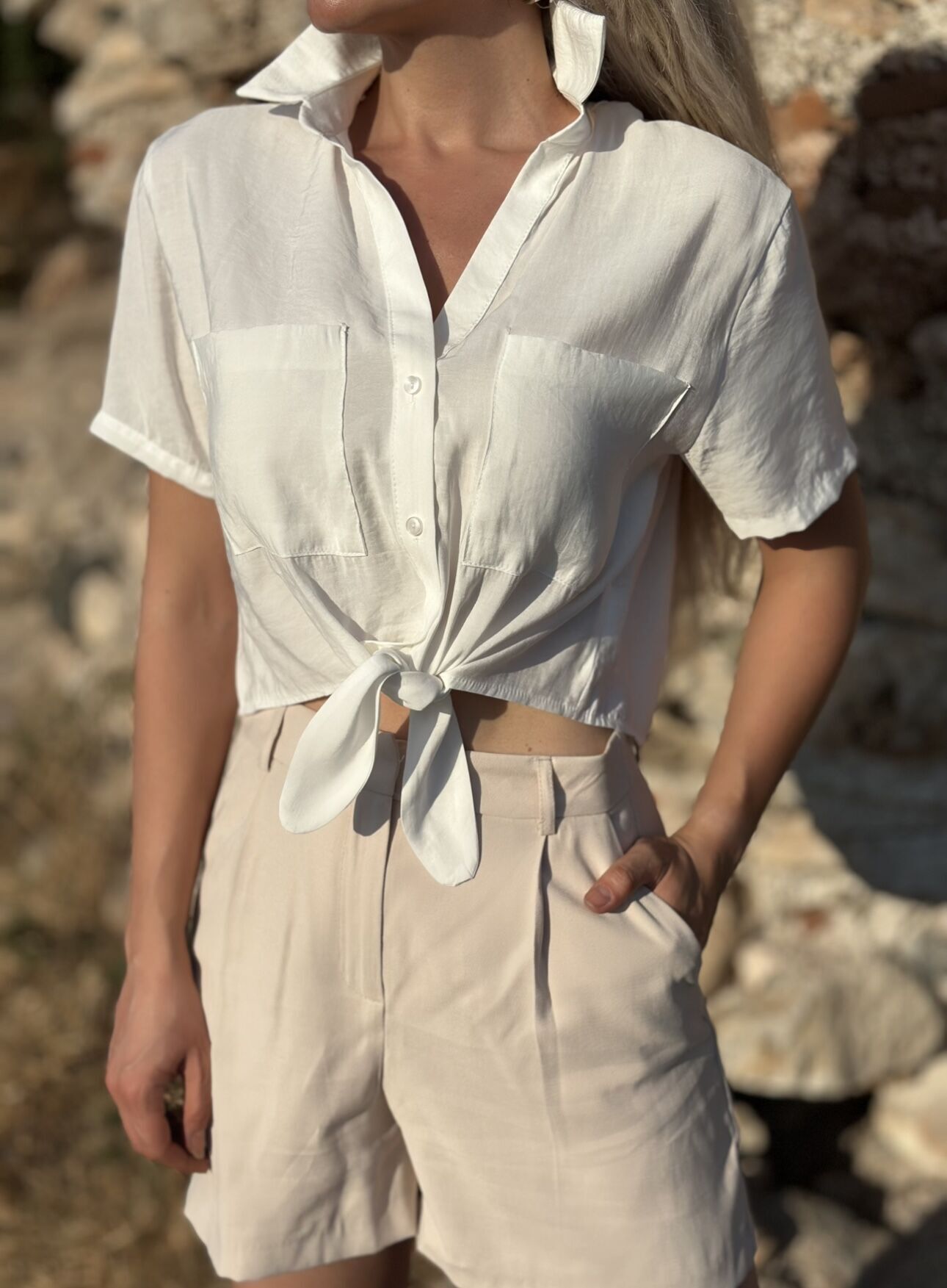 Beyaz Kısa Kollu Bağlamalı Gömlek