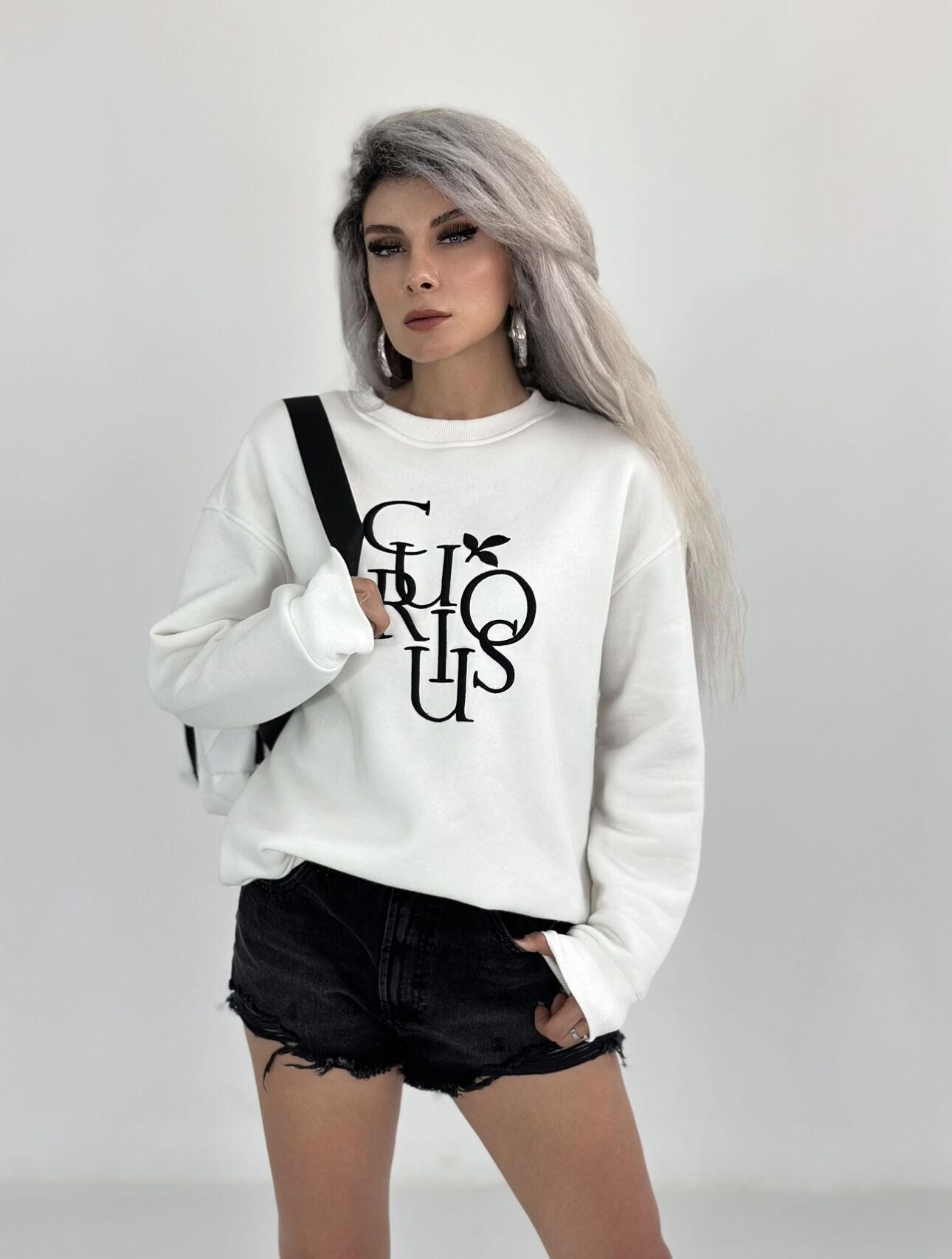 Beyaz Nakış Baskılı Rahat Kalıp Sweat