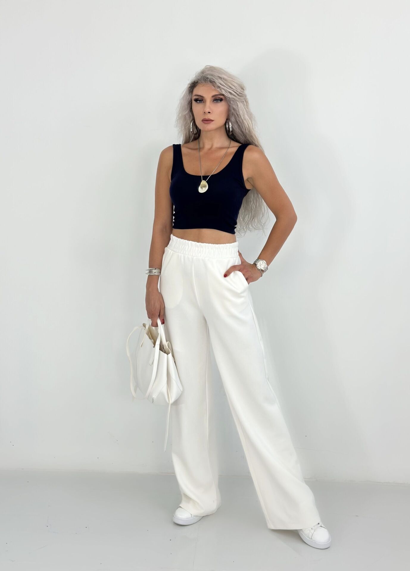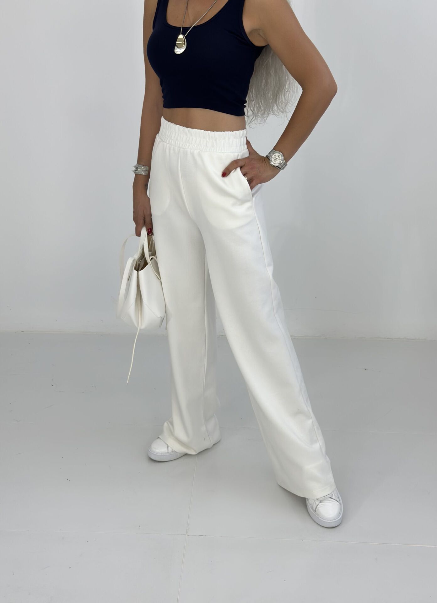 Beyaz Oysh Kumaş Bol Eşofman Altı
