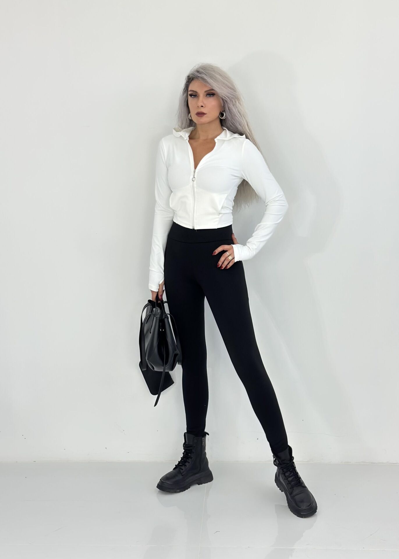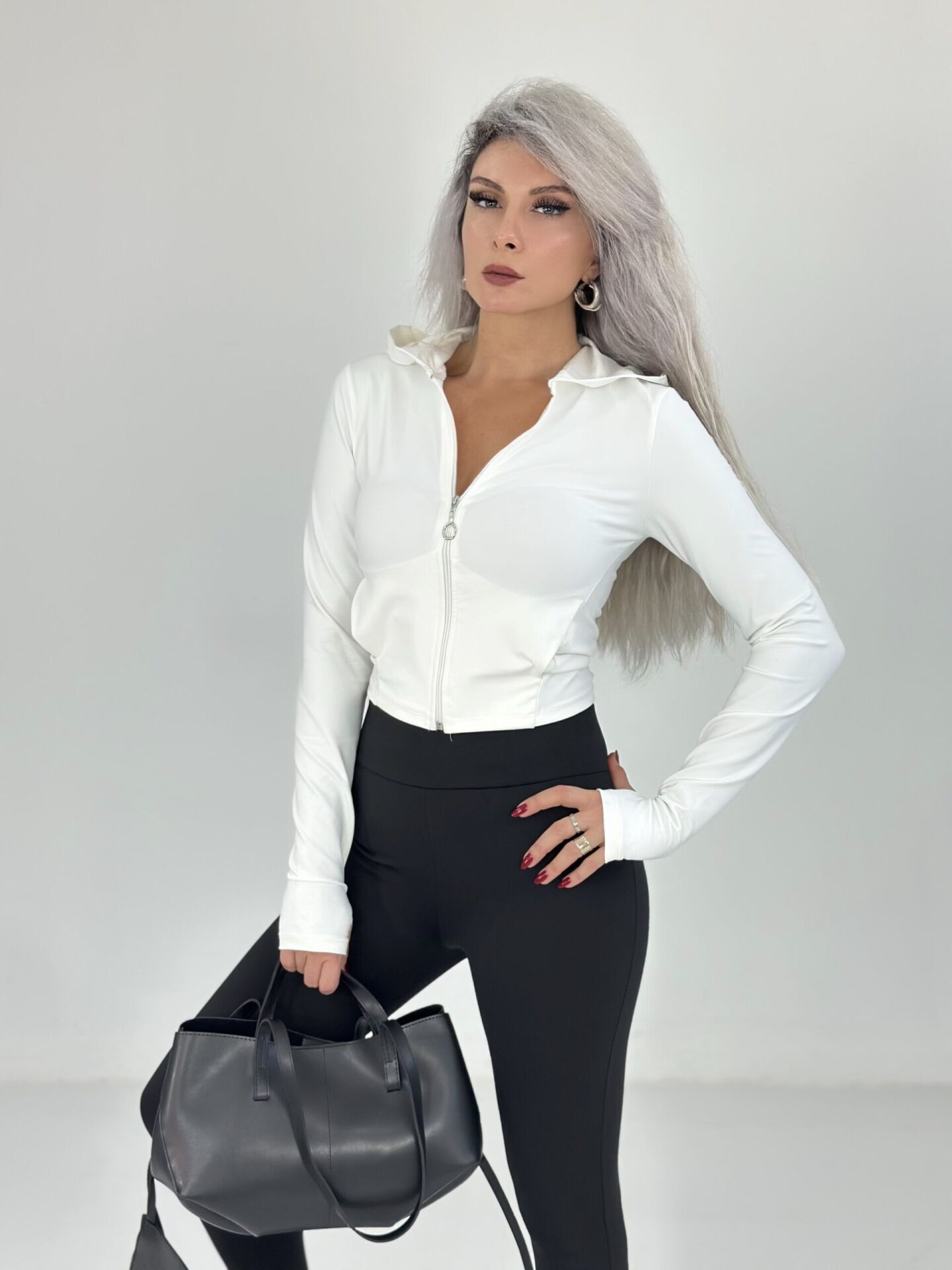 Beyaz Parmak Geçmeli Fermuarlı Sweat