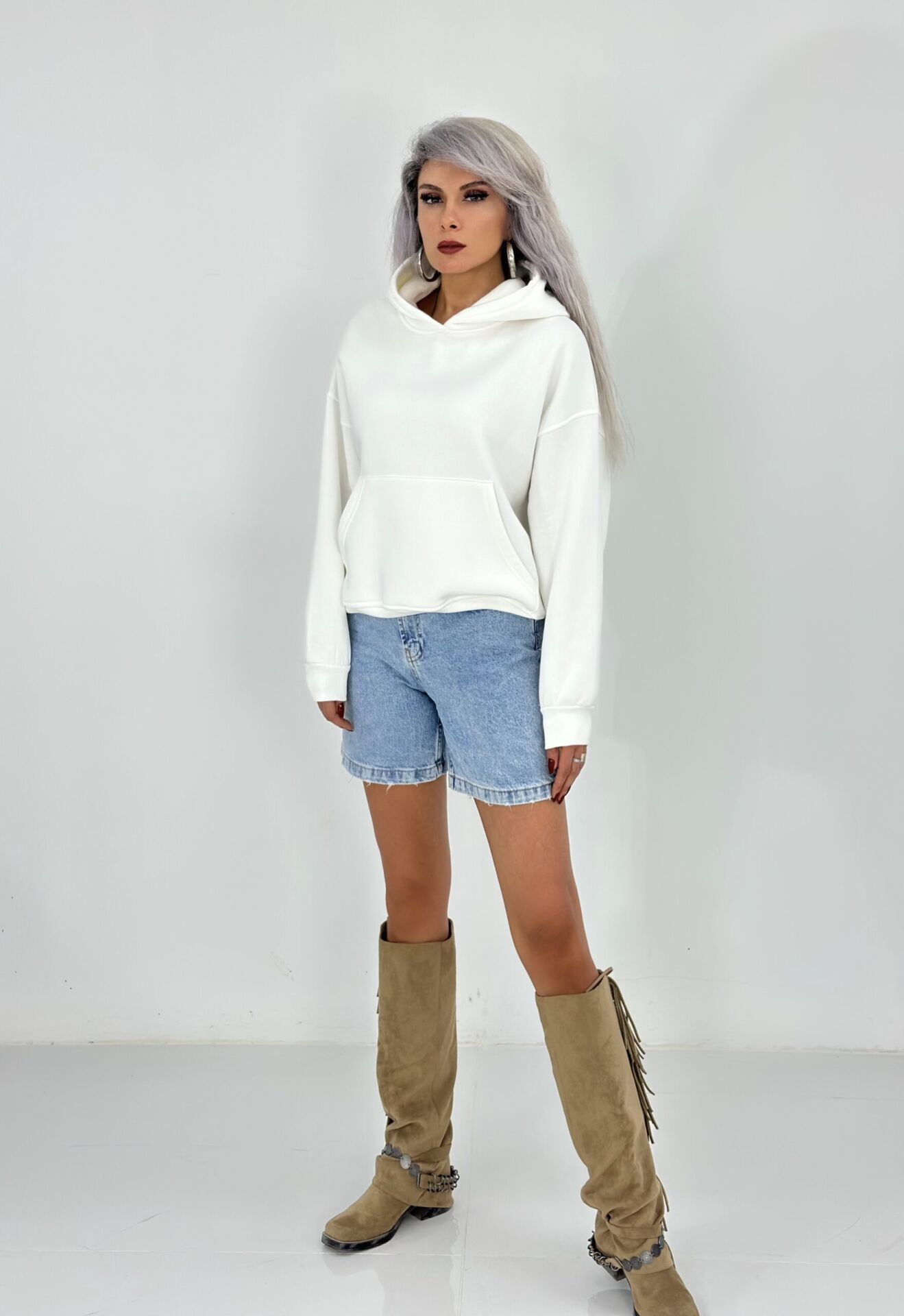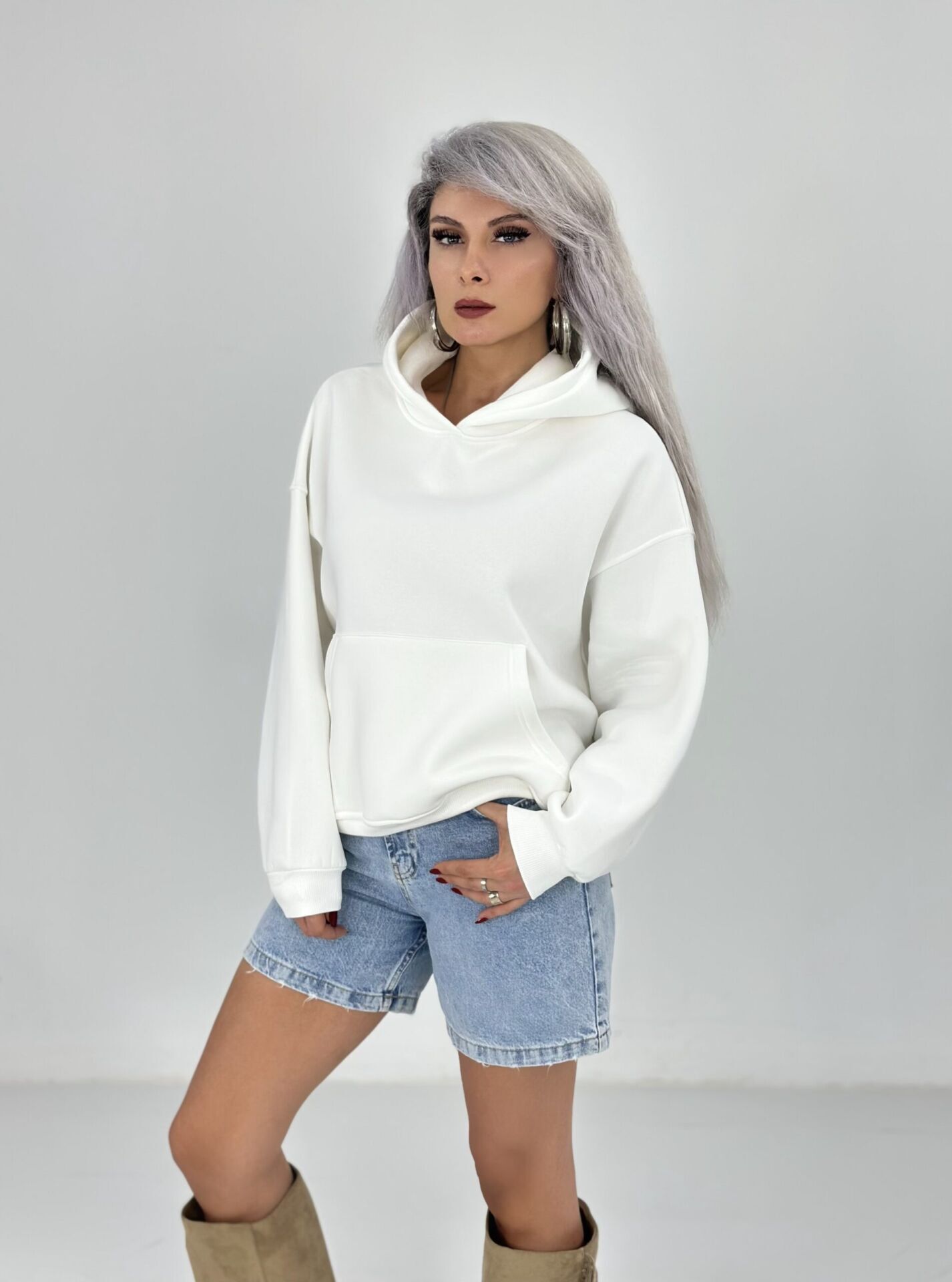 Beyaz Şardonlu Cepli Sweatshirt