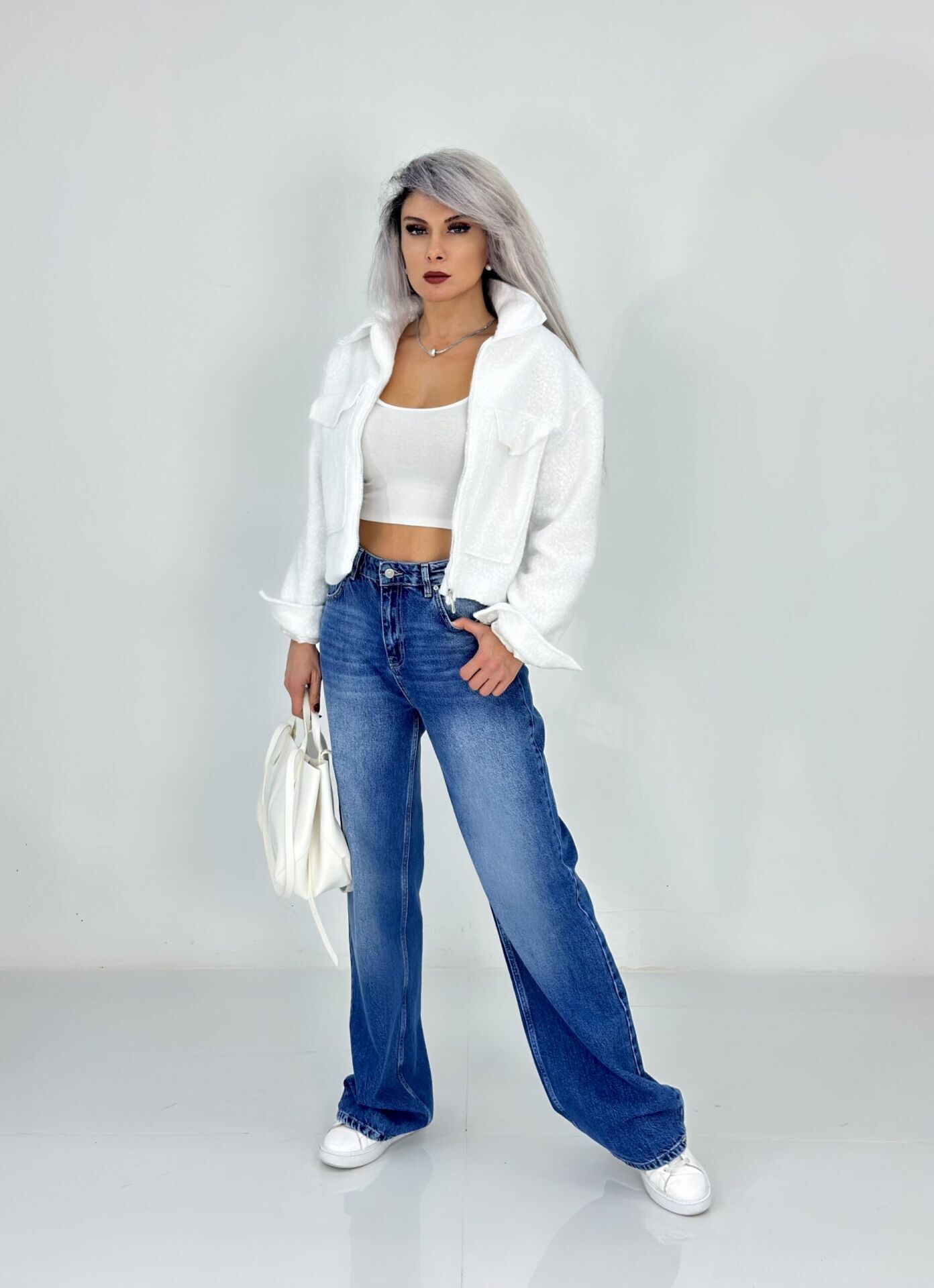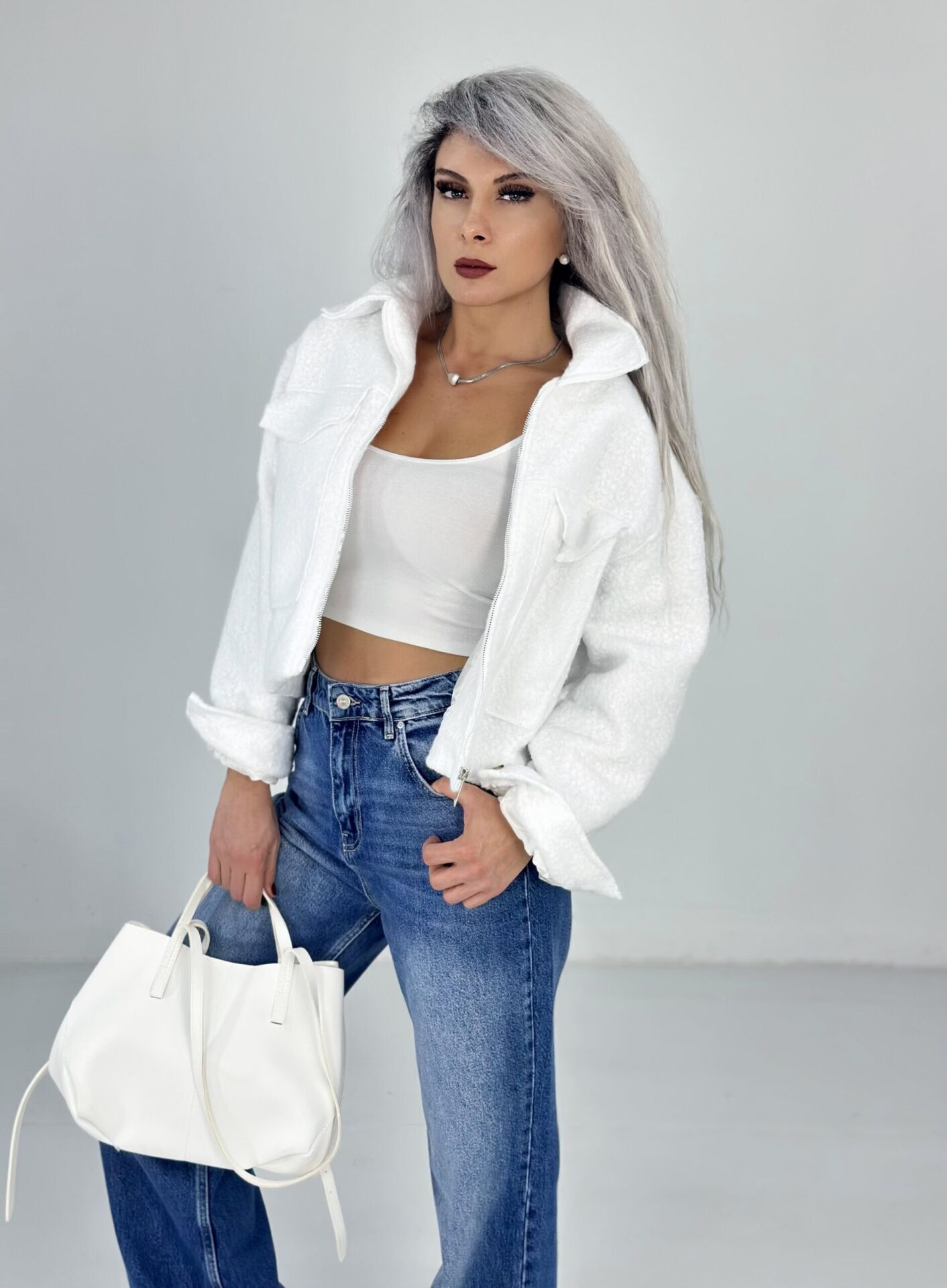 Beyaz Teddy Kumaş Kısa Ceket