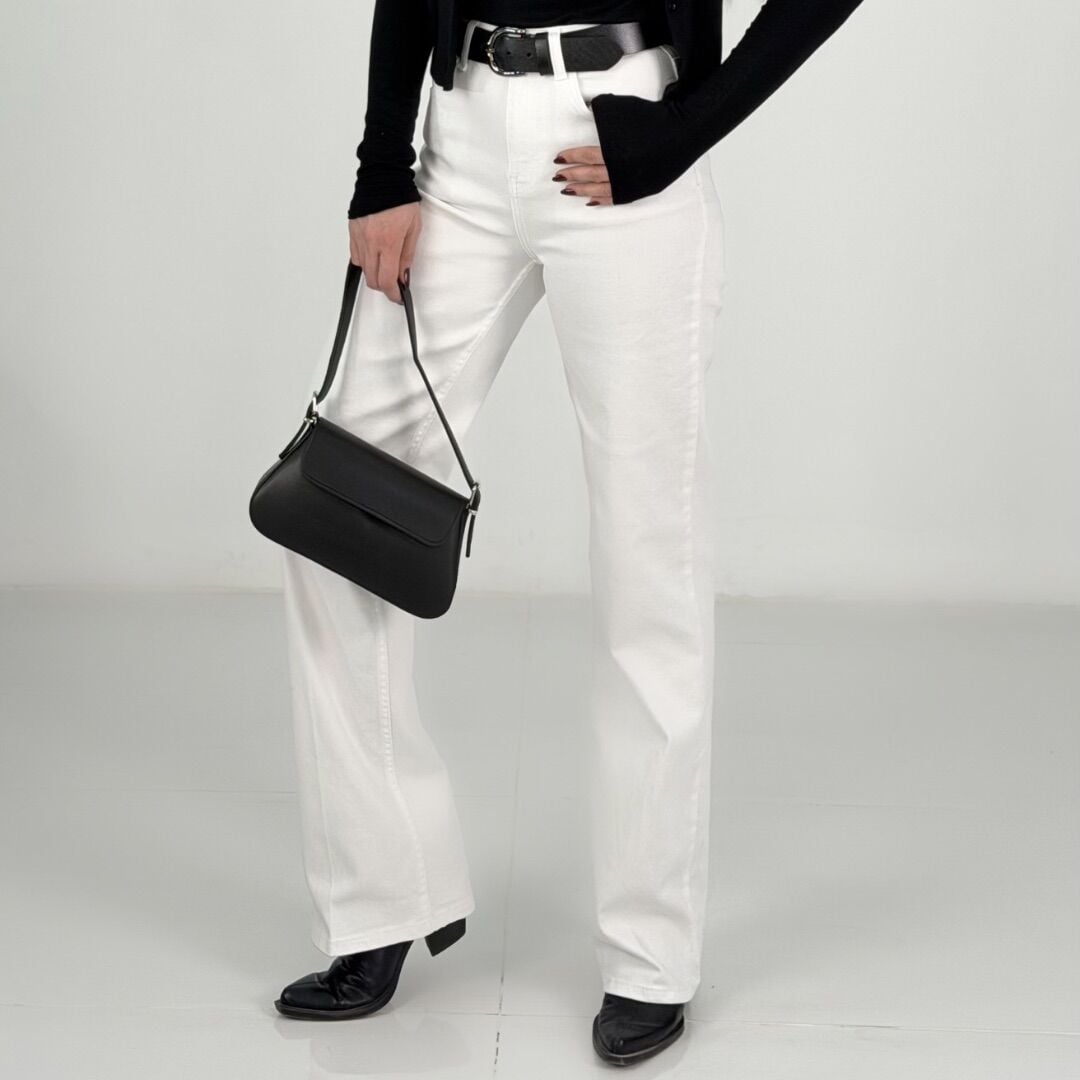 Beyaz Yüksek Bel Likralı Wide Leg Jean Pantolon