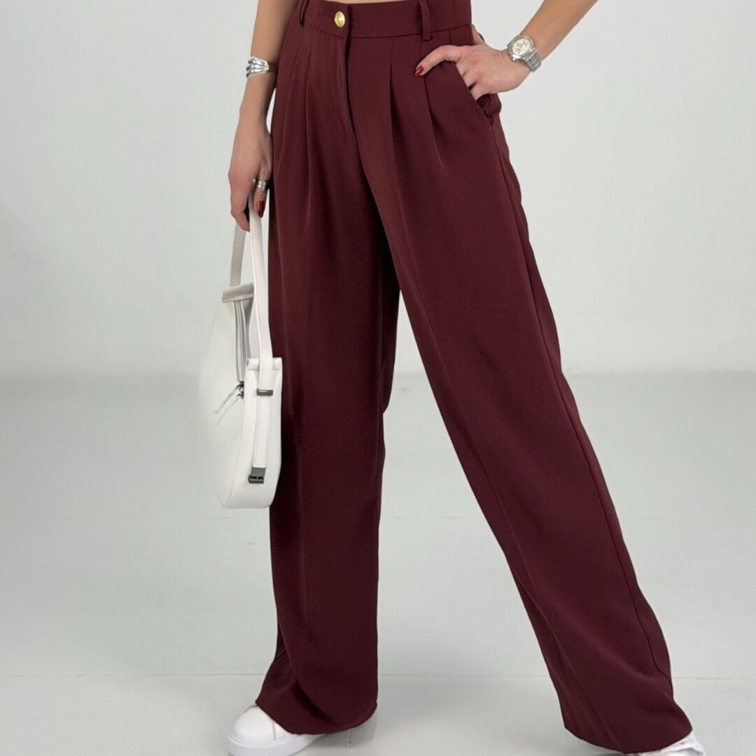 Bordo Belden Lastikli Bol Paça Kumaş Pantolon