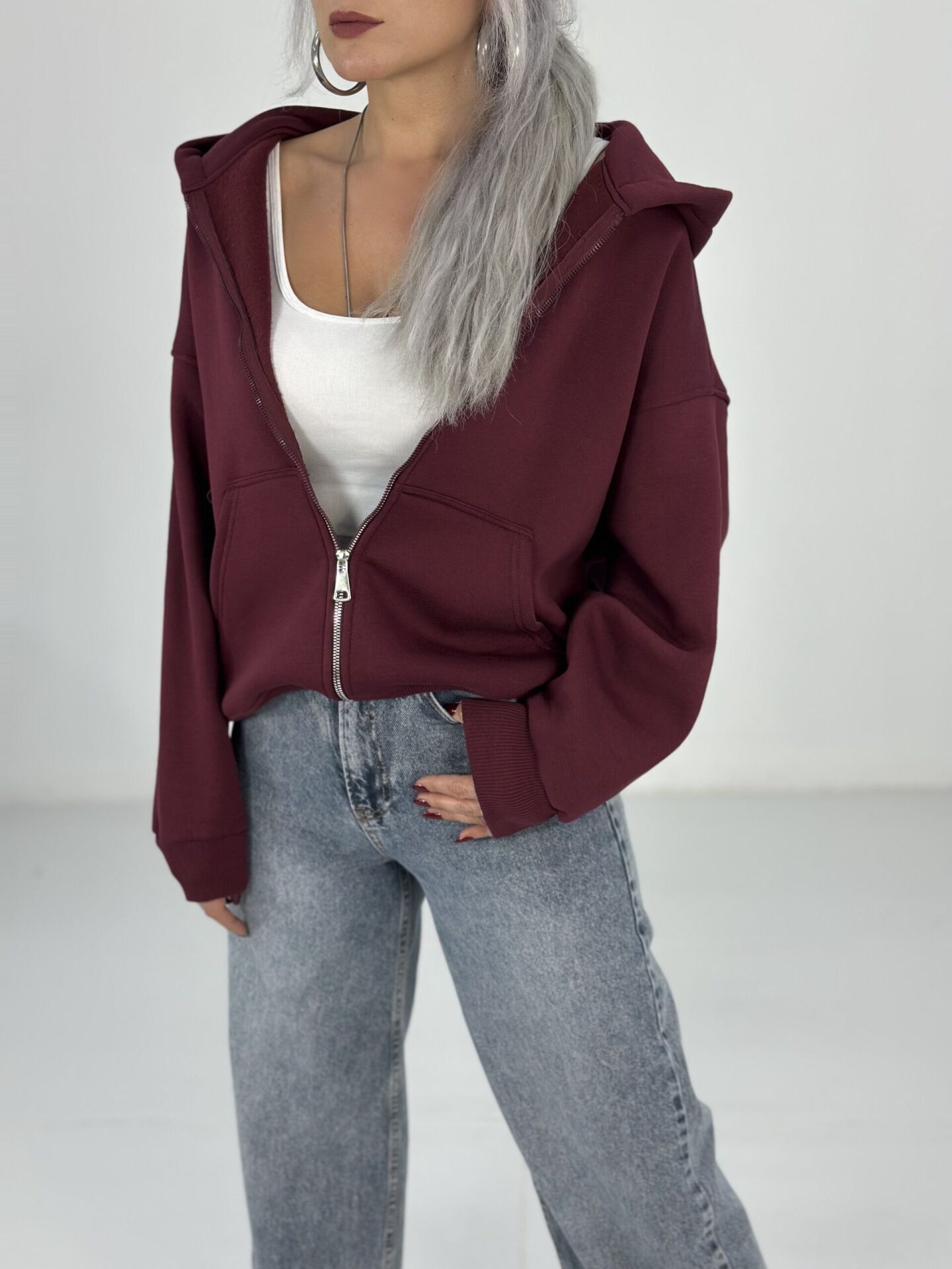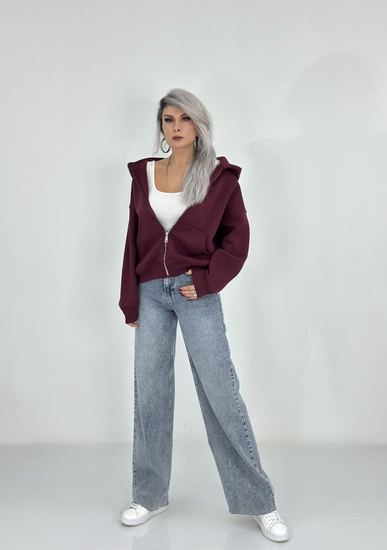 Bordo Kapşonlu Fermuarlı Sweatshirt