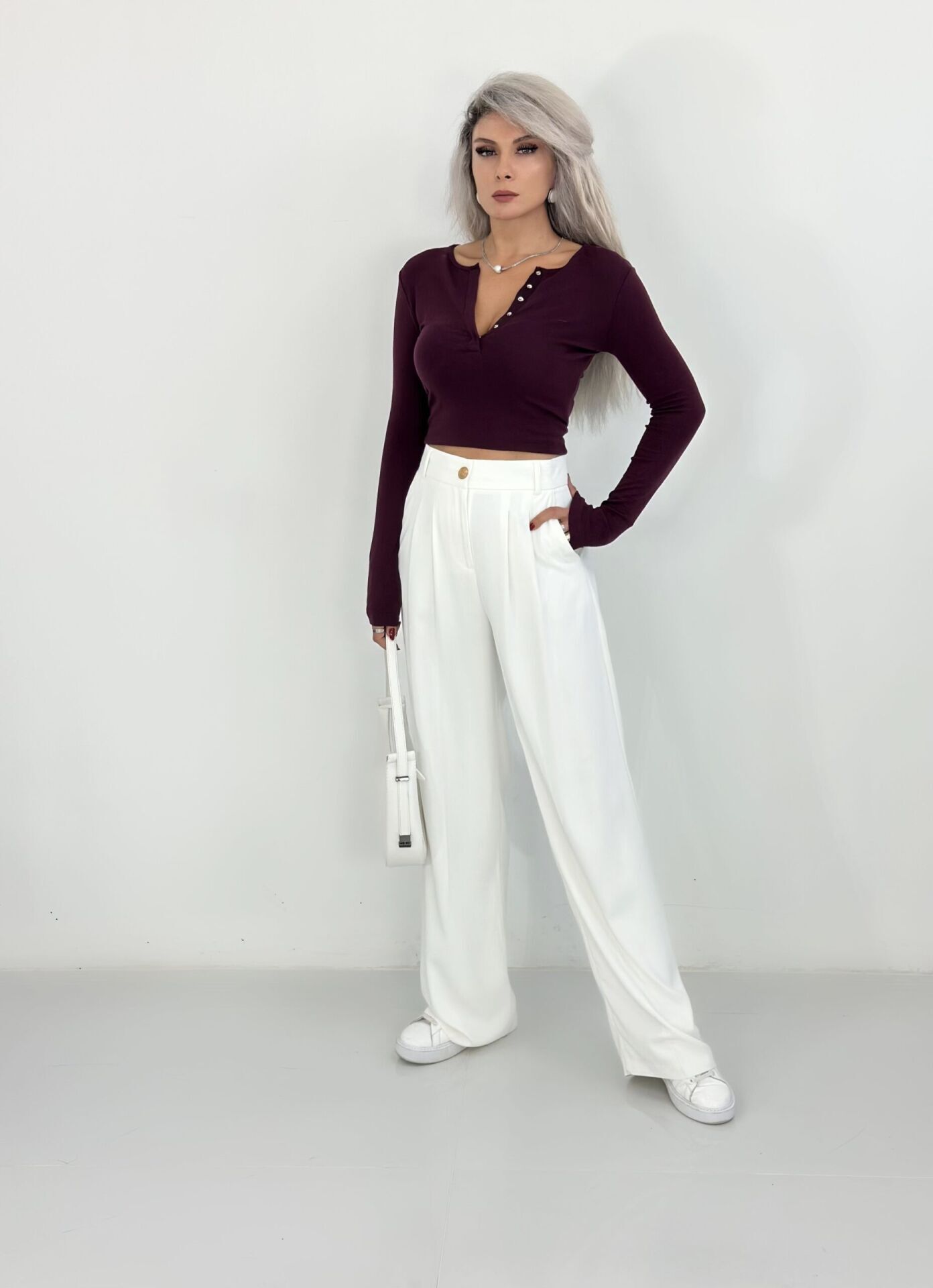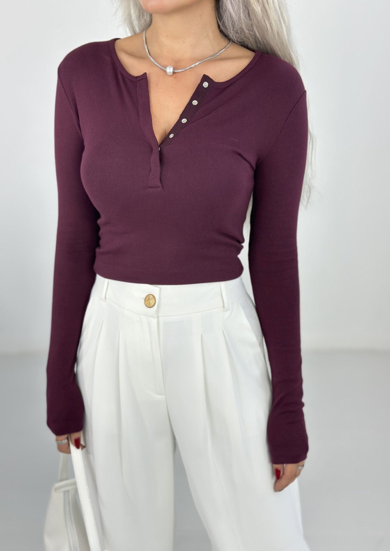 Bordo Önden Çıtçıtlı Uzun Kol Body