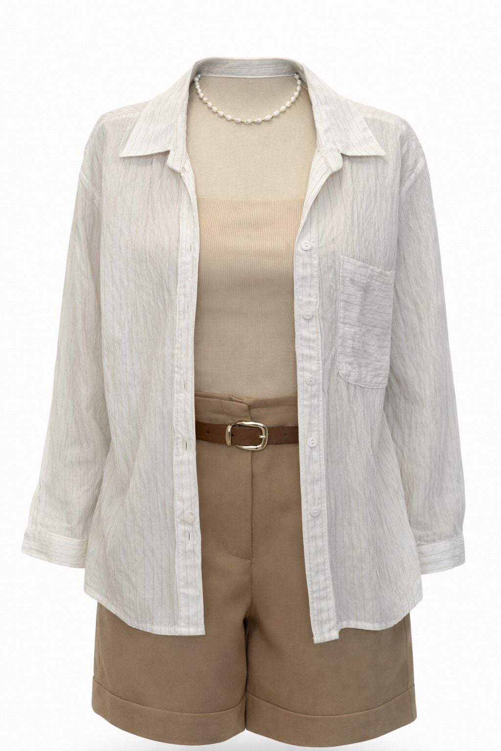Ekru Kahve İnce Çizgili Hafif Transparan Uzun Salaş Gömlek