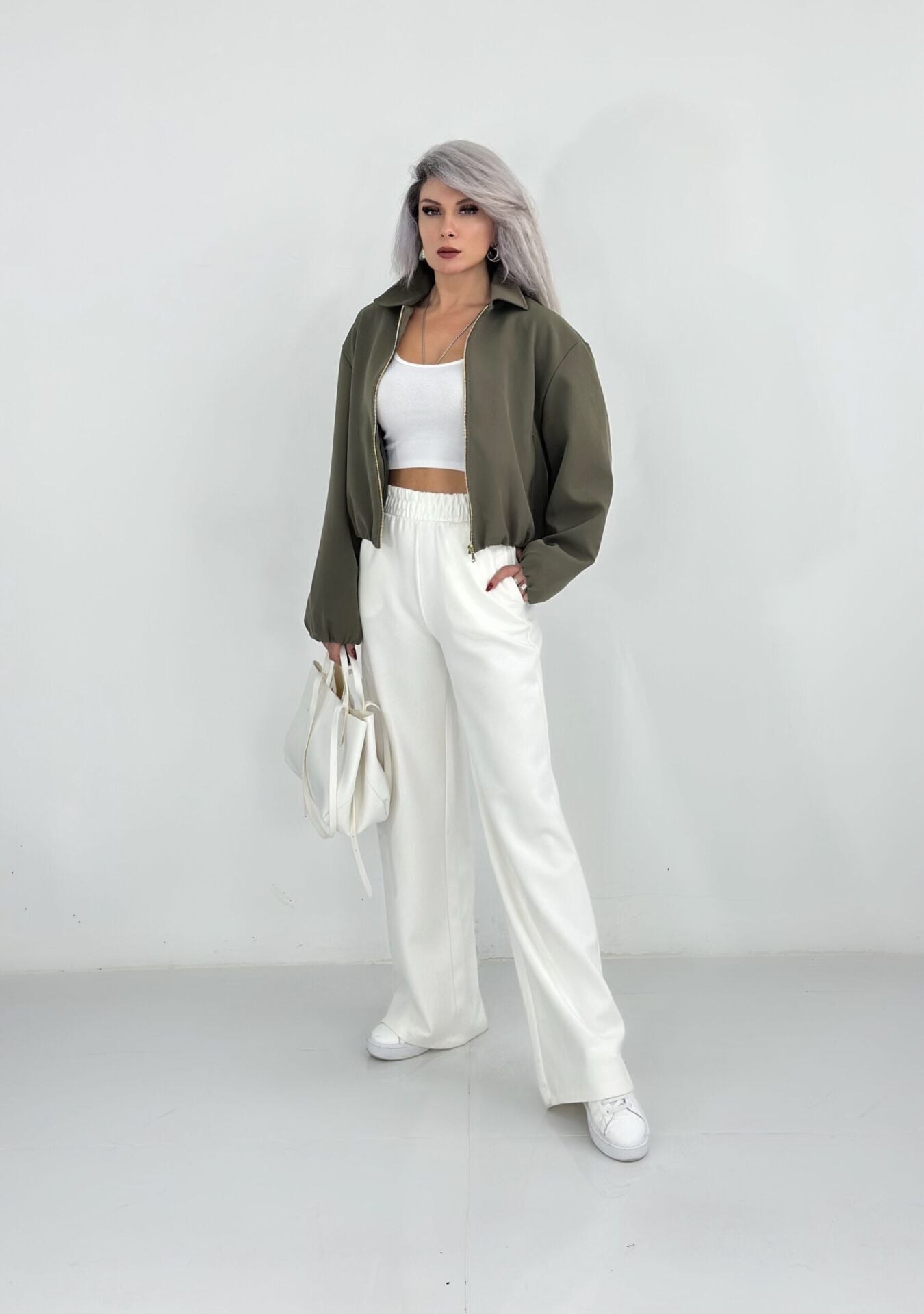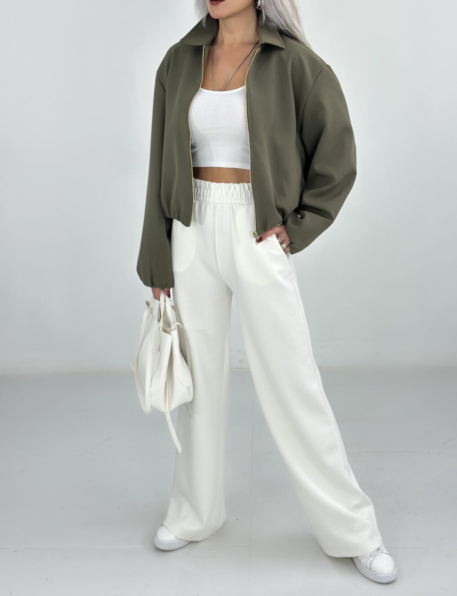 Haki Yeşil Krep Kumaş Bomber Ceket