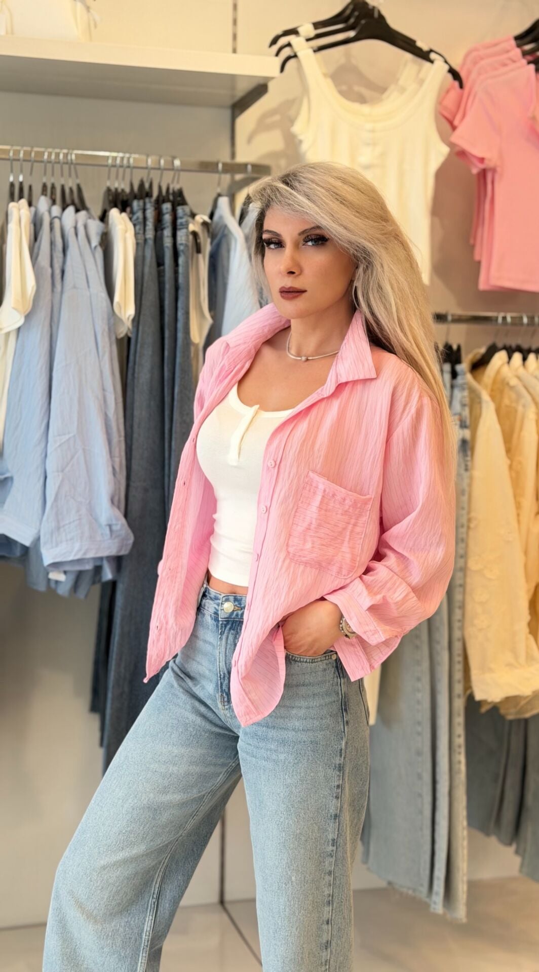 Sezonun en trend parçalarından biri olan pembe oversize gömlek, rahat kalıbı ve hafif dokusuyla günlük kombinlerin vazgeçilmezi. İster atlet üzerine açık şekilde, ister tek başına kullanarak farklı stiller oluşturabilirsiniz. Şıklık ve konforu bir arada sunar.