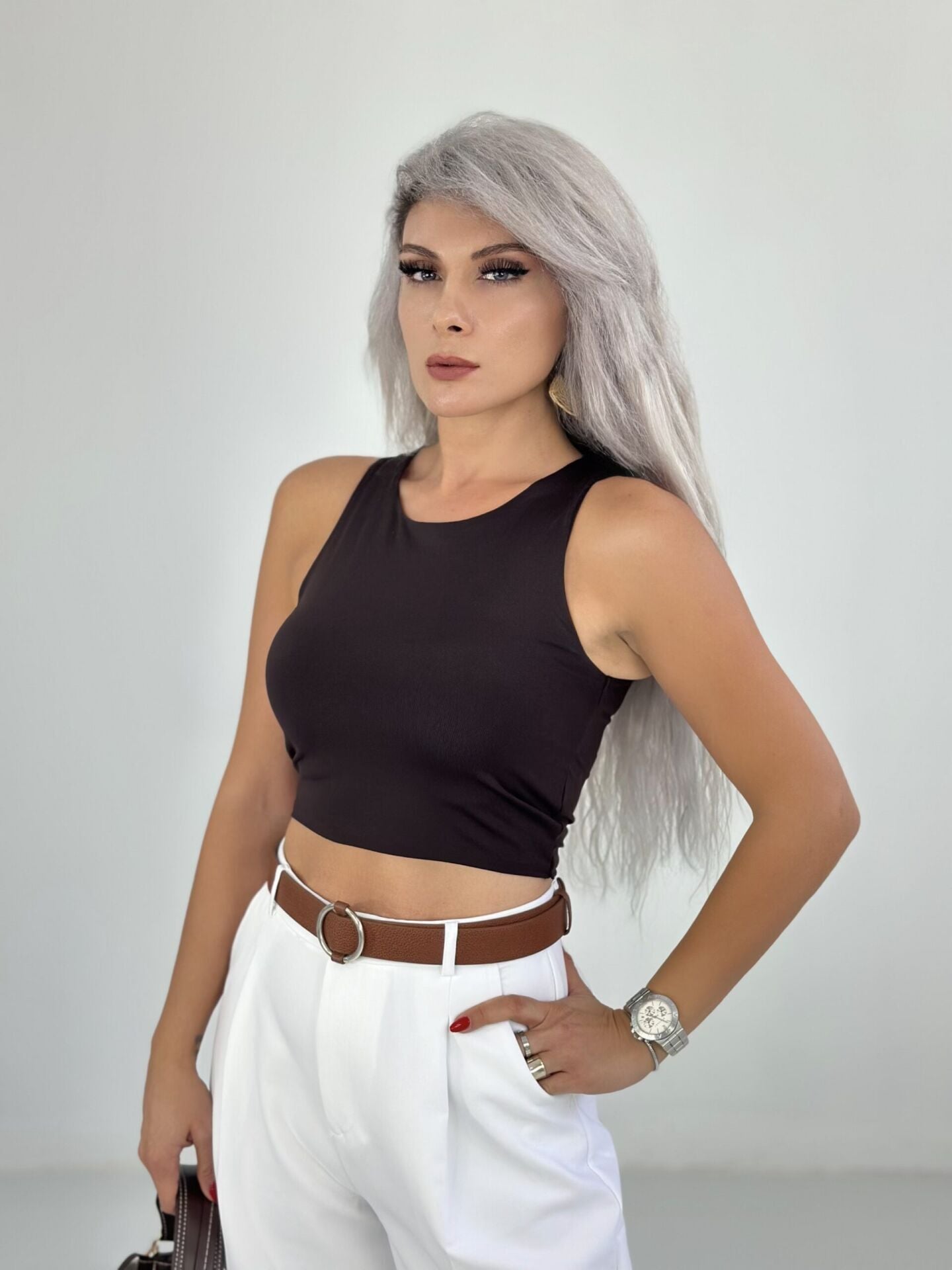 Kahve Dalgıç Kumaş Halter Yaka Crop Atlet SMALL