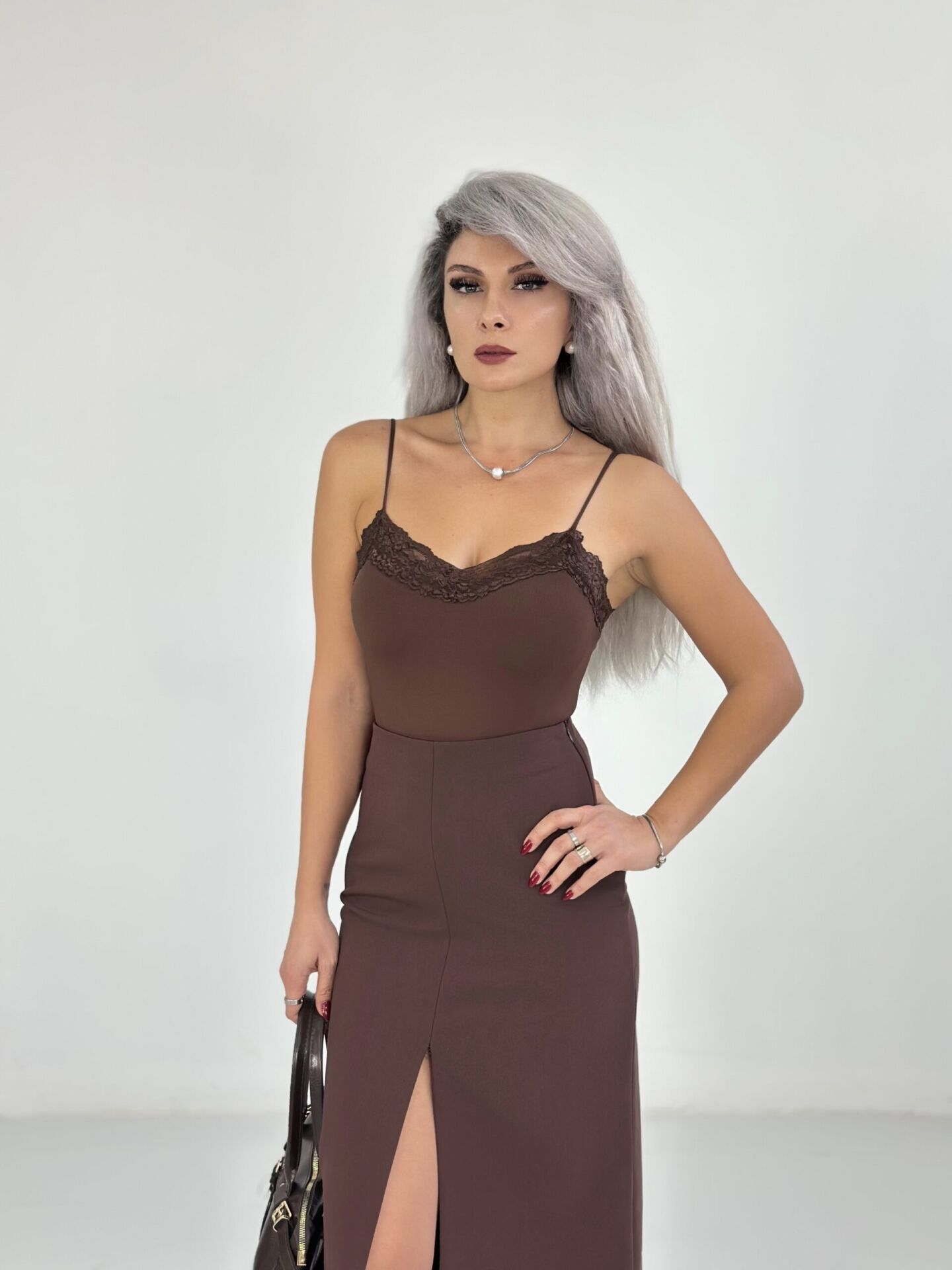Kahve Dantel Yaka İp Askılı Bodysuit
