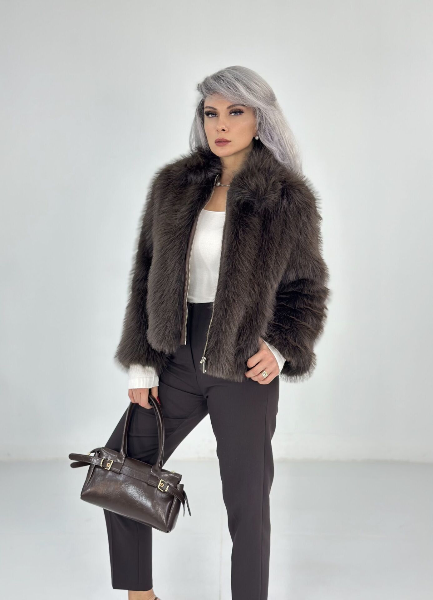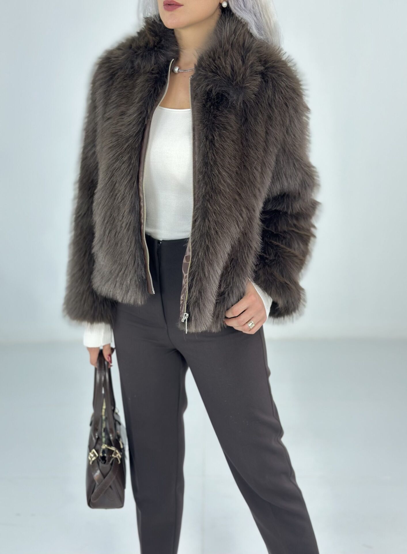 Kahve Fermuarlı Kısa Kürk Ceket