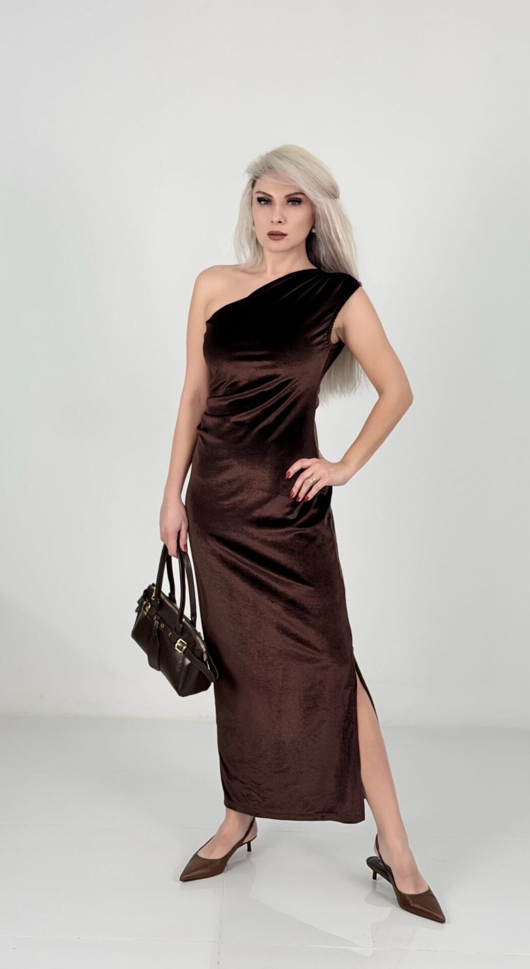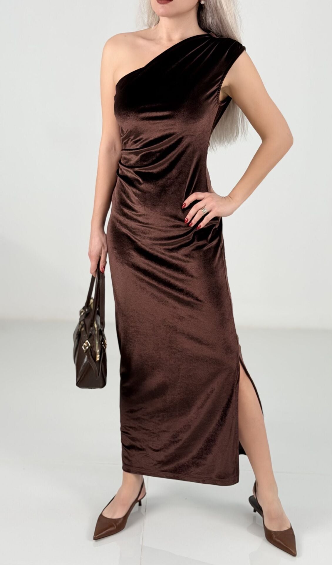 Kahve Kadife Tek Omuz Yan Yırtmaç Midi Elbise