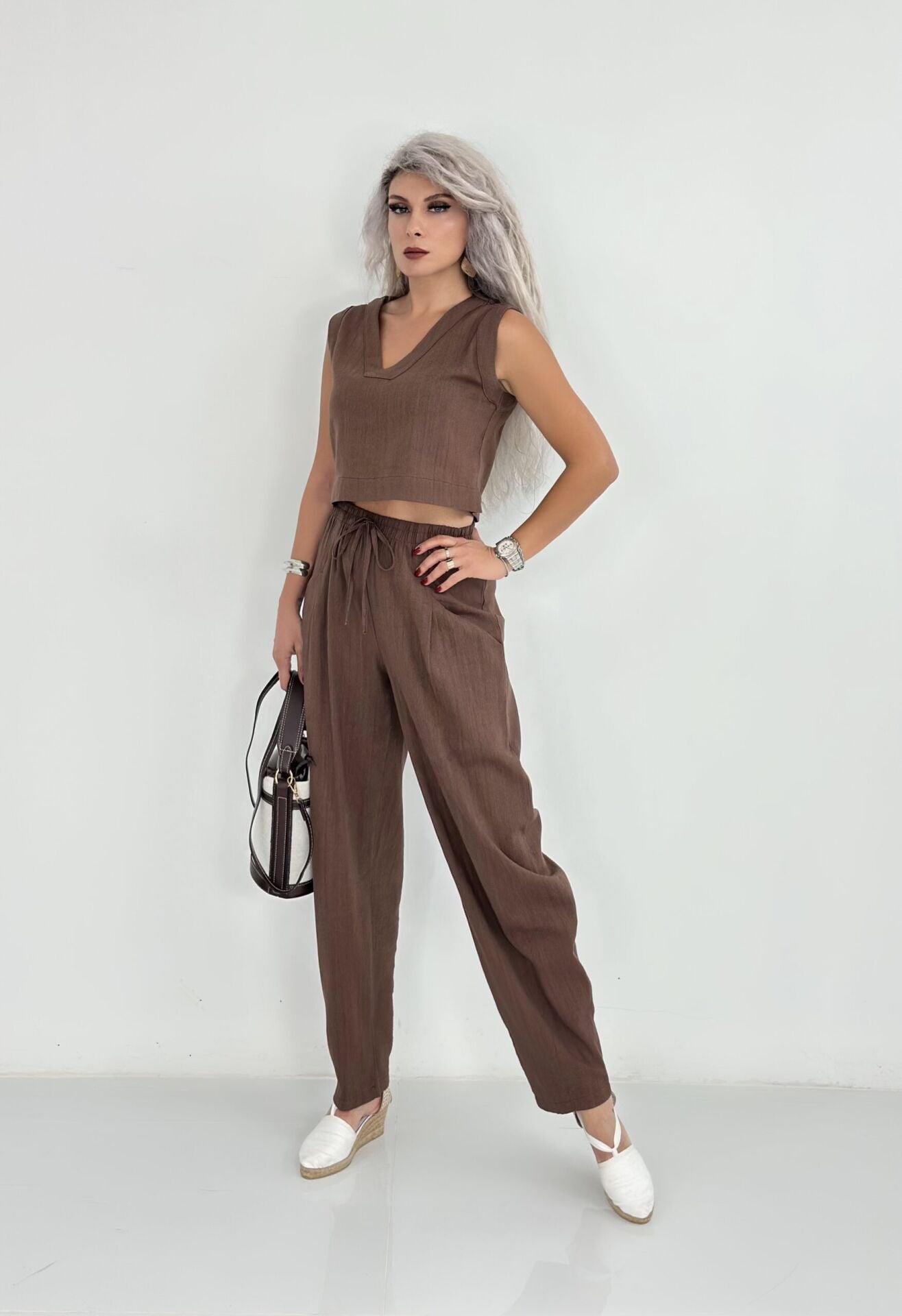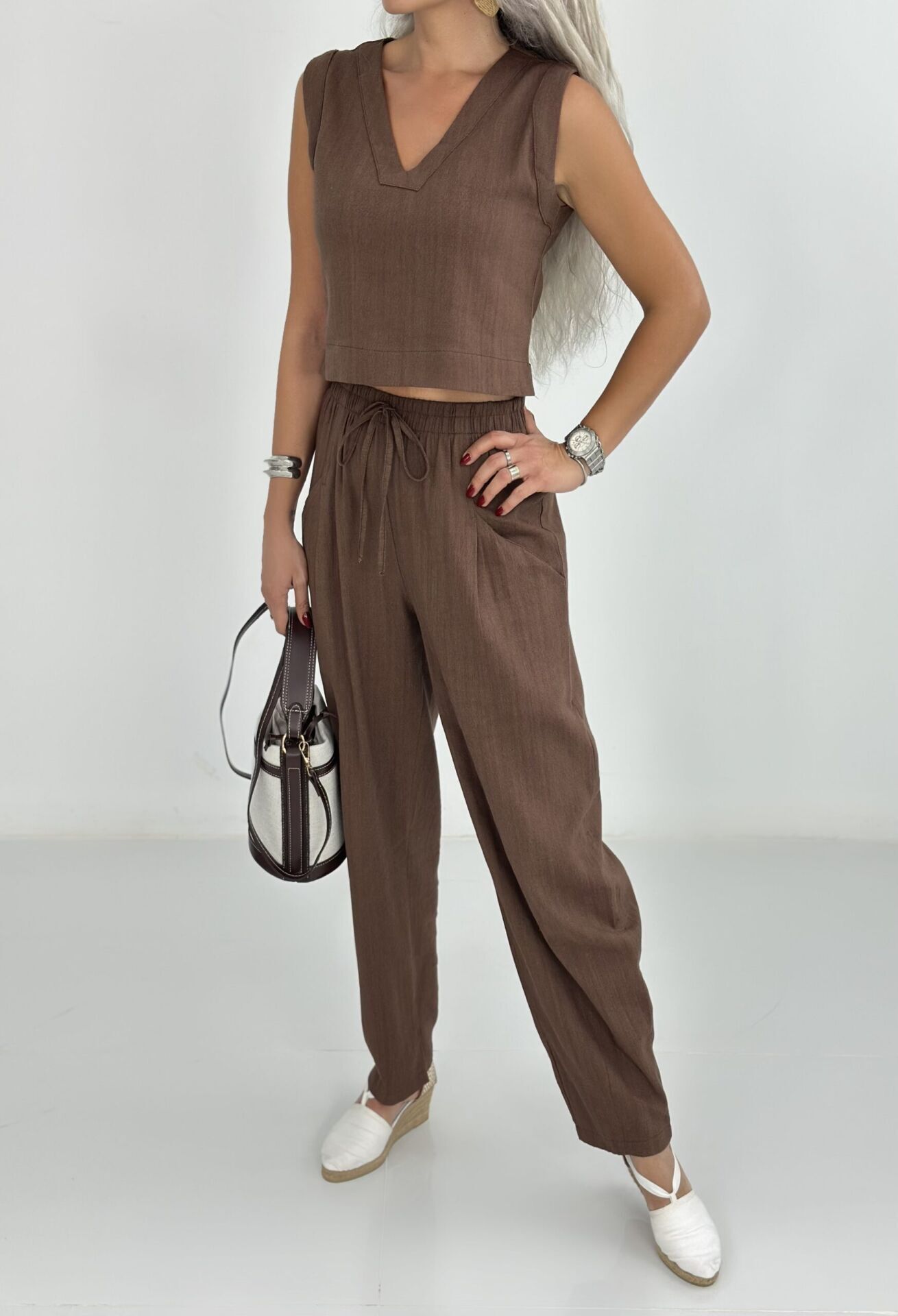 Kahve Kısa Kolsuz Keten Relax Takım