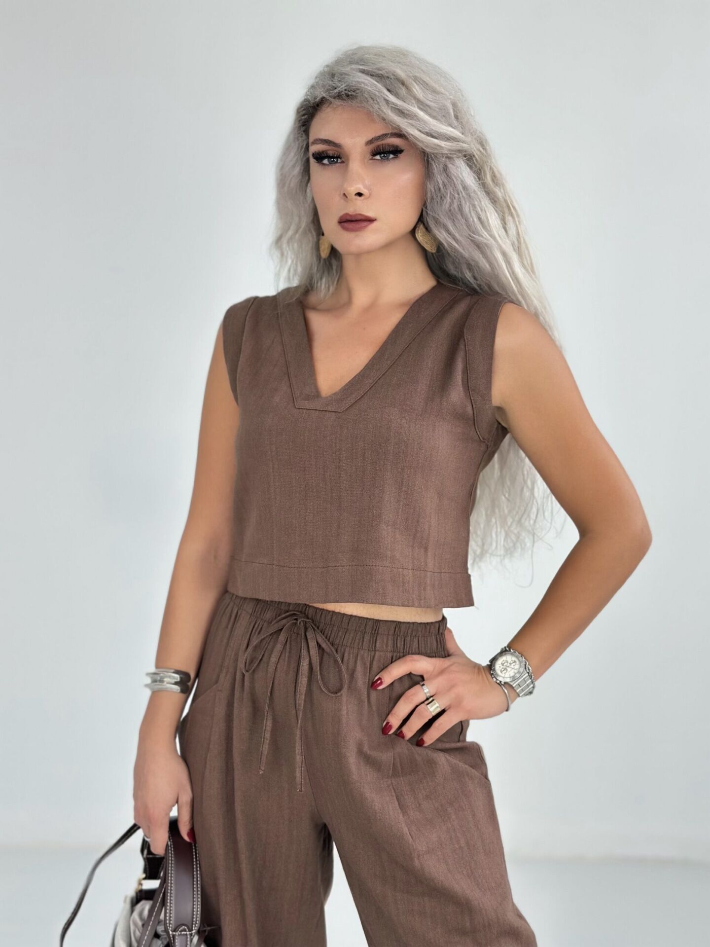 Kahve Kısa Kolsuz Keten Relax Takım LARGE