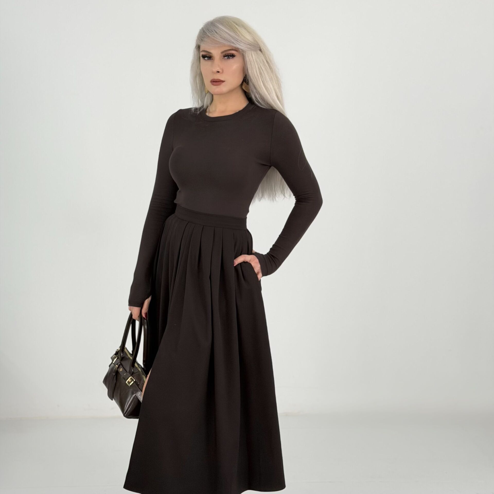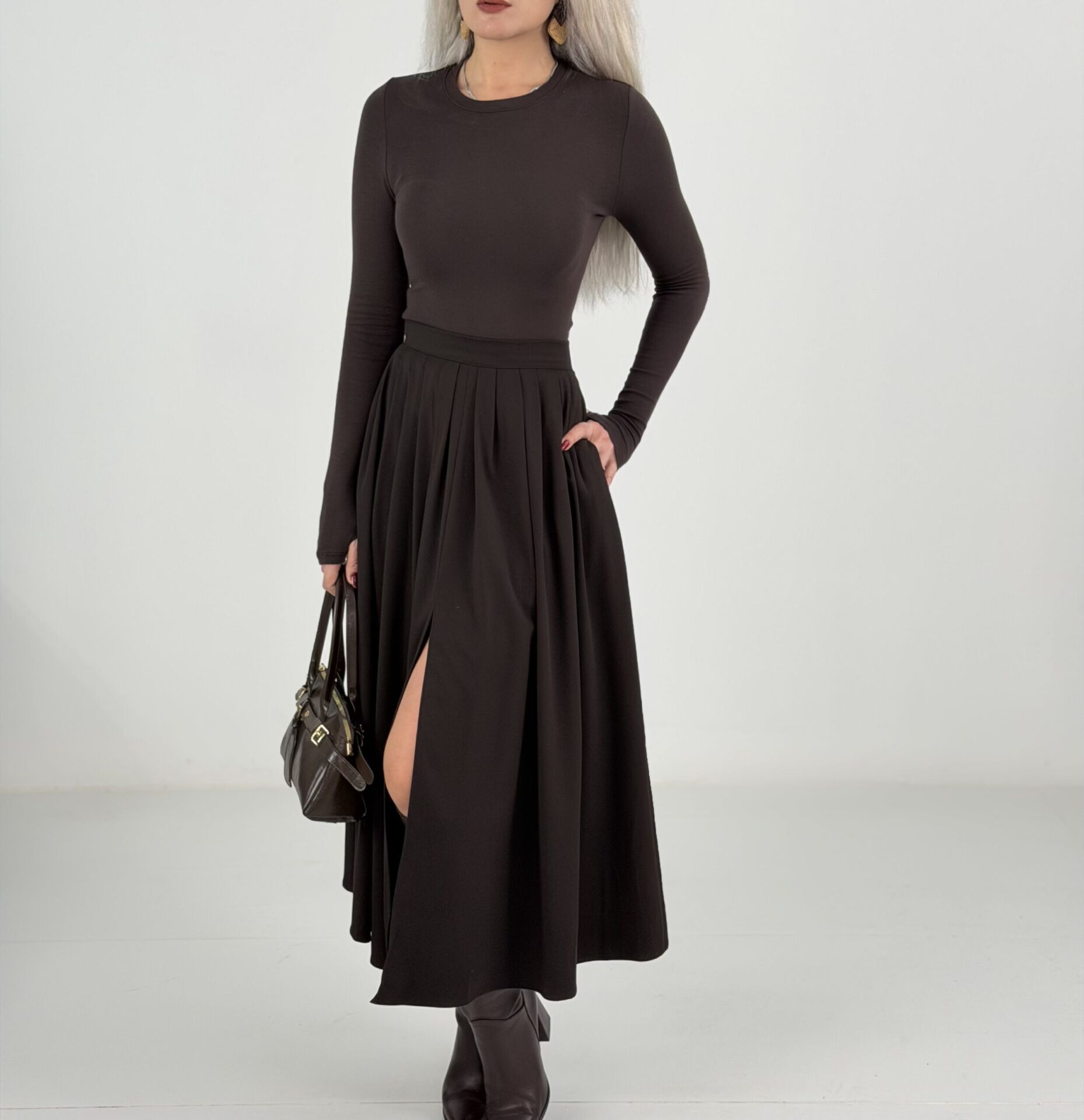 Kahve Ön Yırtmaç Detay Pileli Midi Etek