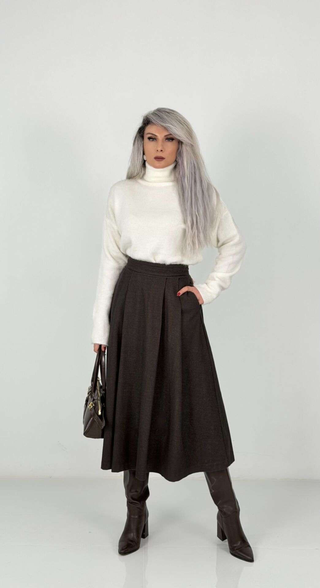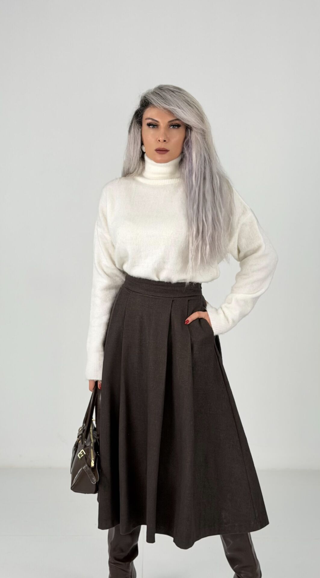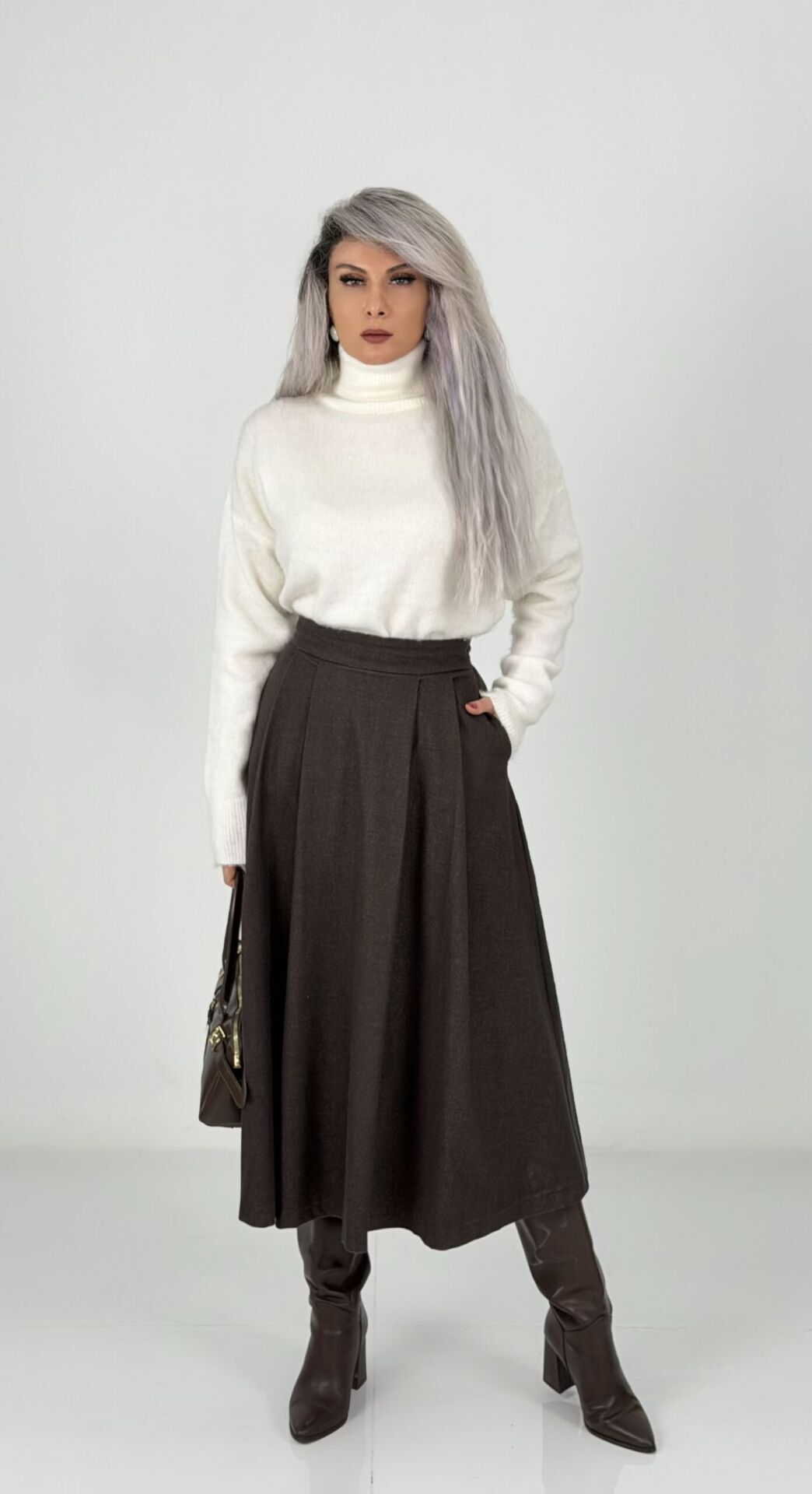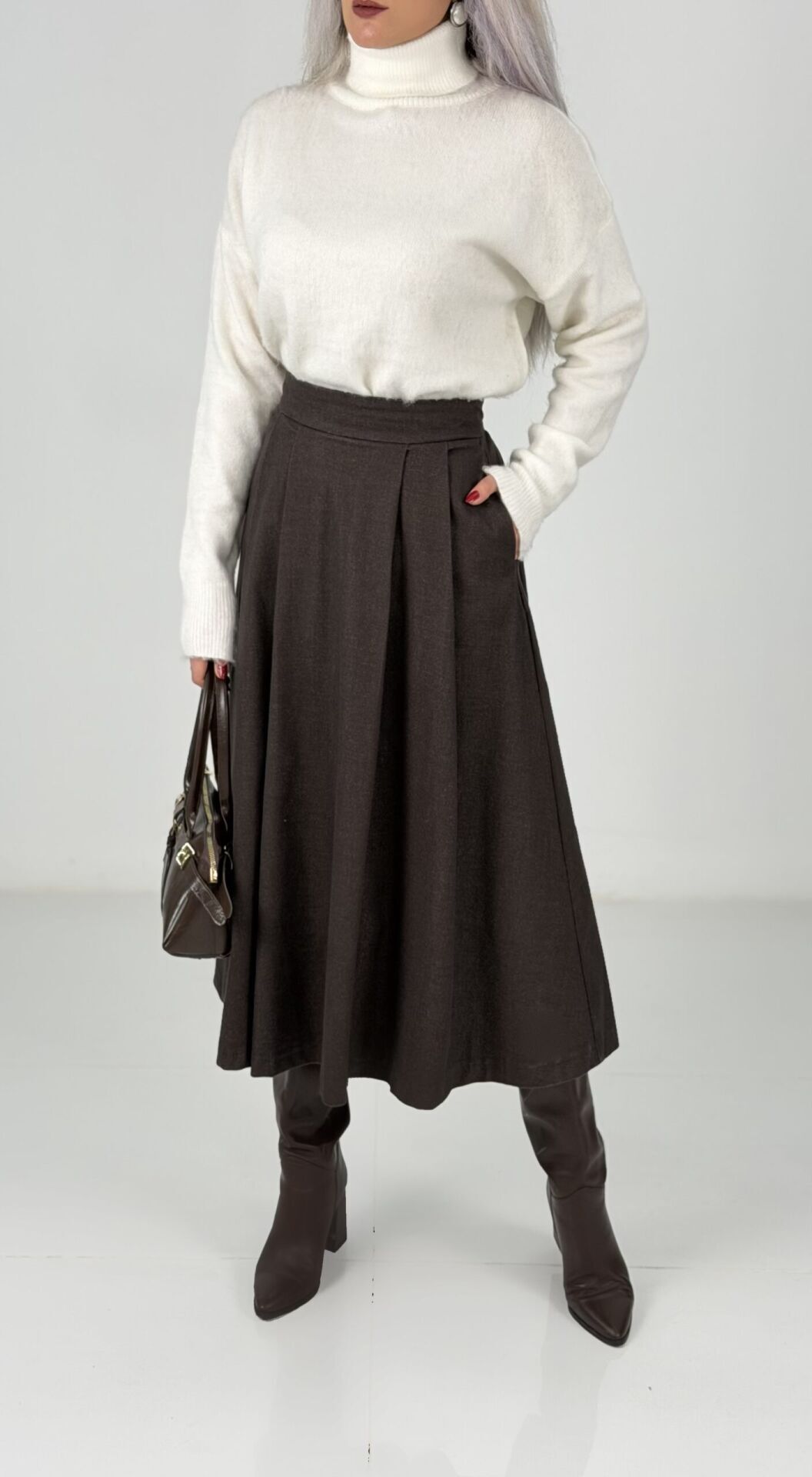 Kahve Yüksek Bel Kaşe Midi Etek