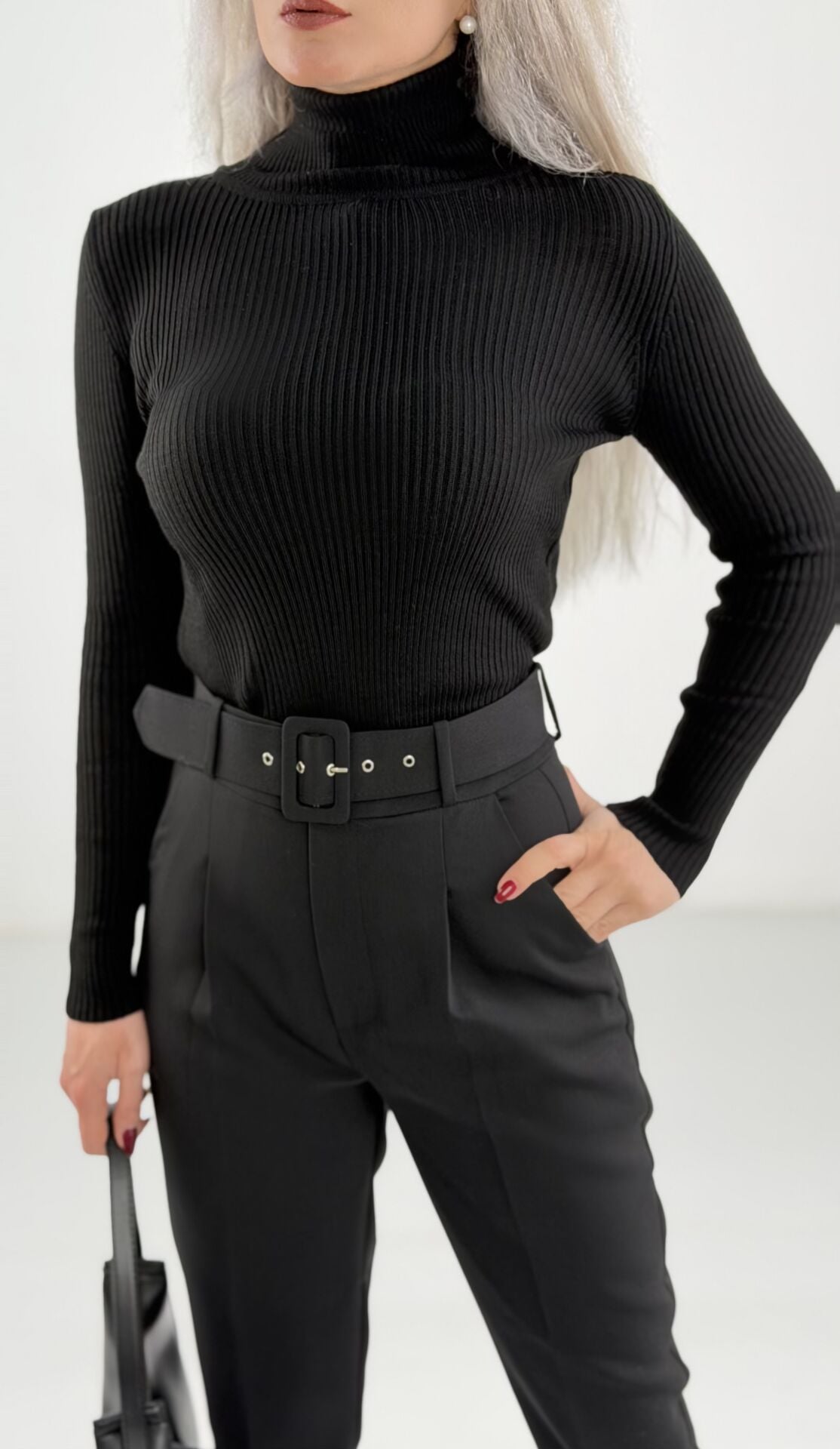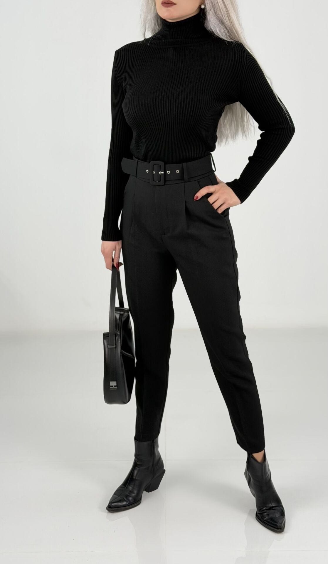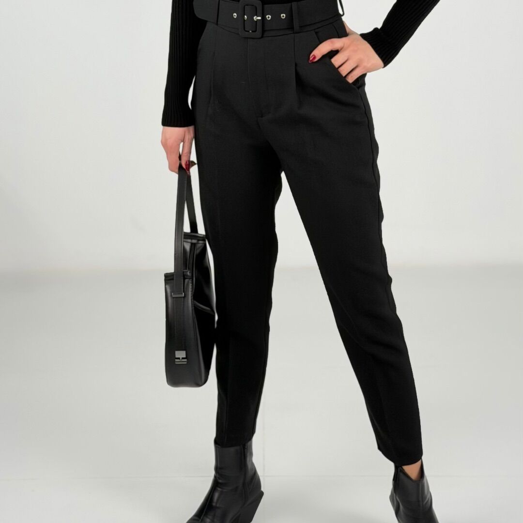 Yüksek bel kesimi ve kemer detayıyla beli vurgulayan, modern ve güçlü bir siluet sunar.