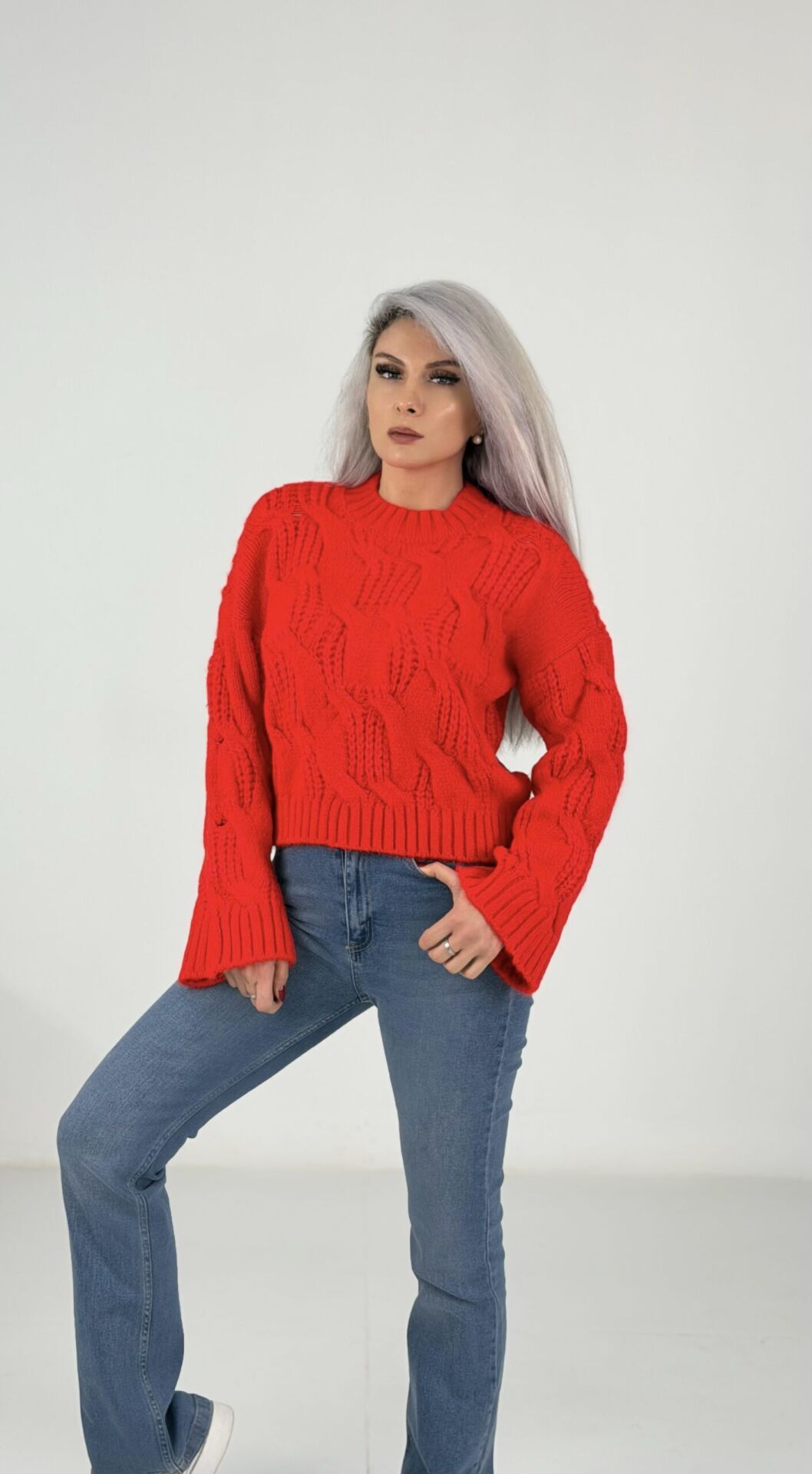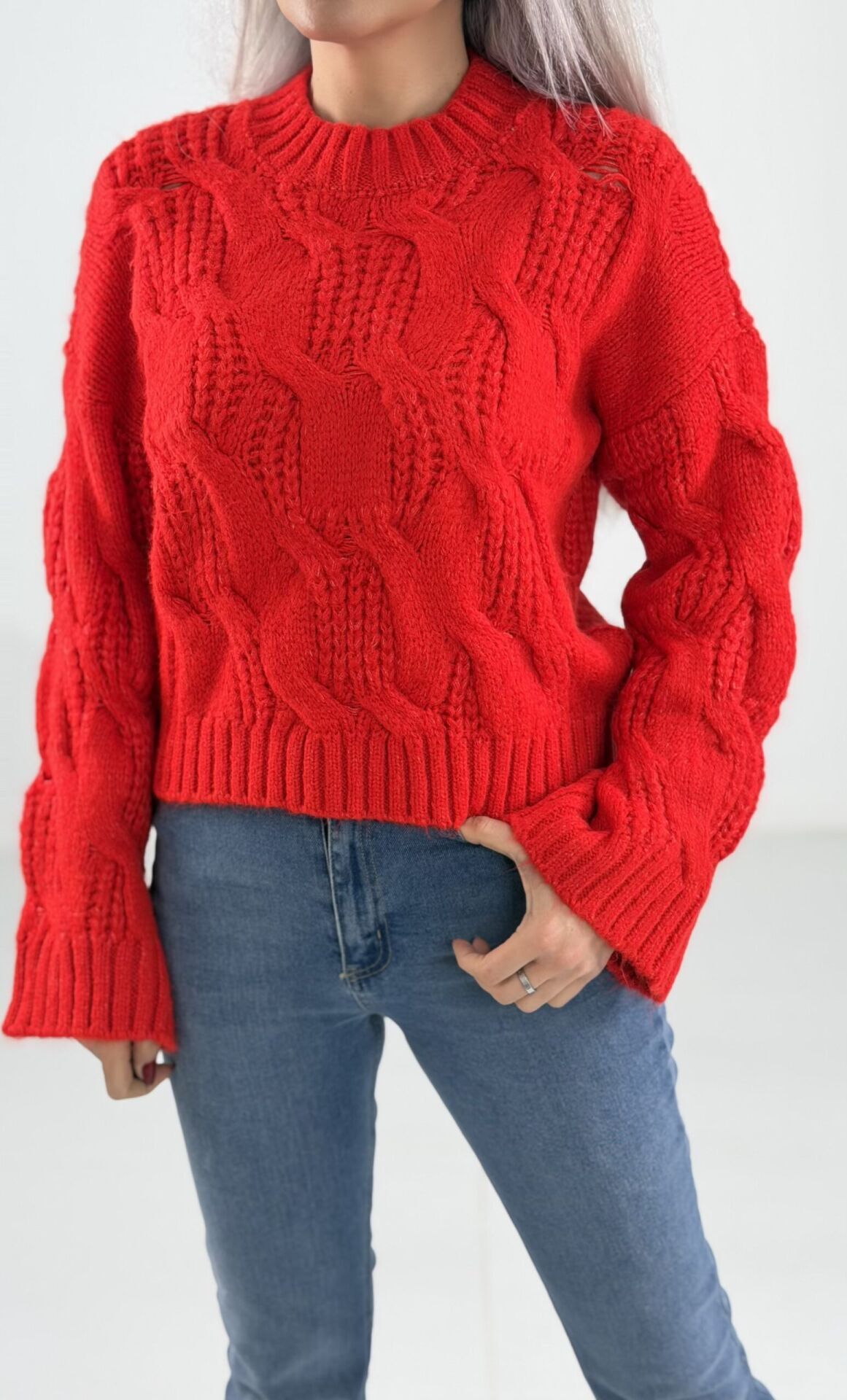 Kırmızı Saç Örgü Desenli Triko Kazak