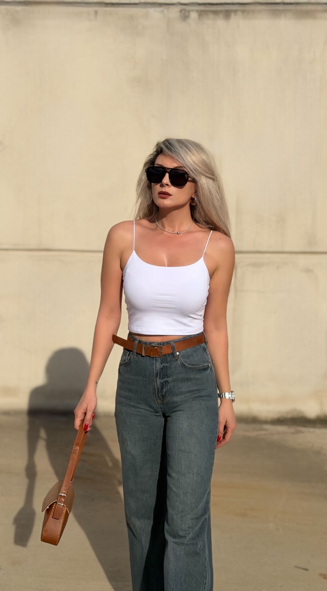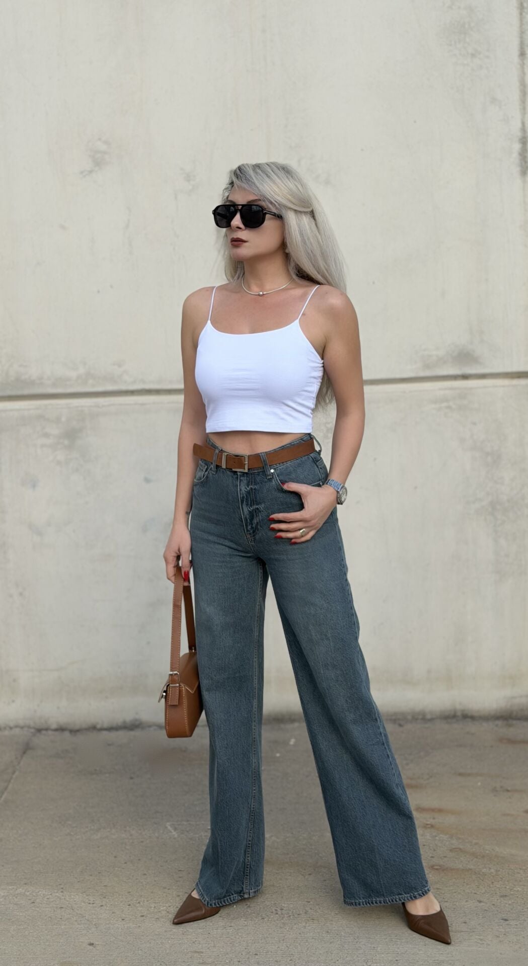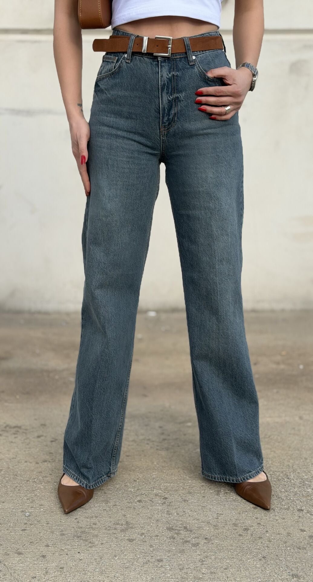 Koyu Yıkamalı Kemerli Yüksek Bel Likrasız Palazzo Jean Pantolon
