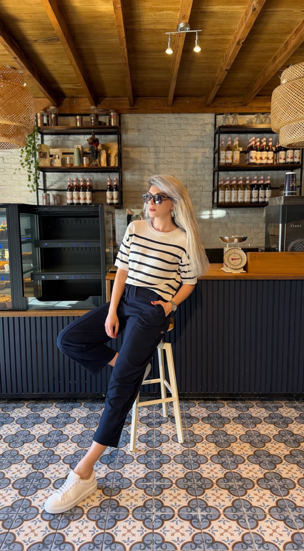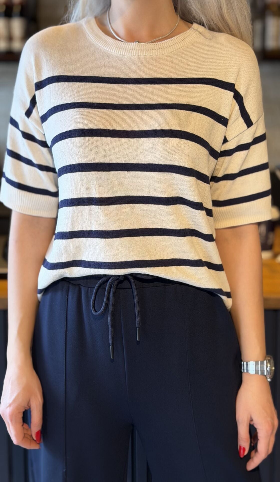 Krem Çizgili Kısa Kol Triko Bluz