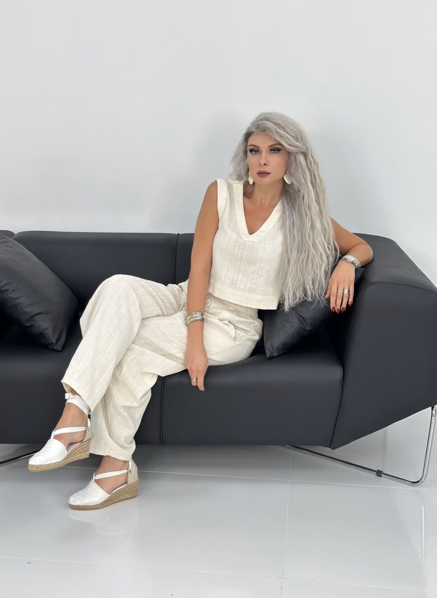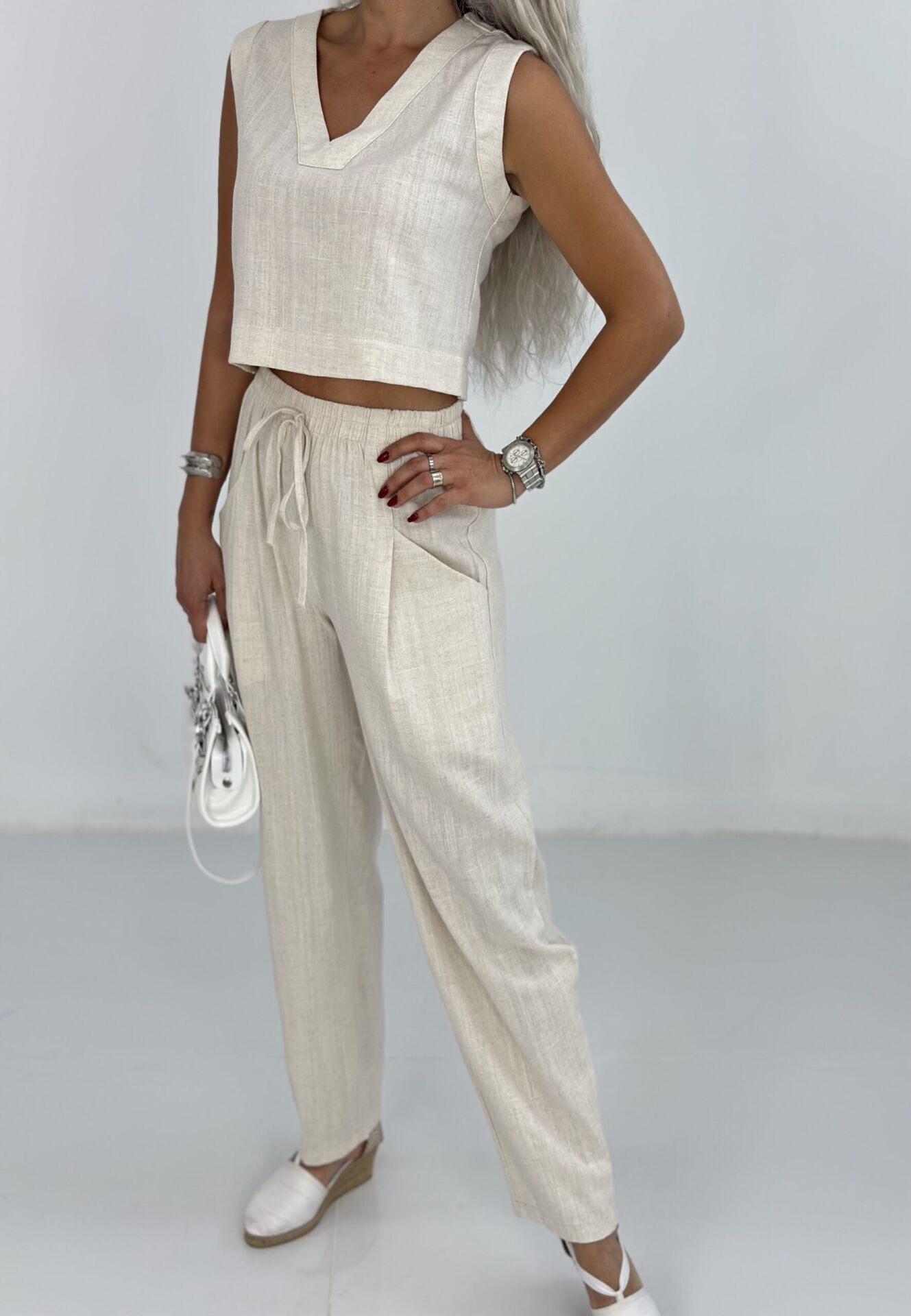 Krem Kısa Kolsuz Keten Relax Takım SMALL