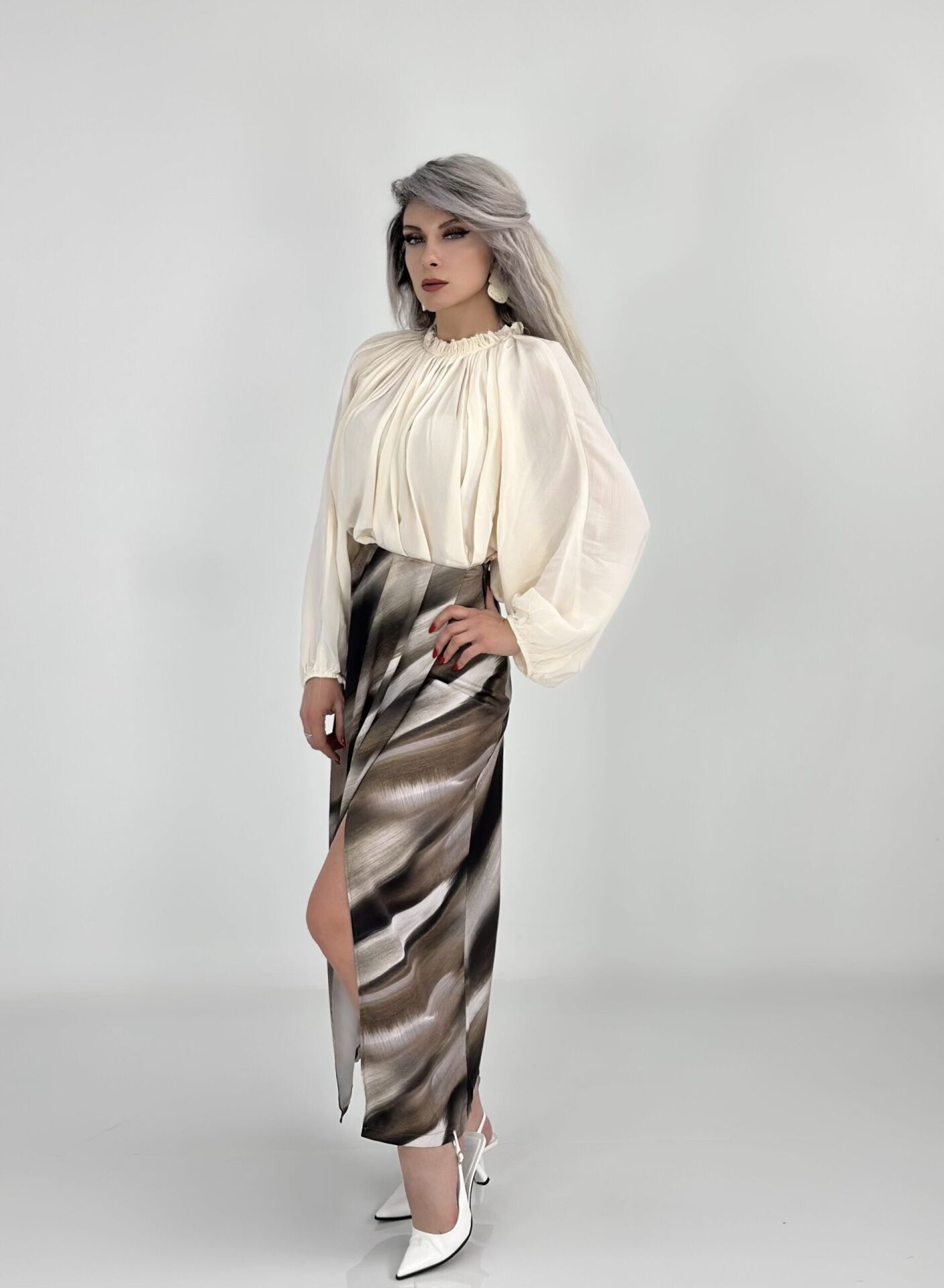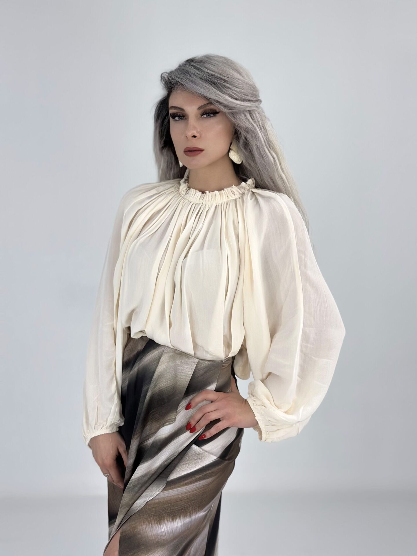 Krem Yaka Büzgülü Fırfırlı Bluz