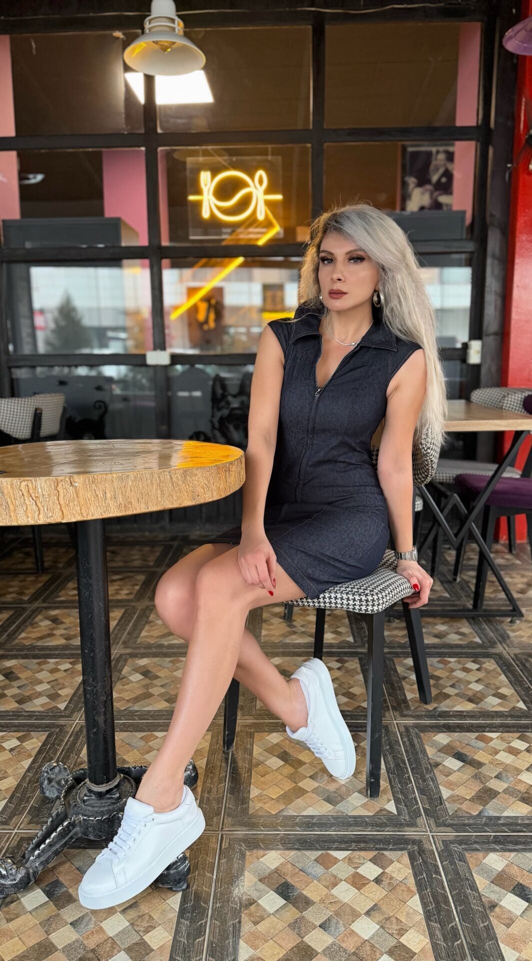 Lacivert Denim Likralı Polo Yaka Mini Elbise