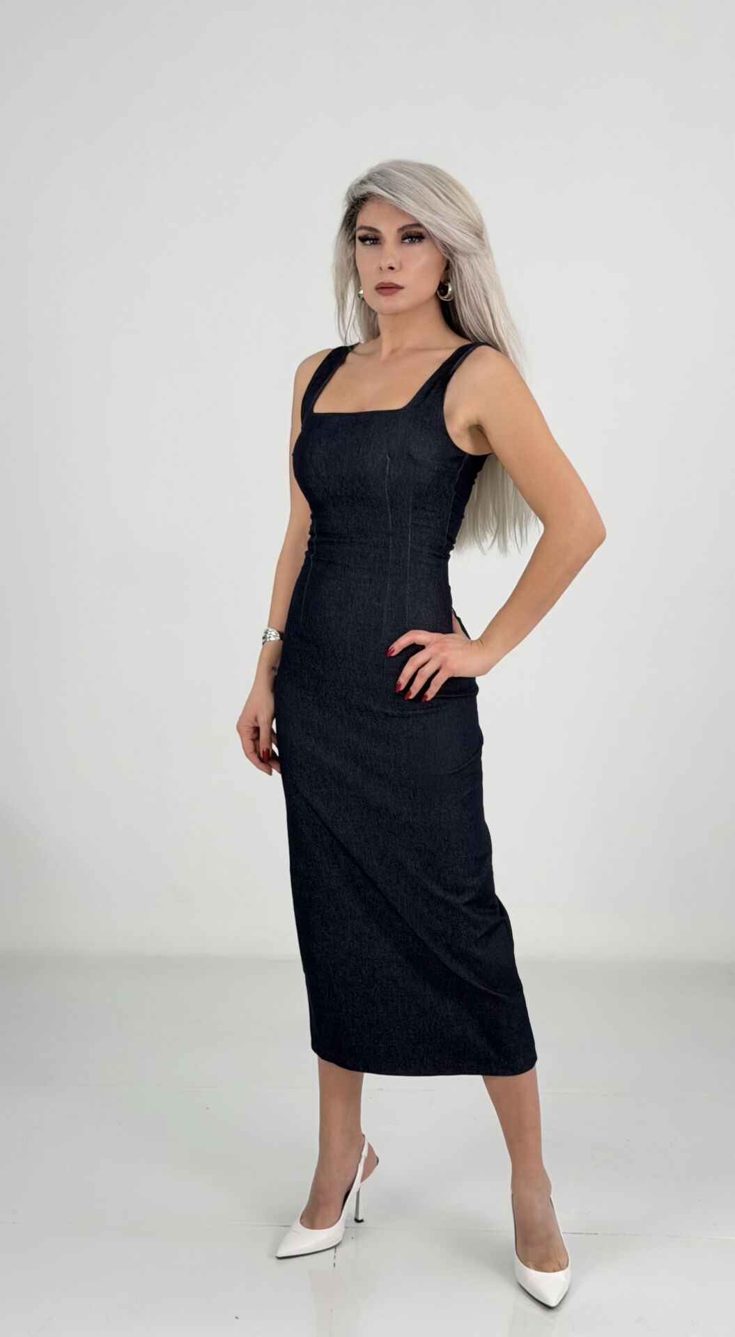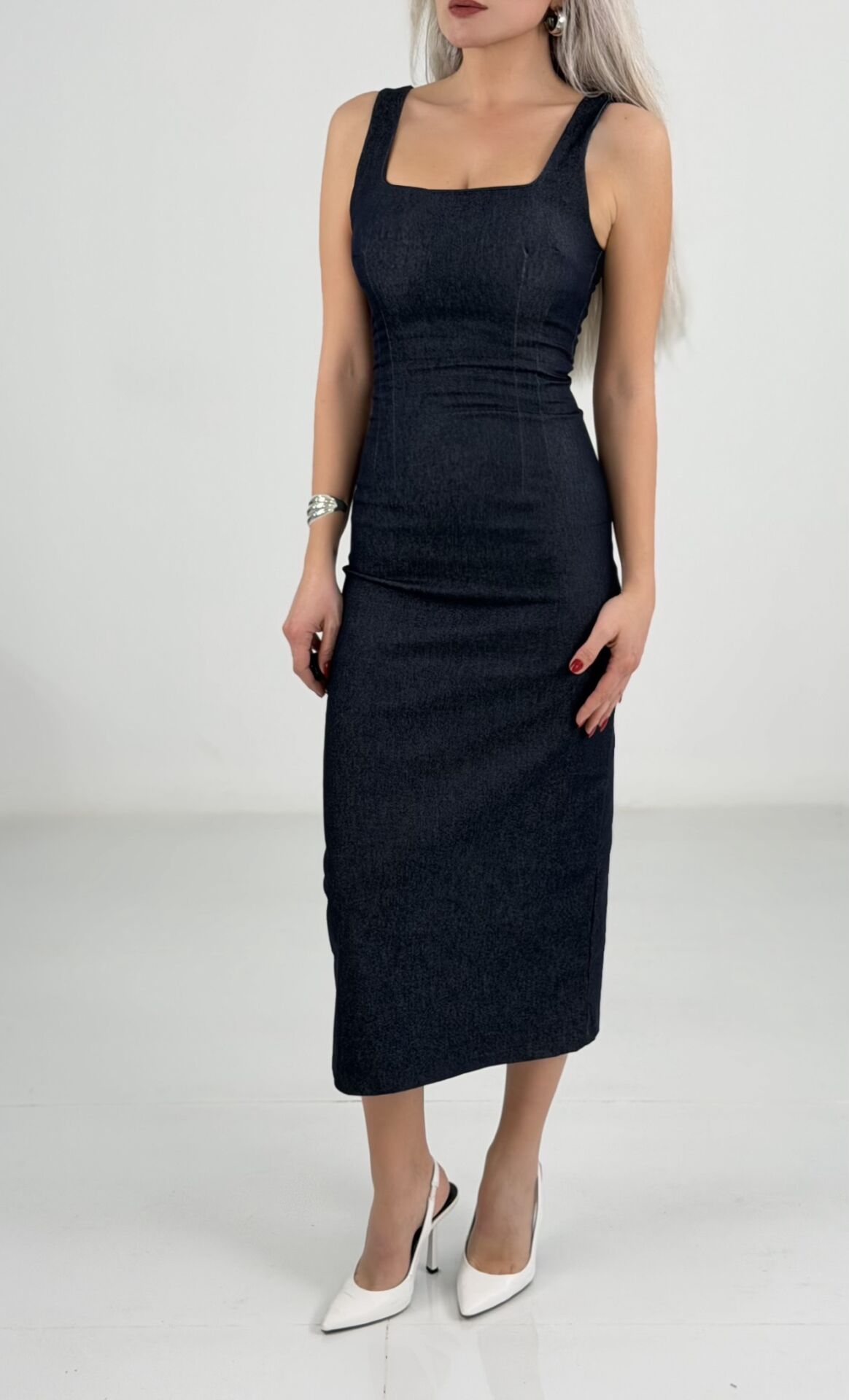 Lacivert Kare Yaka Kolsuz İnce Denim Likralı Midi Elbise