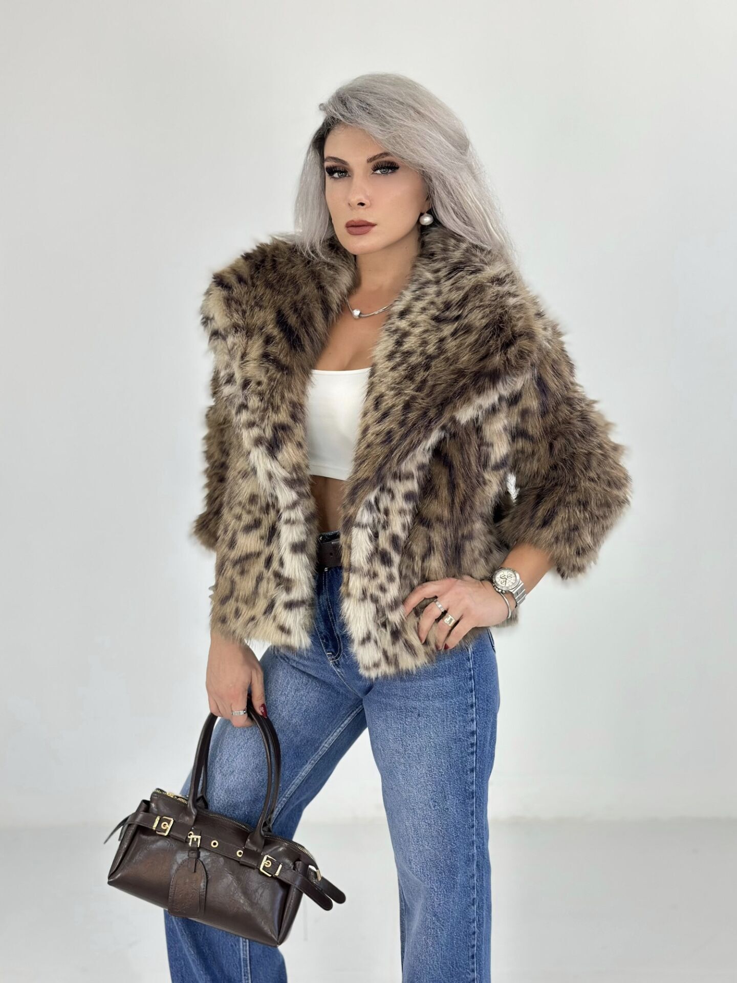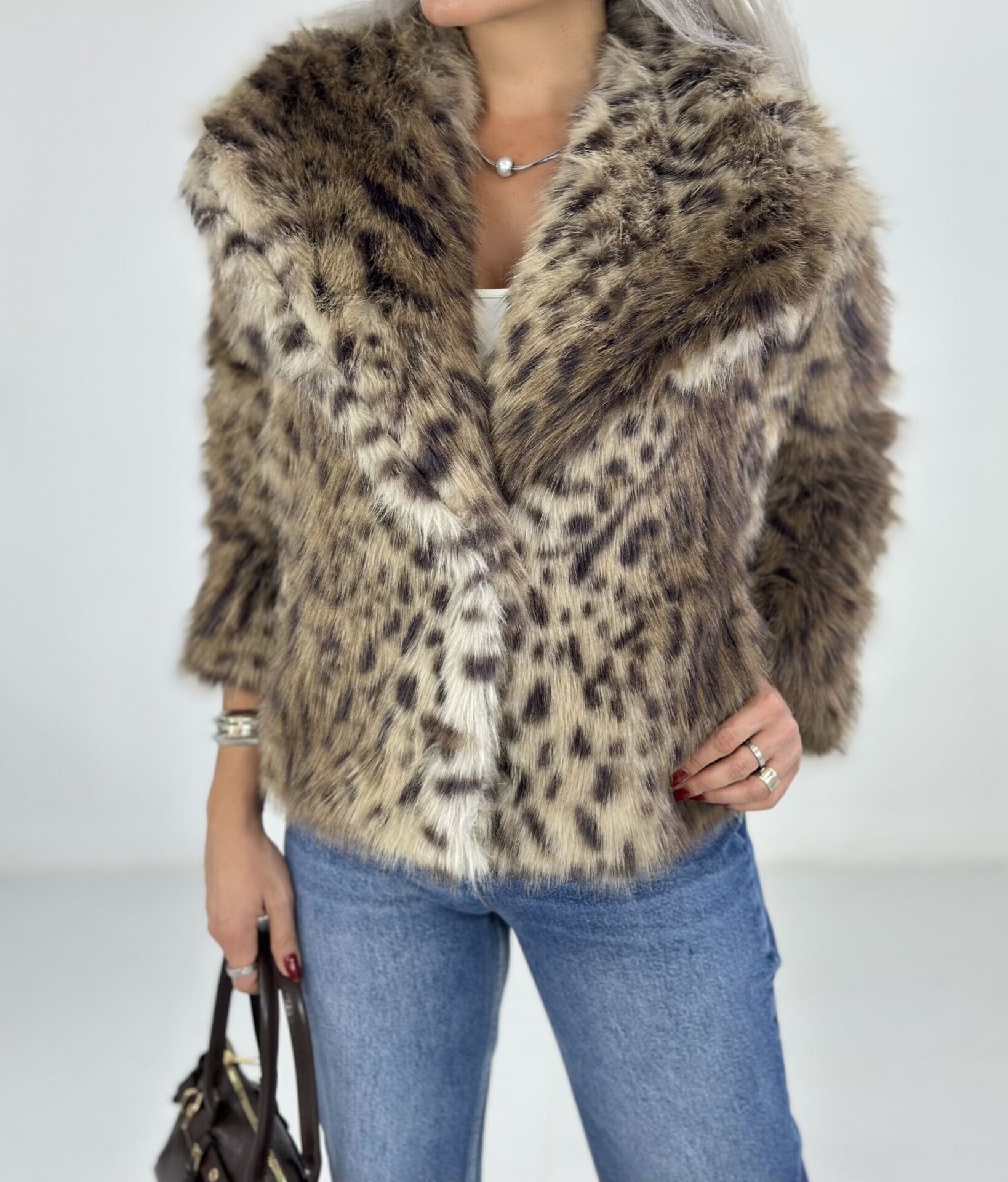 Leopar Desen Geniş Yaka Kürk Ceket