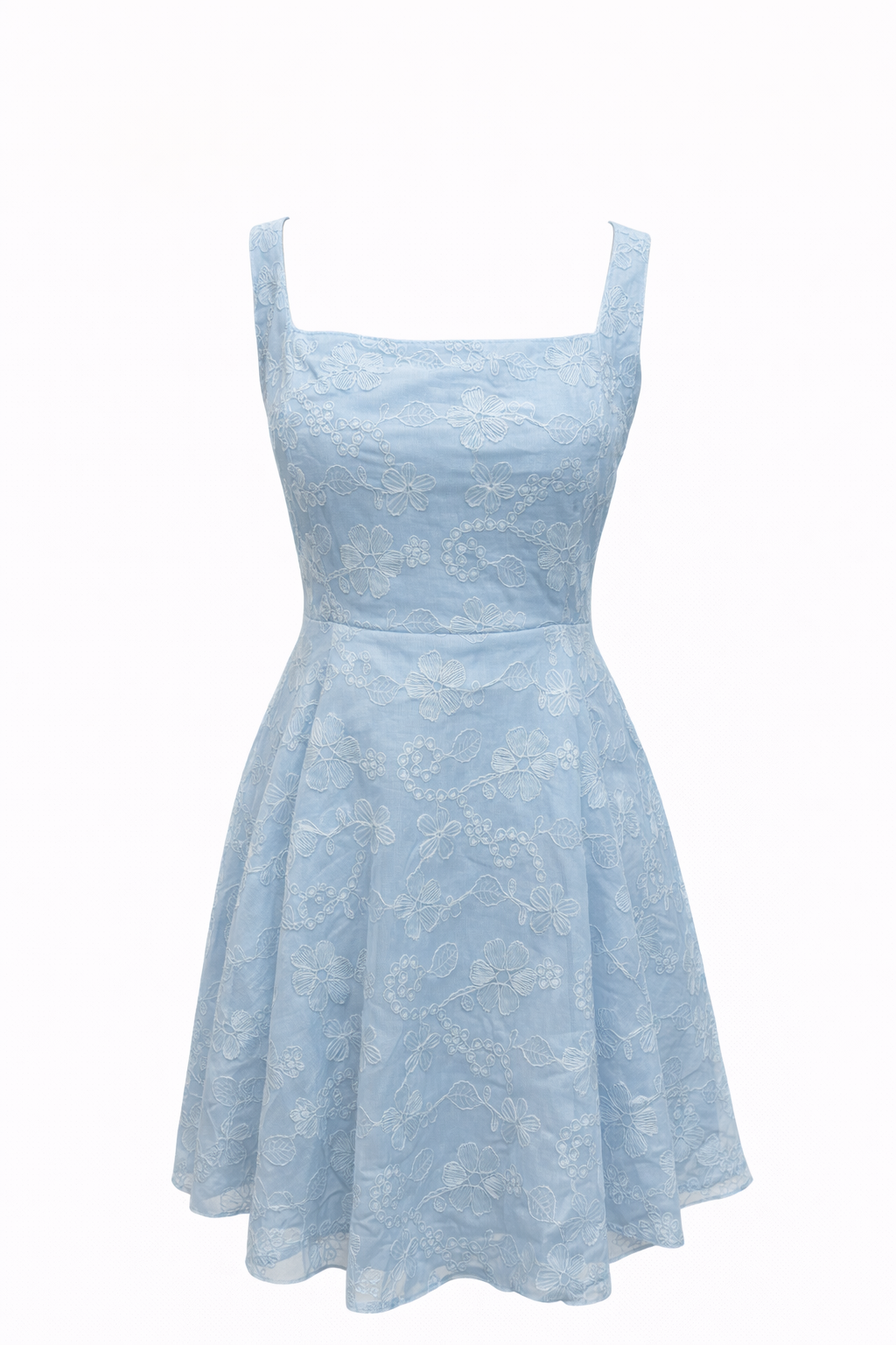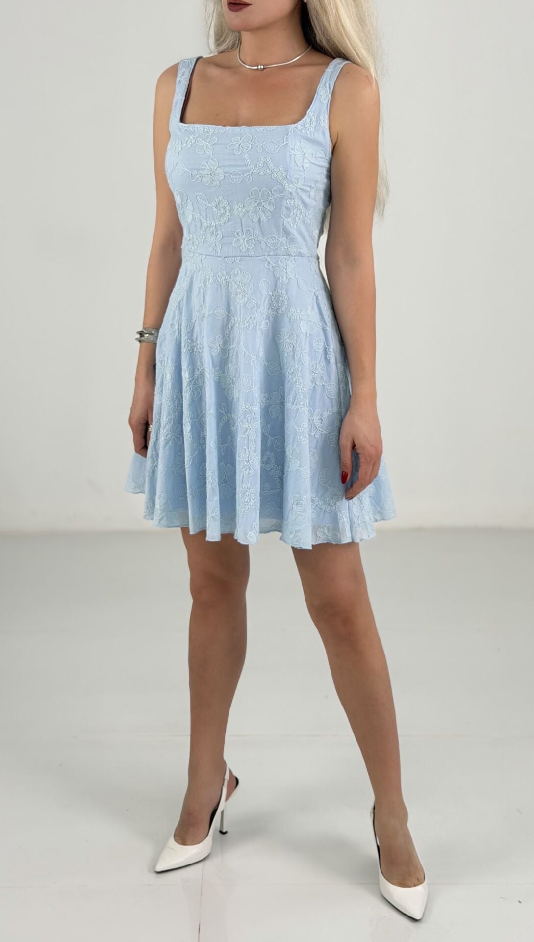 Mavi Güpür Çiçek Detay Askılı Balon Mini Elbise