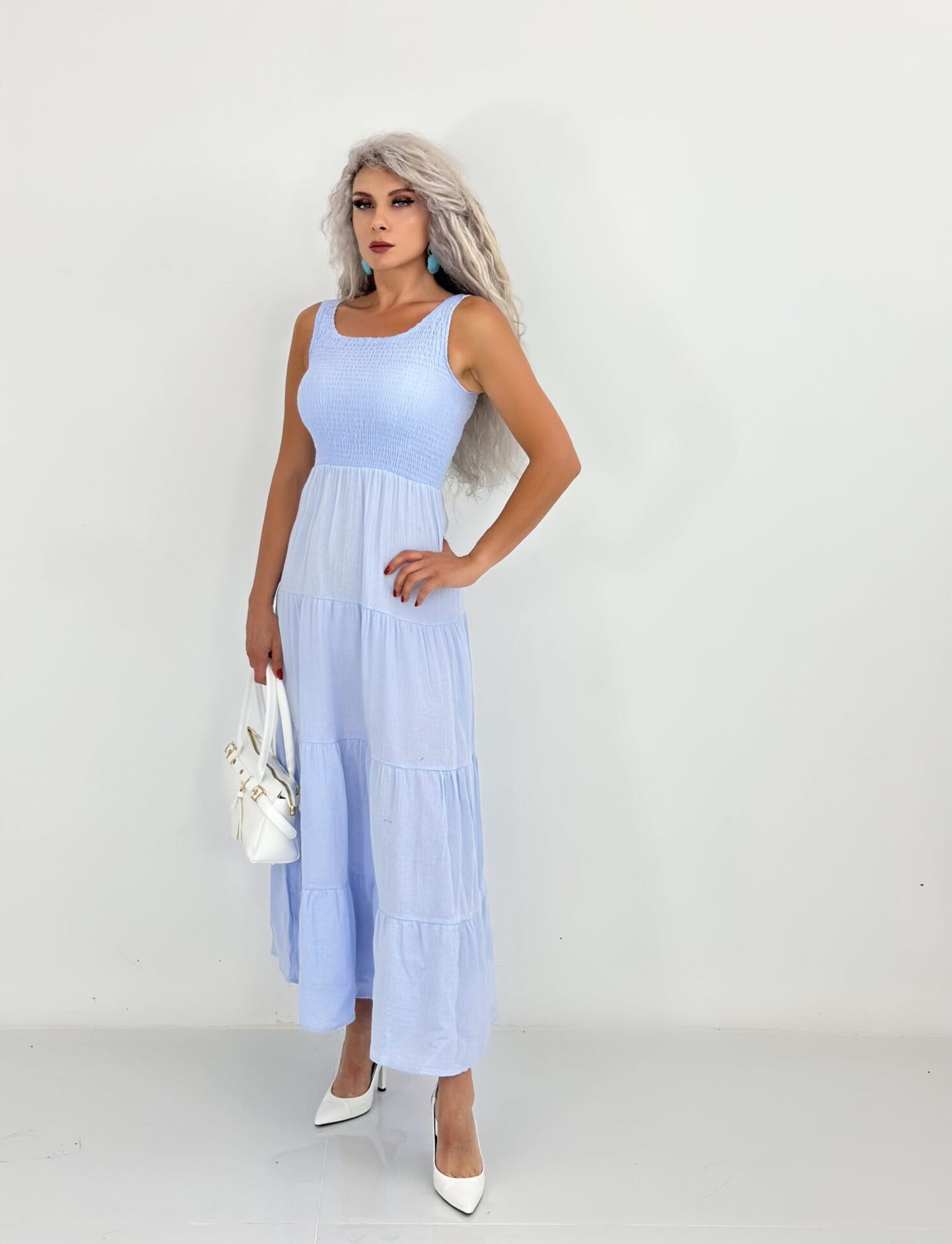 Mavi Kolsuz Müslin Kumaş Uzun Elbise LARGE