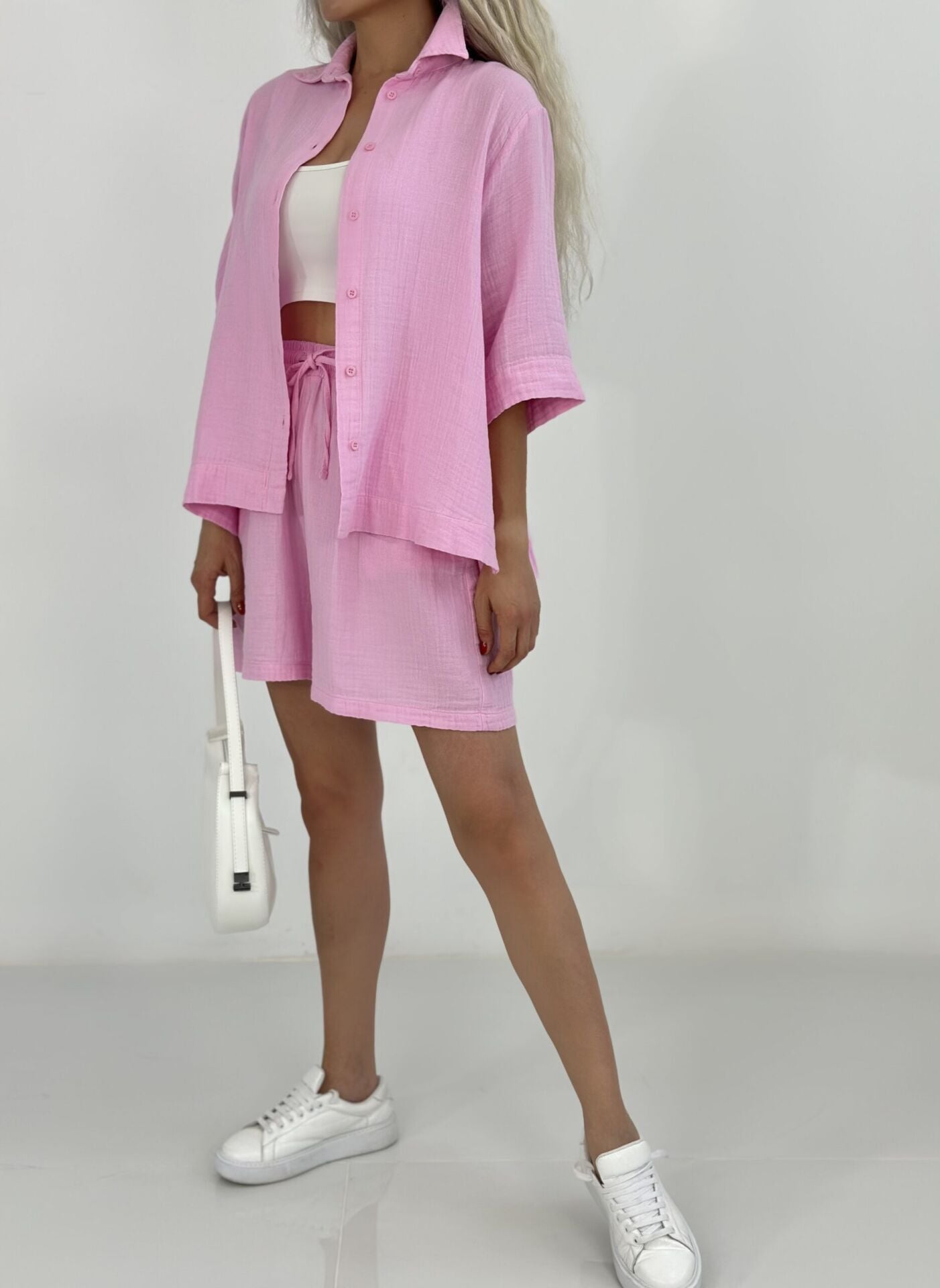 Pembe Müslin Kumaş Gömlek Şort Takım