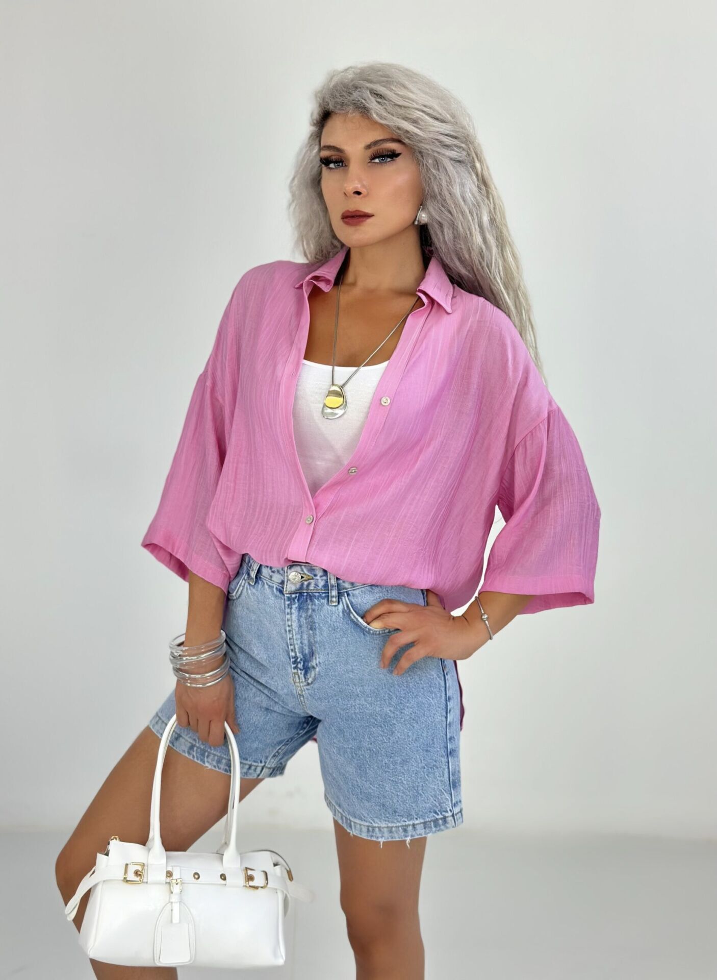 Pembe Yarım Kol Yarı Transparan Gömlek