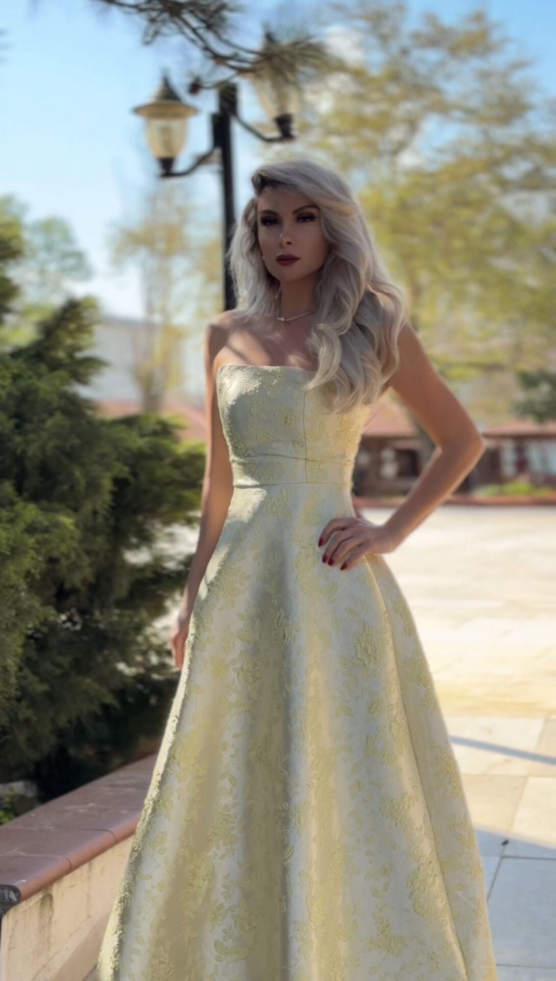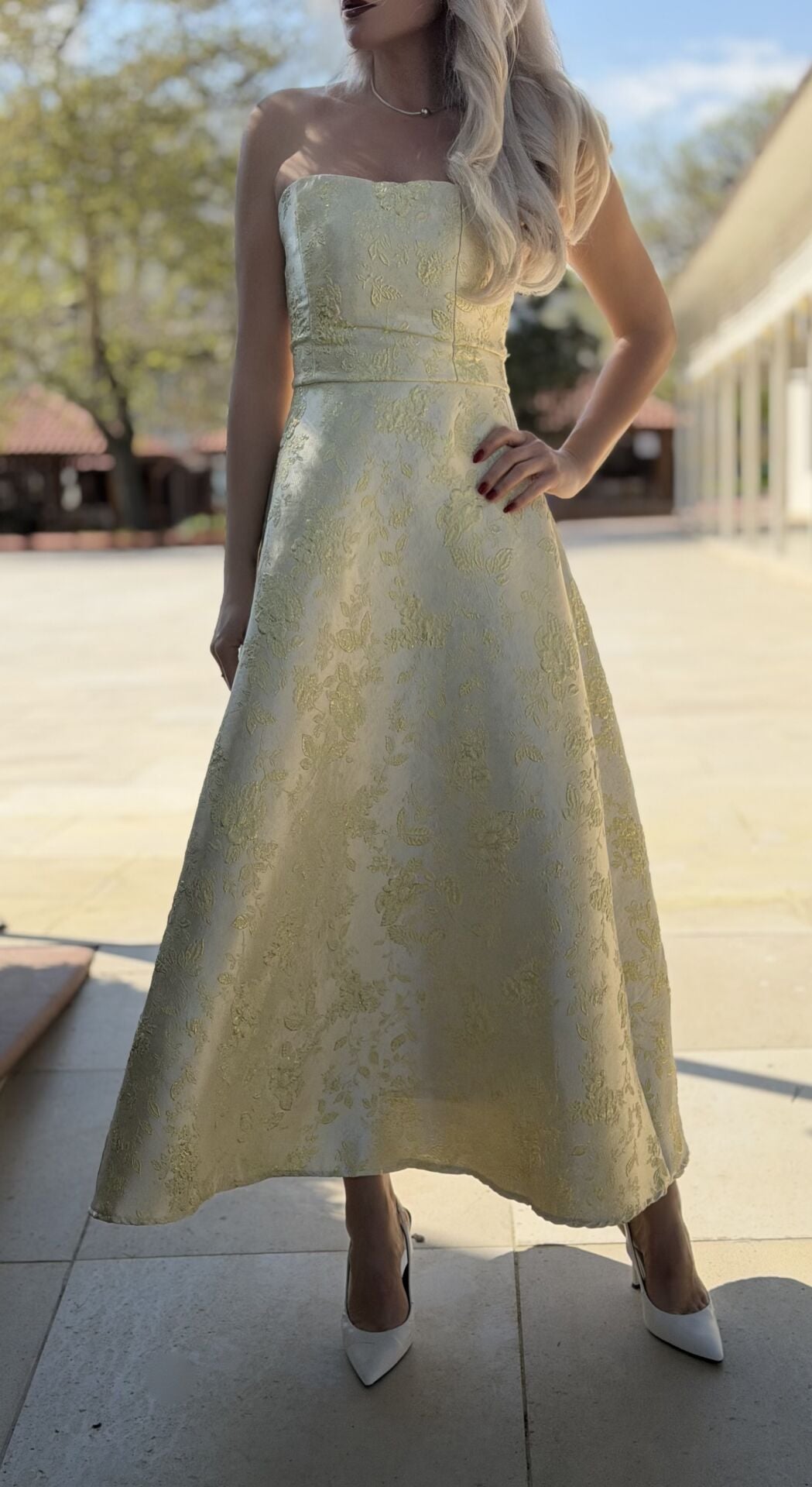 Sarı Straplez Çiçek İşlemeli Detay Midi Balon Elbise