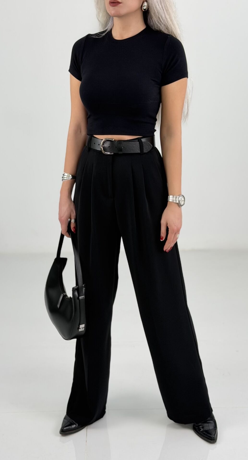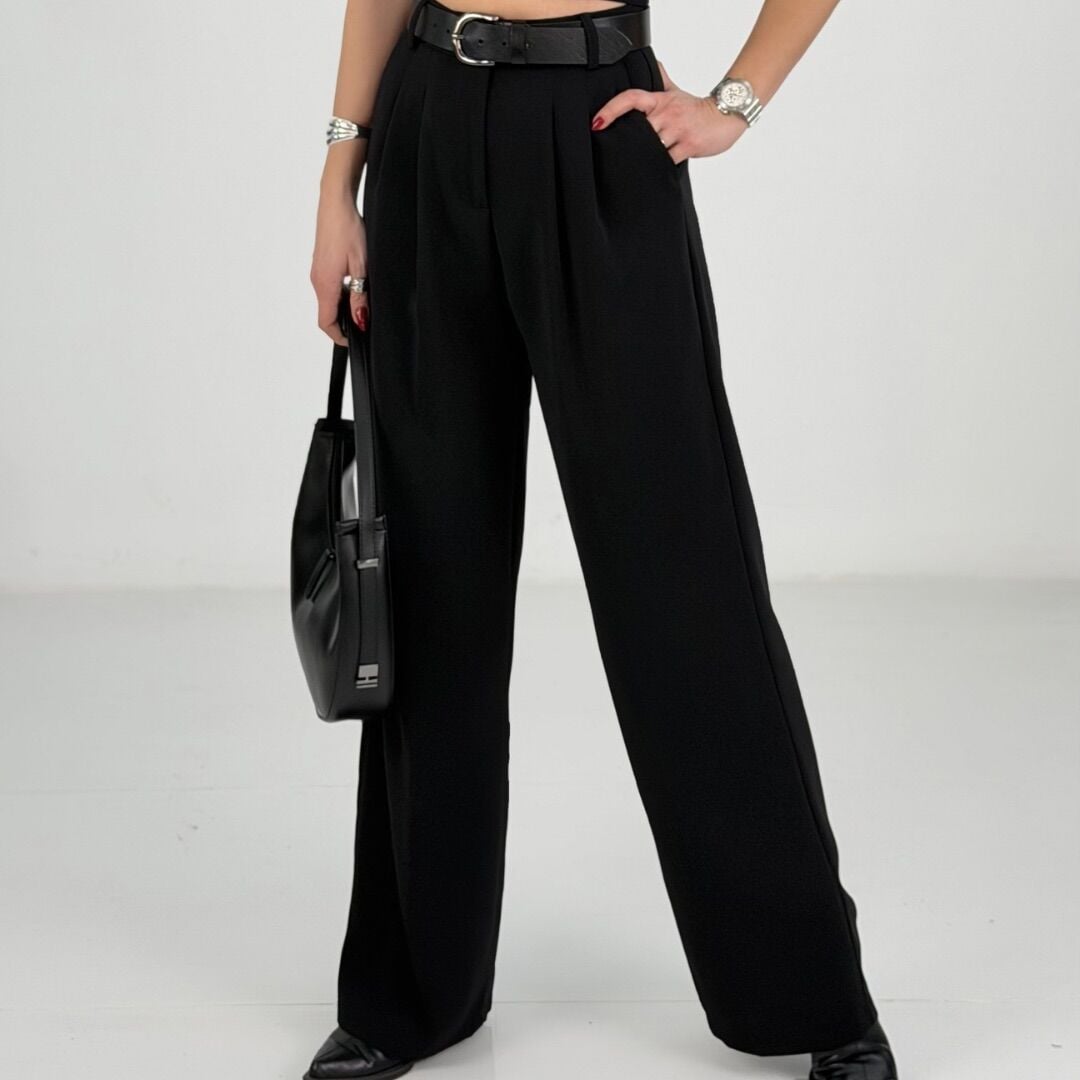 Siyah Belden Lastikli Bol Paça Kumaş Pantolon