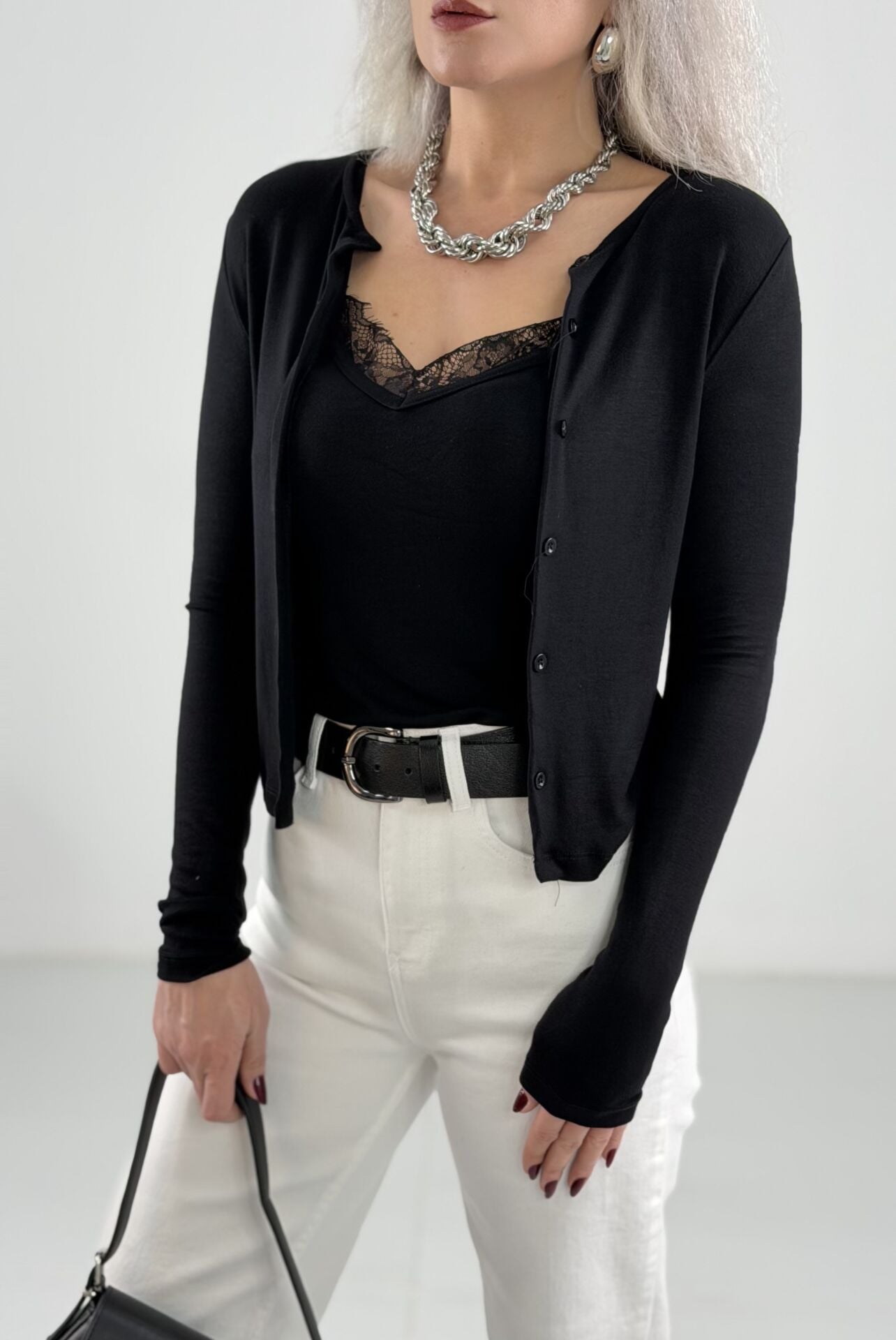 Dantel detaylı atlet ile zarif bir dokunuş, basic hırka ile dengeli bir stil yaratır.