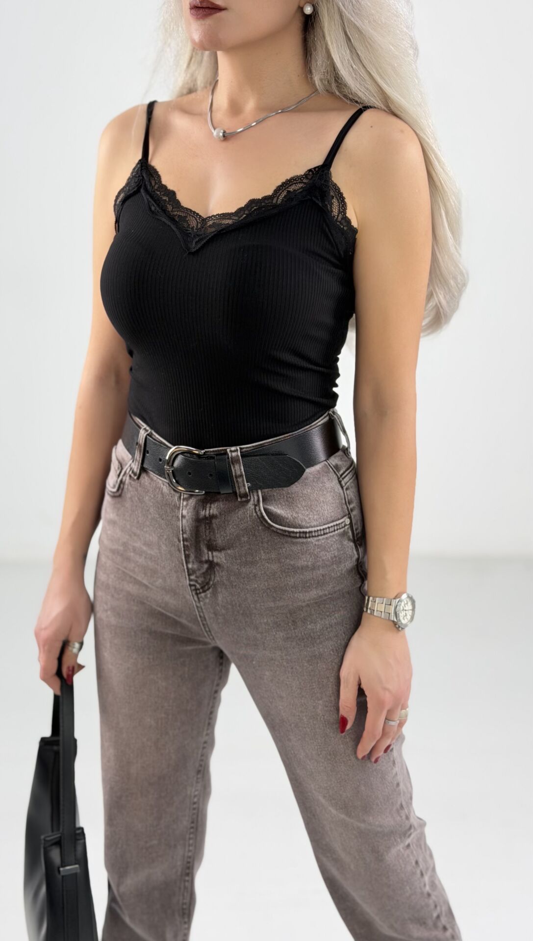 Siyah Dantel Yaka Askılı Bluz