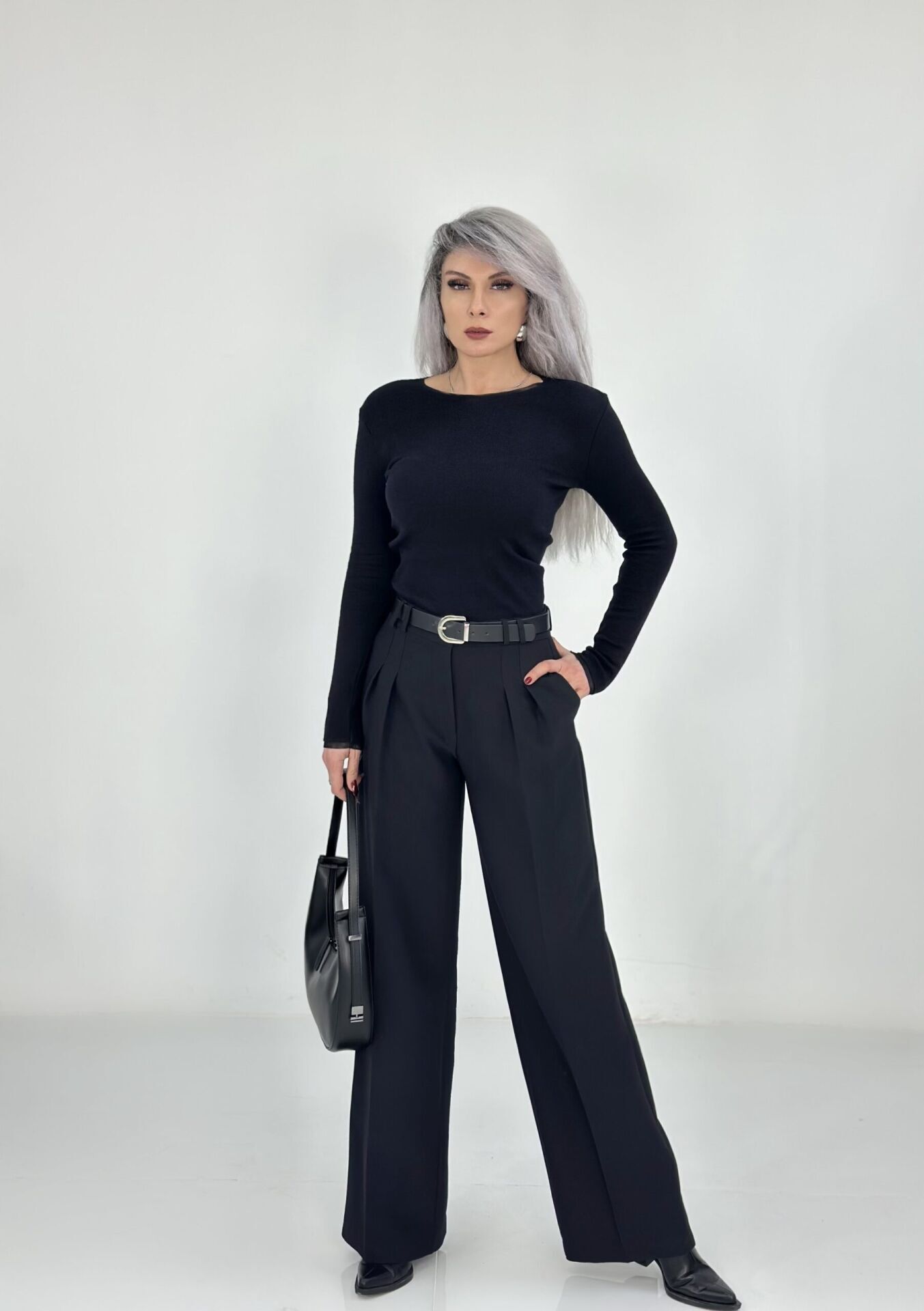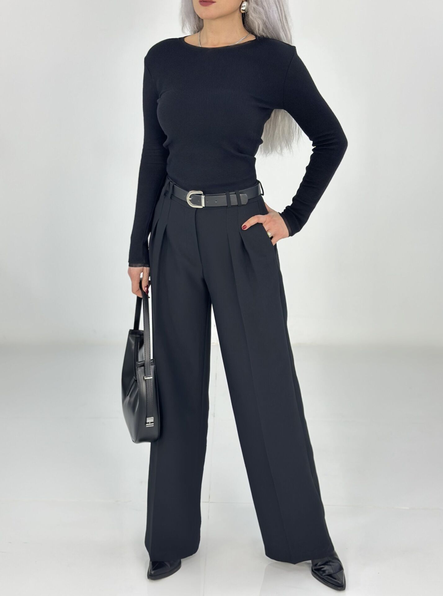 Siyah Kemerli Ön Çift Pileli Bol Paça Kumaş Pantolon