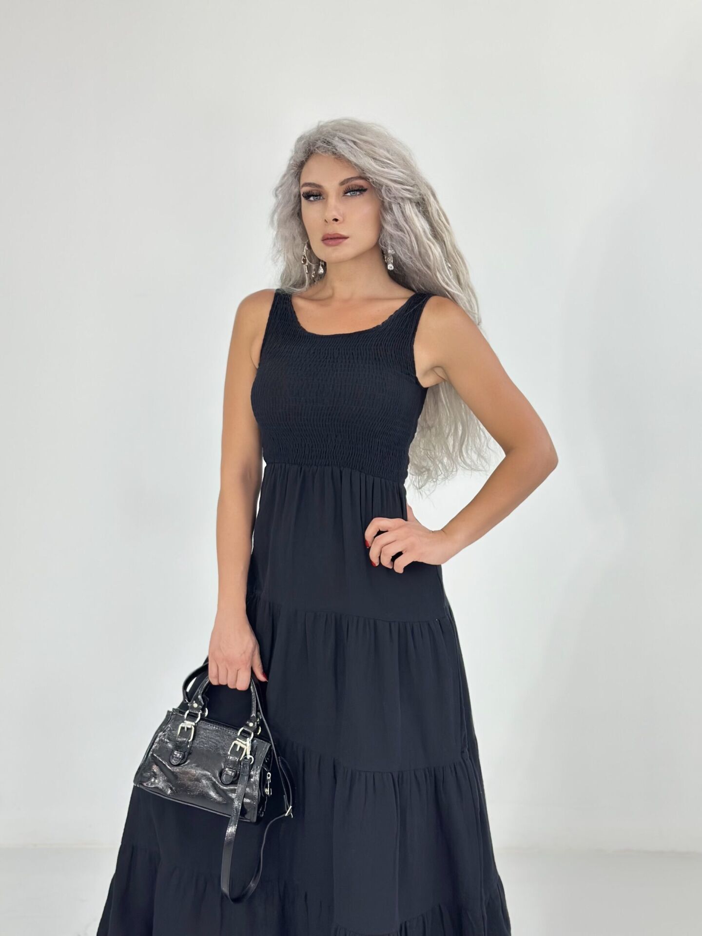 Siyah Kolsuz Müslin Kumaş Uzun Elbise MEDİUM