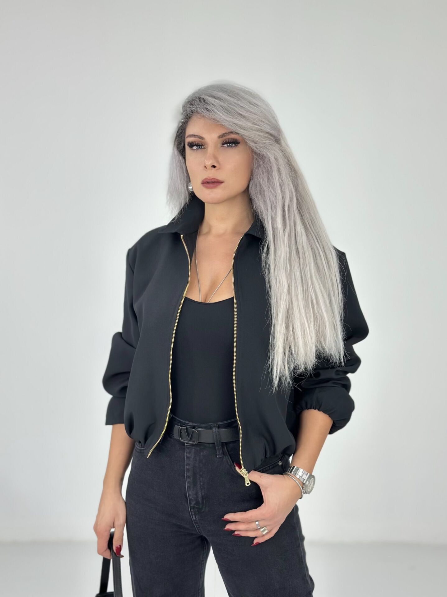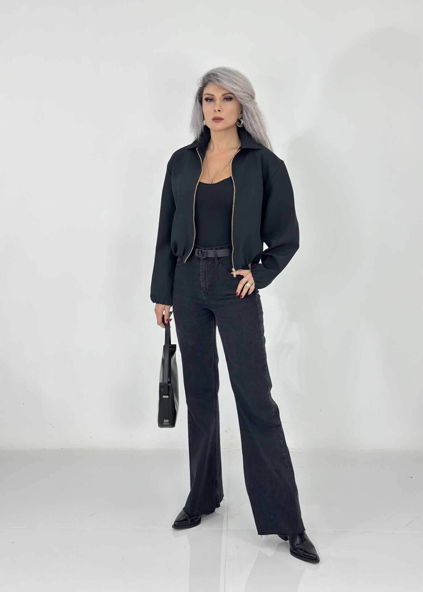 Siyah Krep Kumaş Bomber Ceket