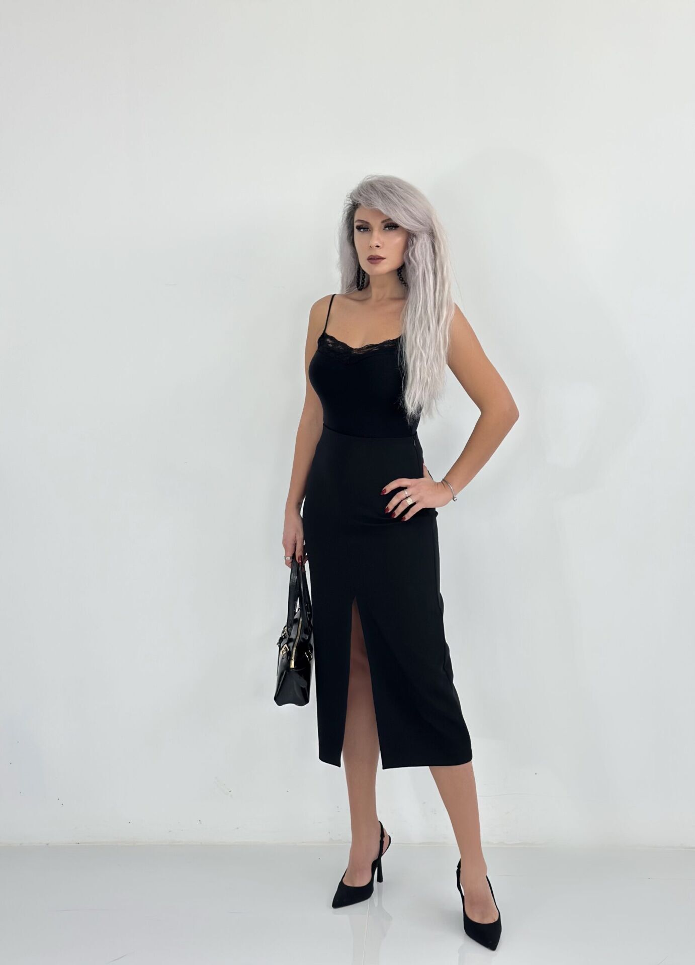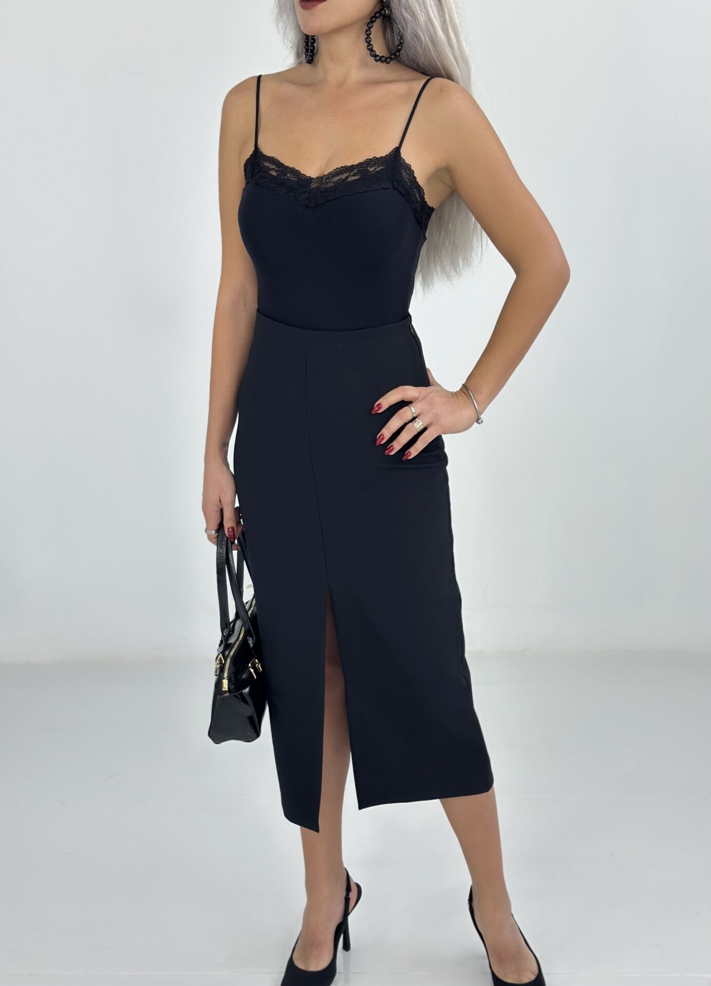 Siyah Ön Yırtmaç Detay Midi Boy Etek