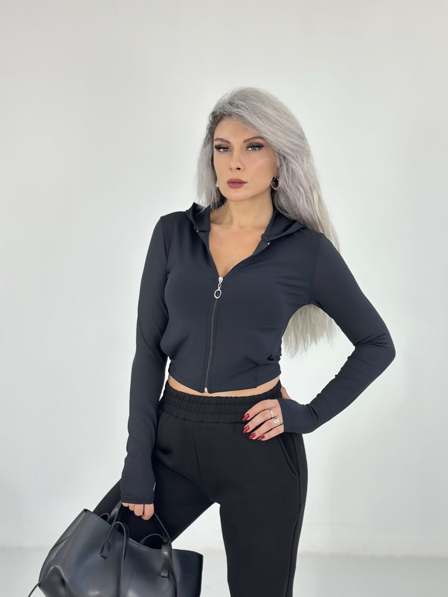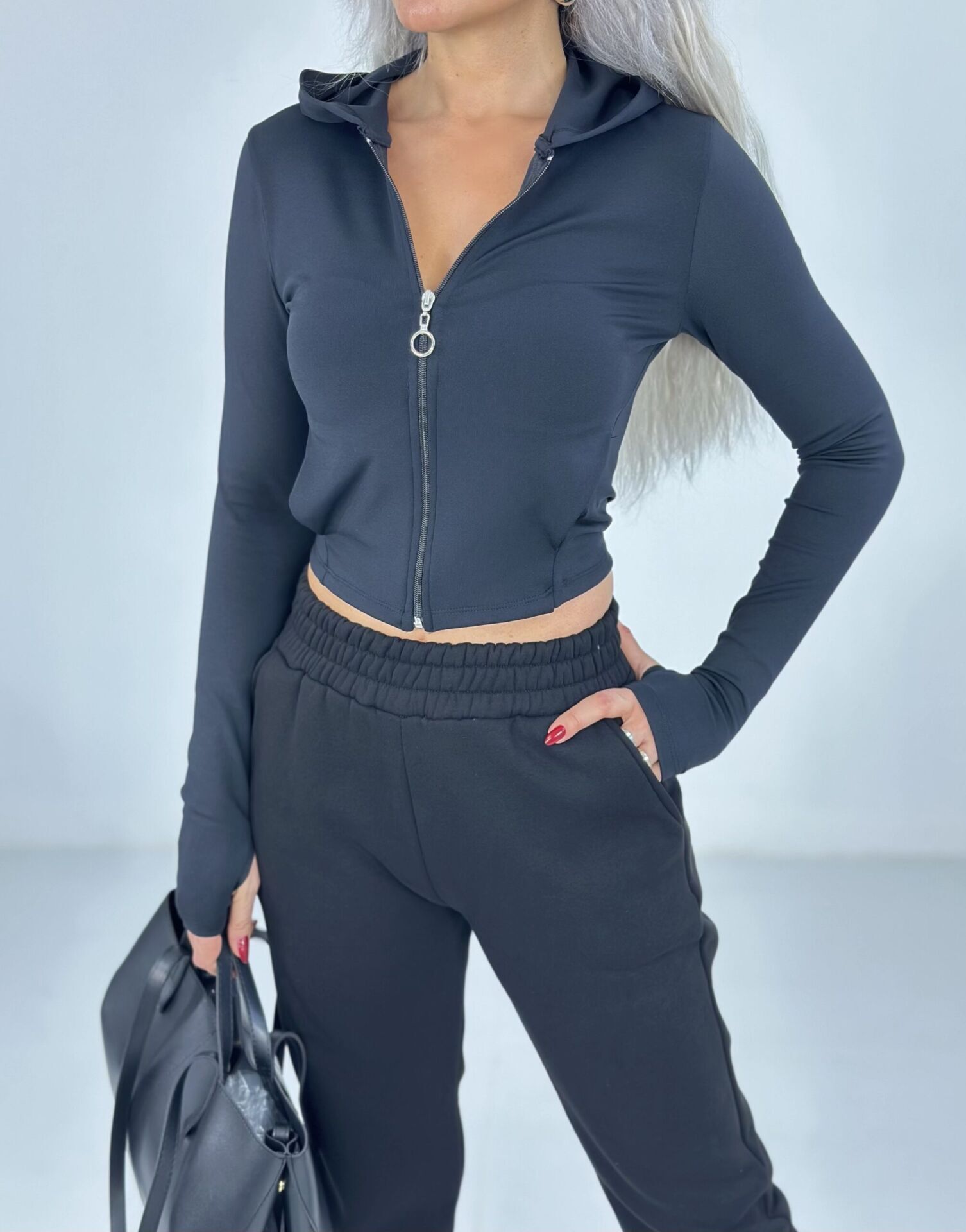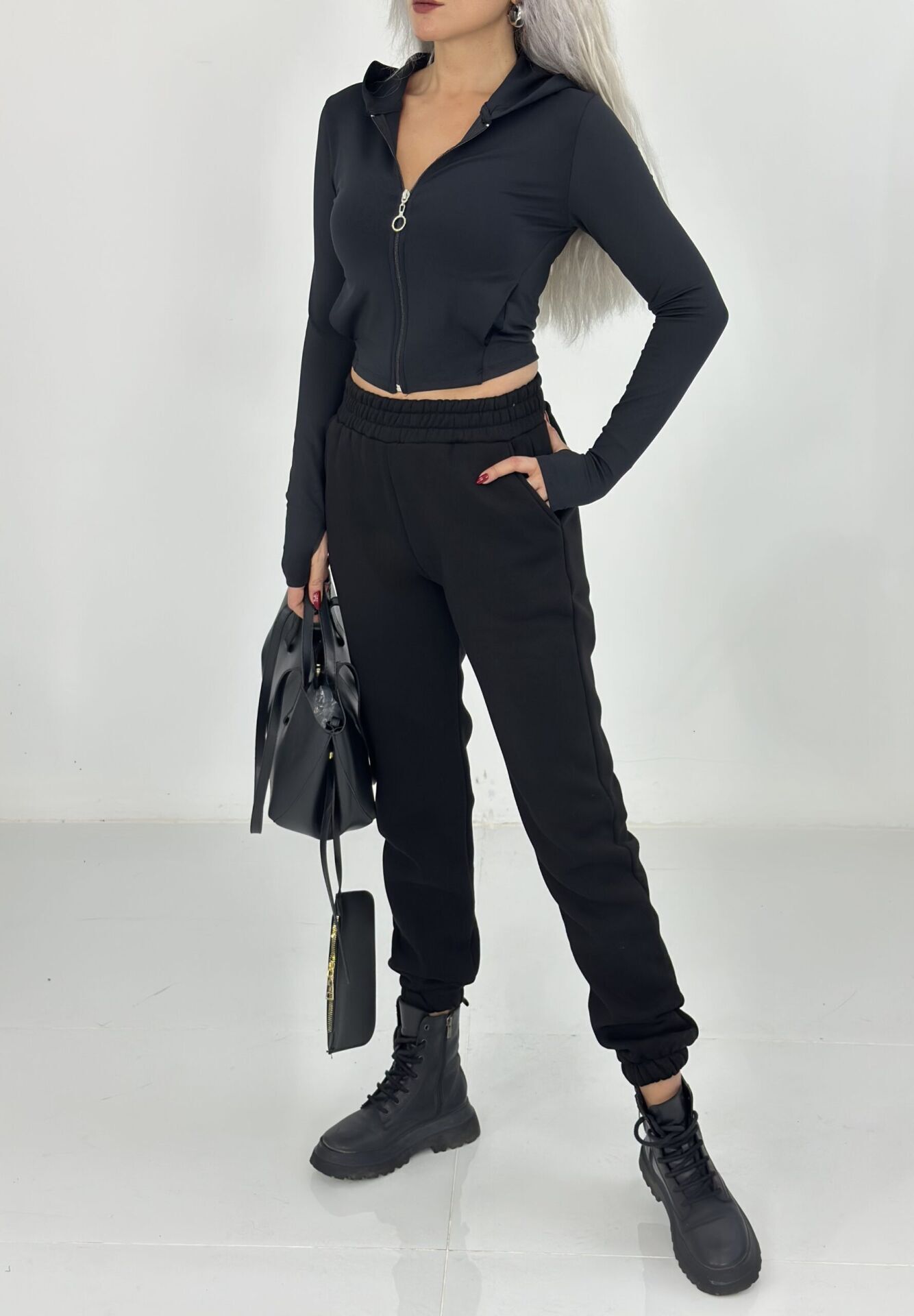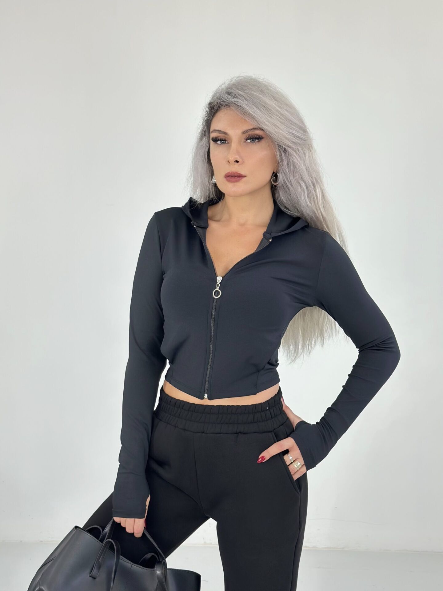 Siyah Parmak Geçmeli Fermuarlı Sweat