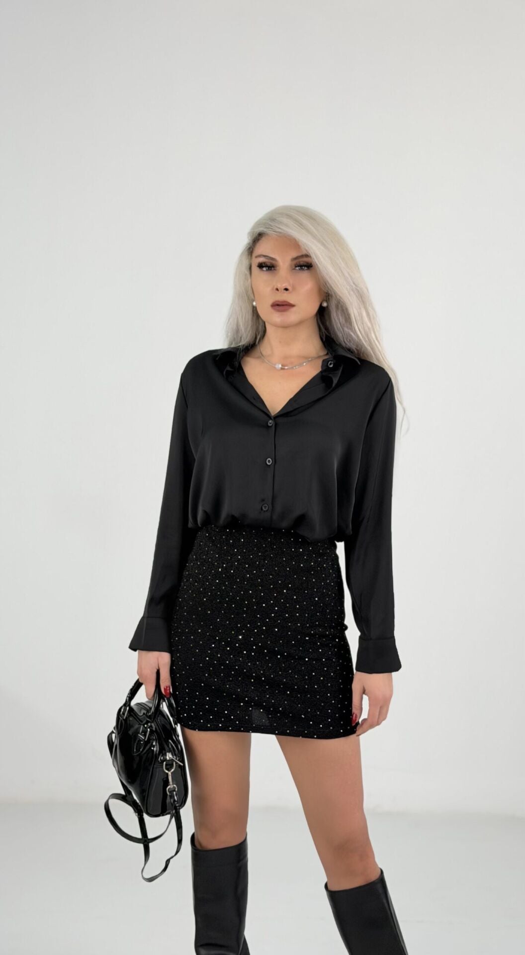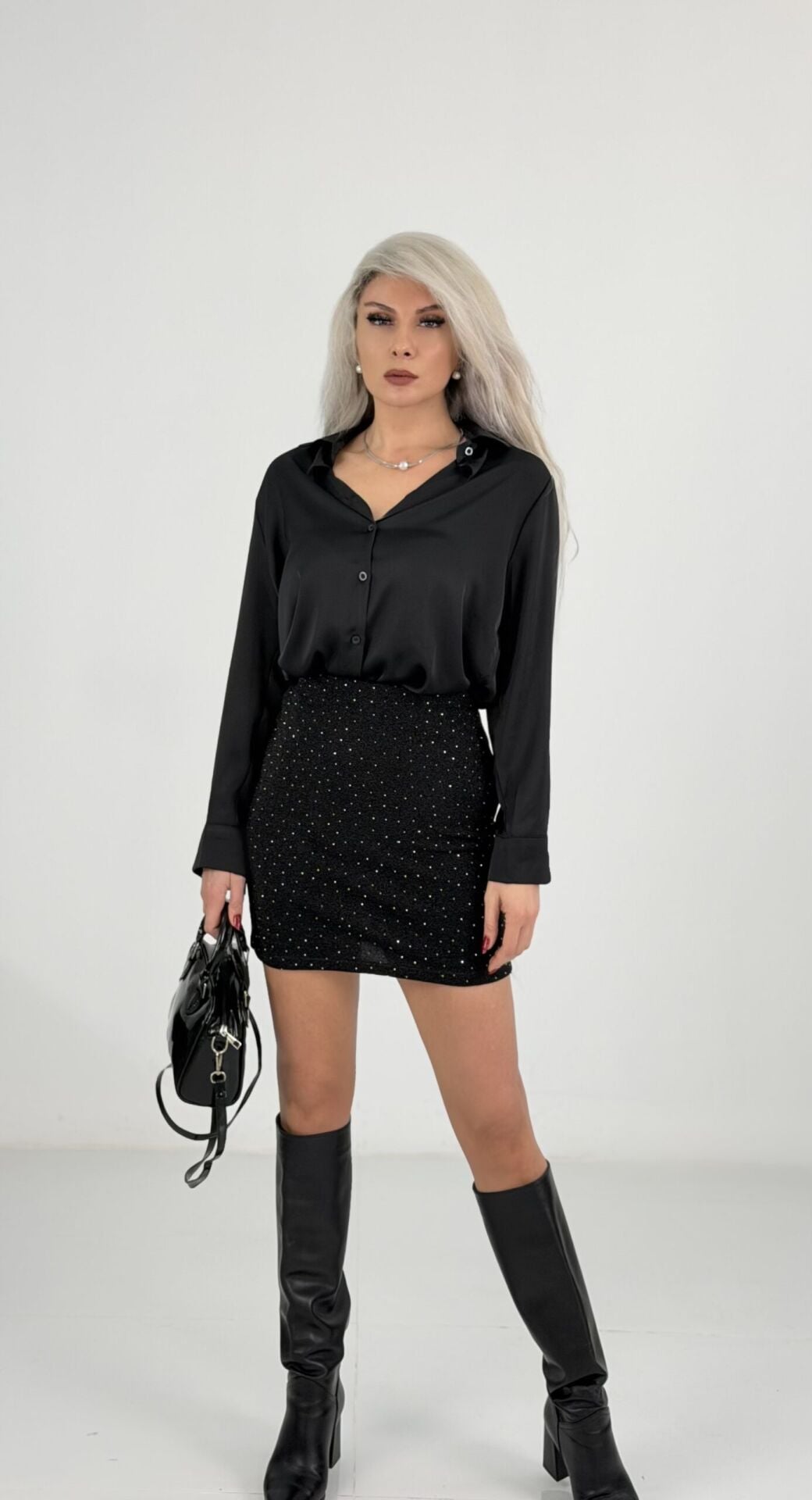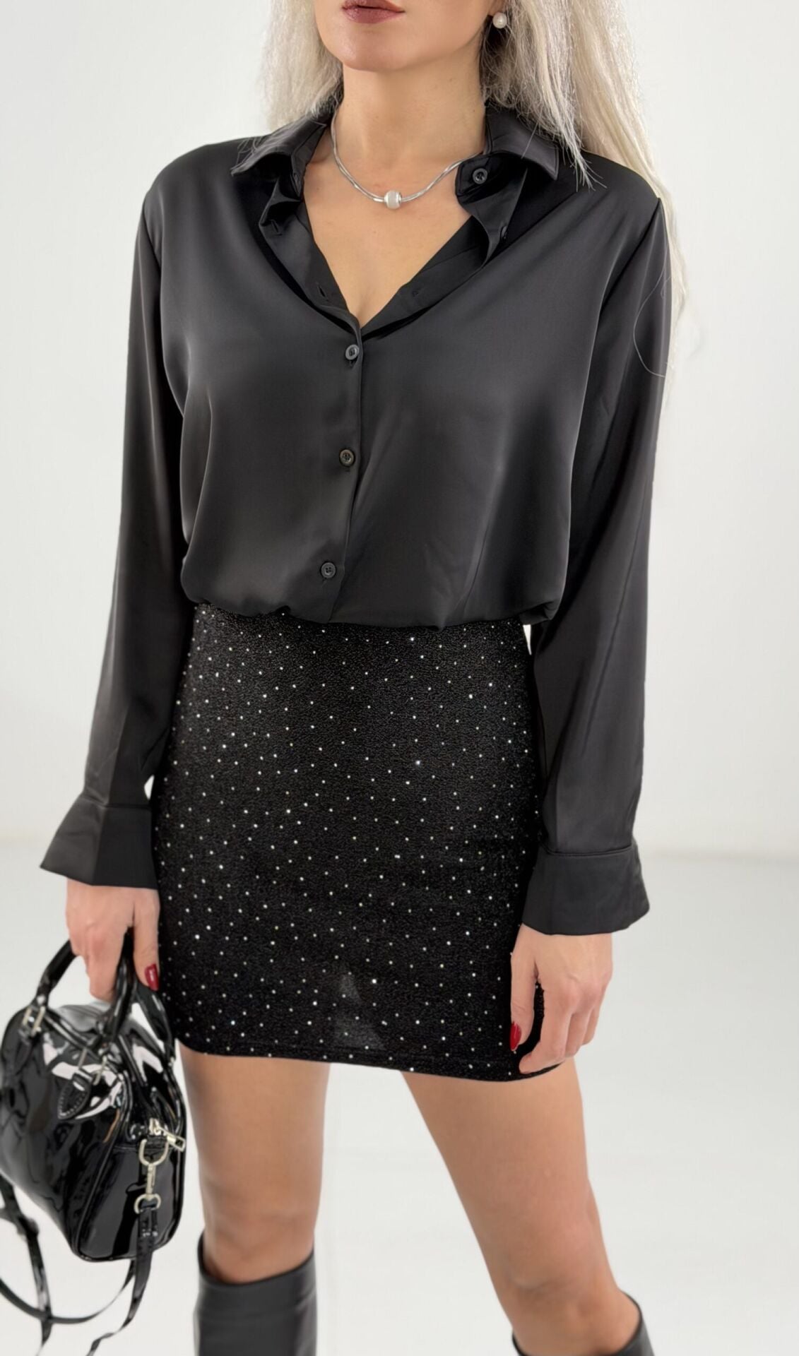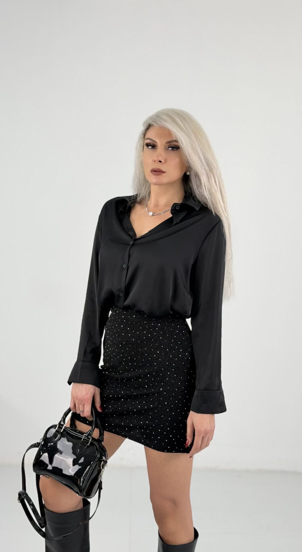 Siyah Taşlı Likralı Mini Etek