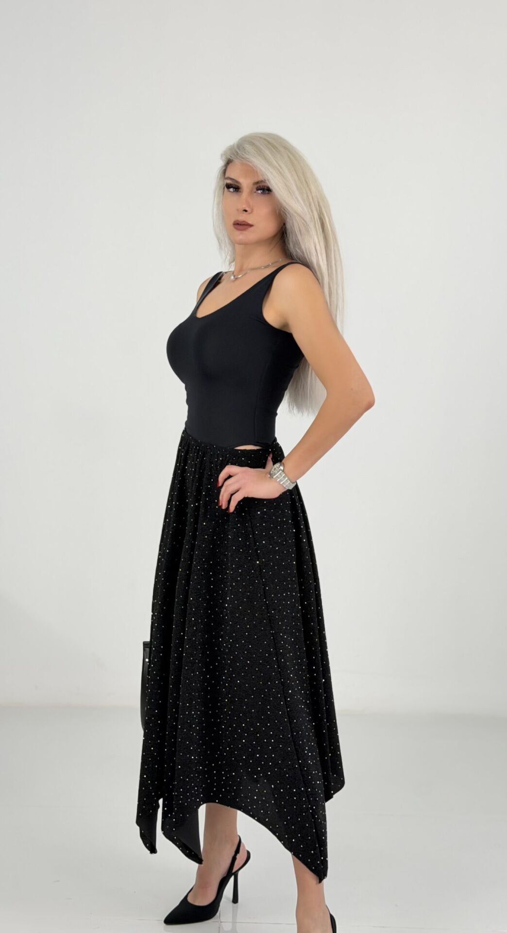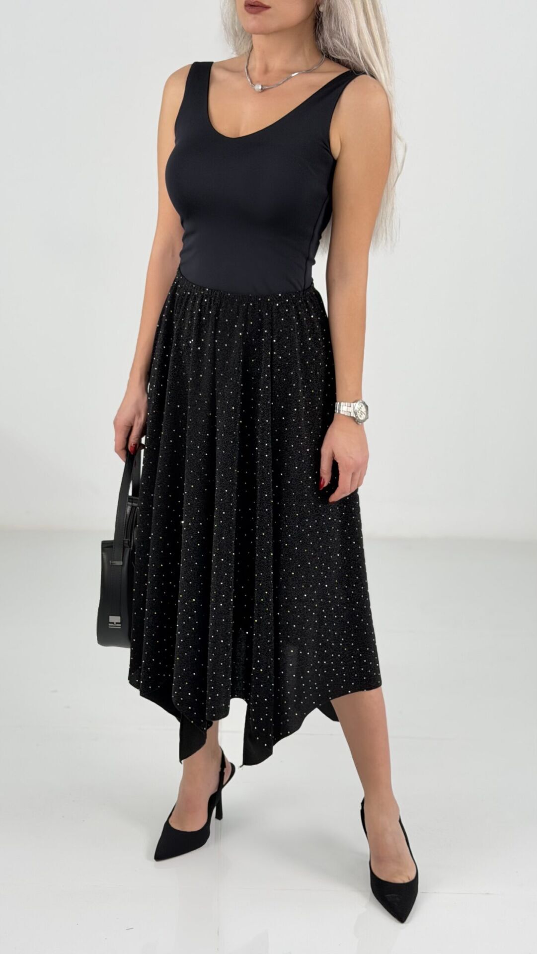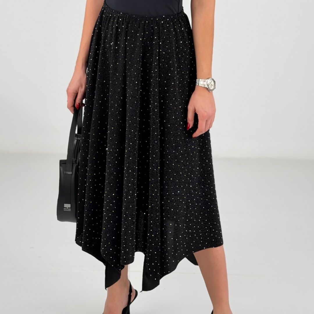 Siyah Taşlı Parçalı Likralı Midi Etek