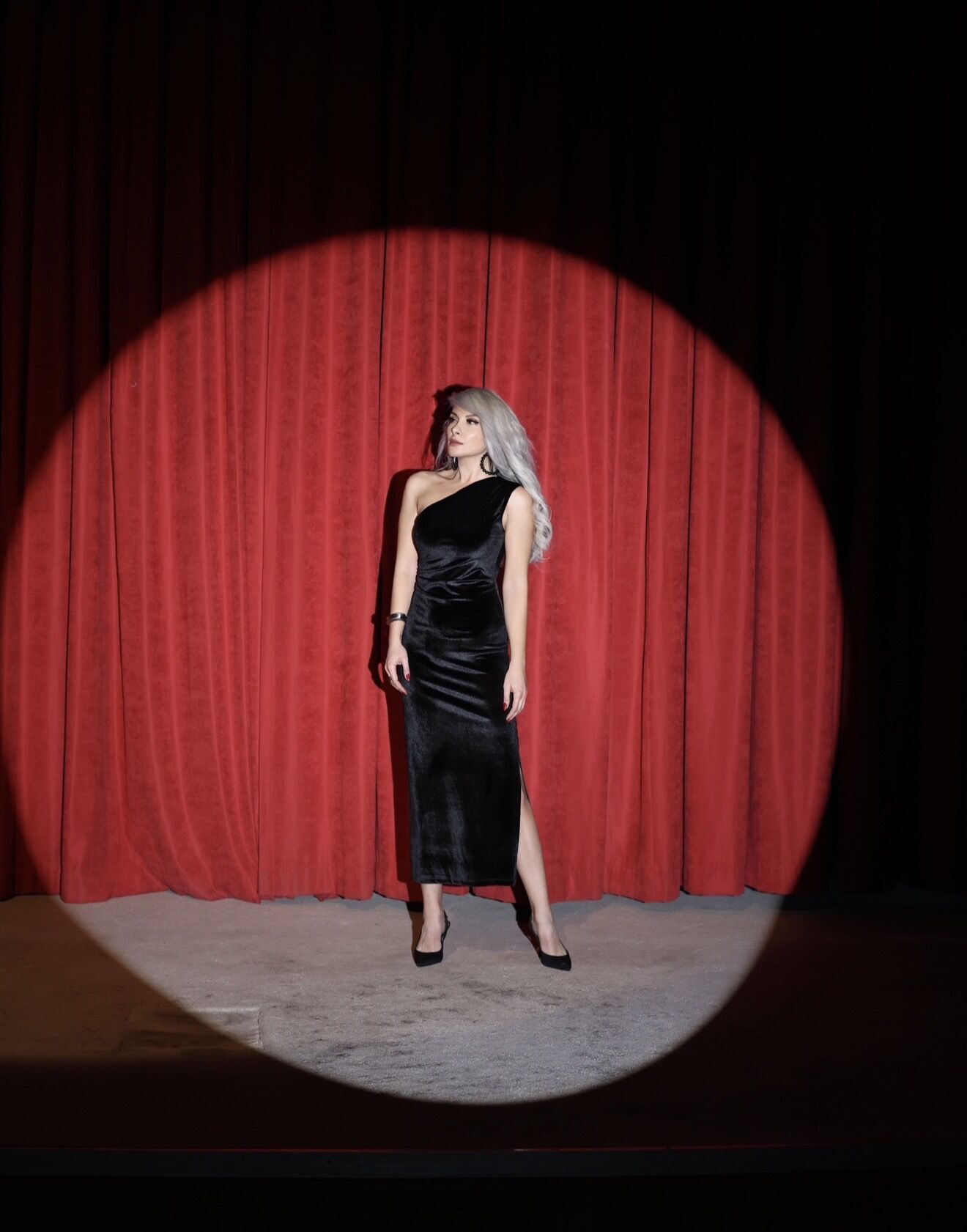 Siyah Tek Omuz Kadife Yan Yırtmaç Detay Midi Elbise LARGE