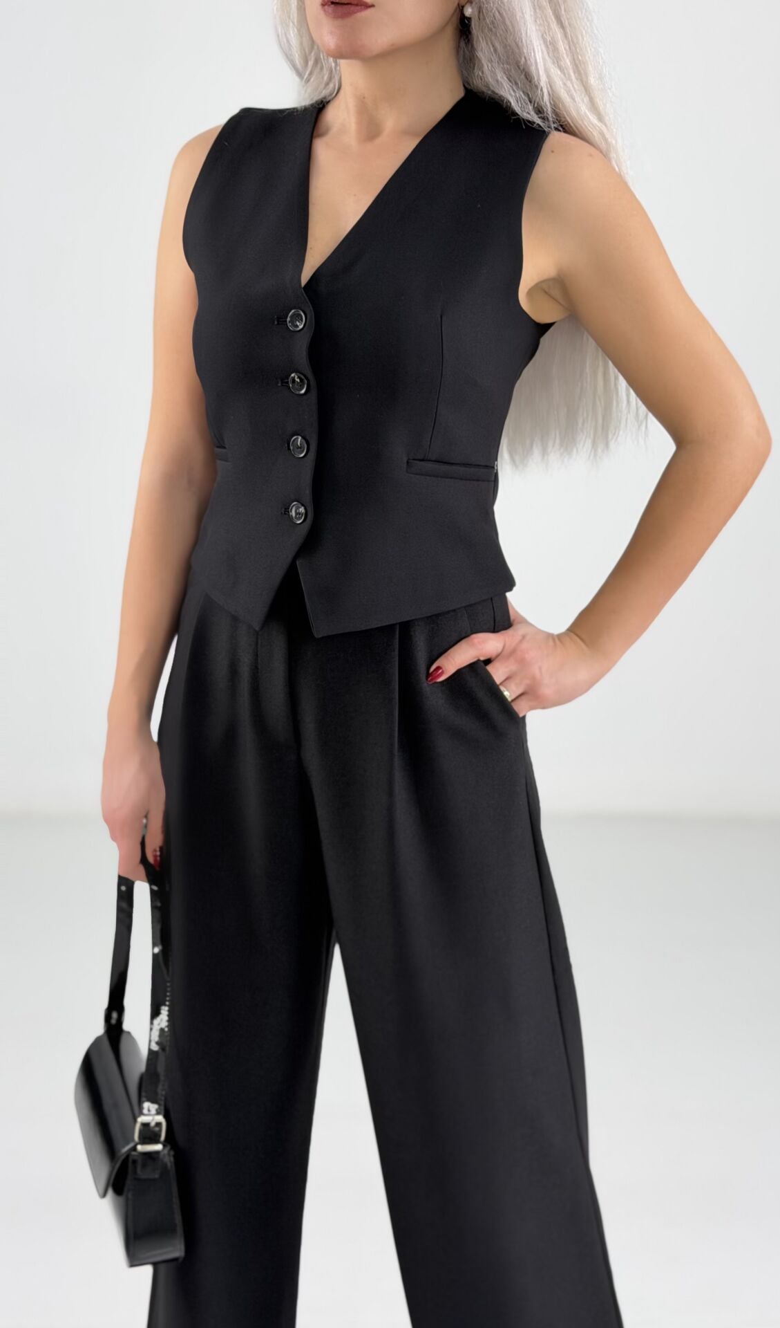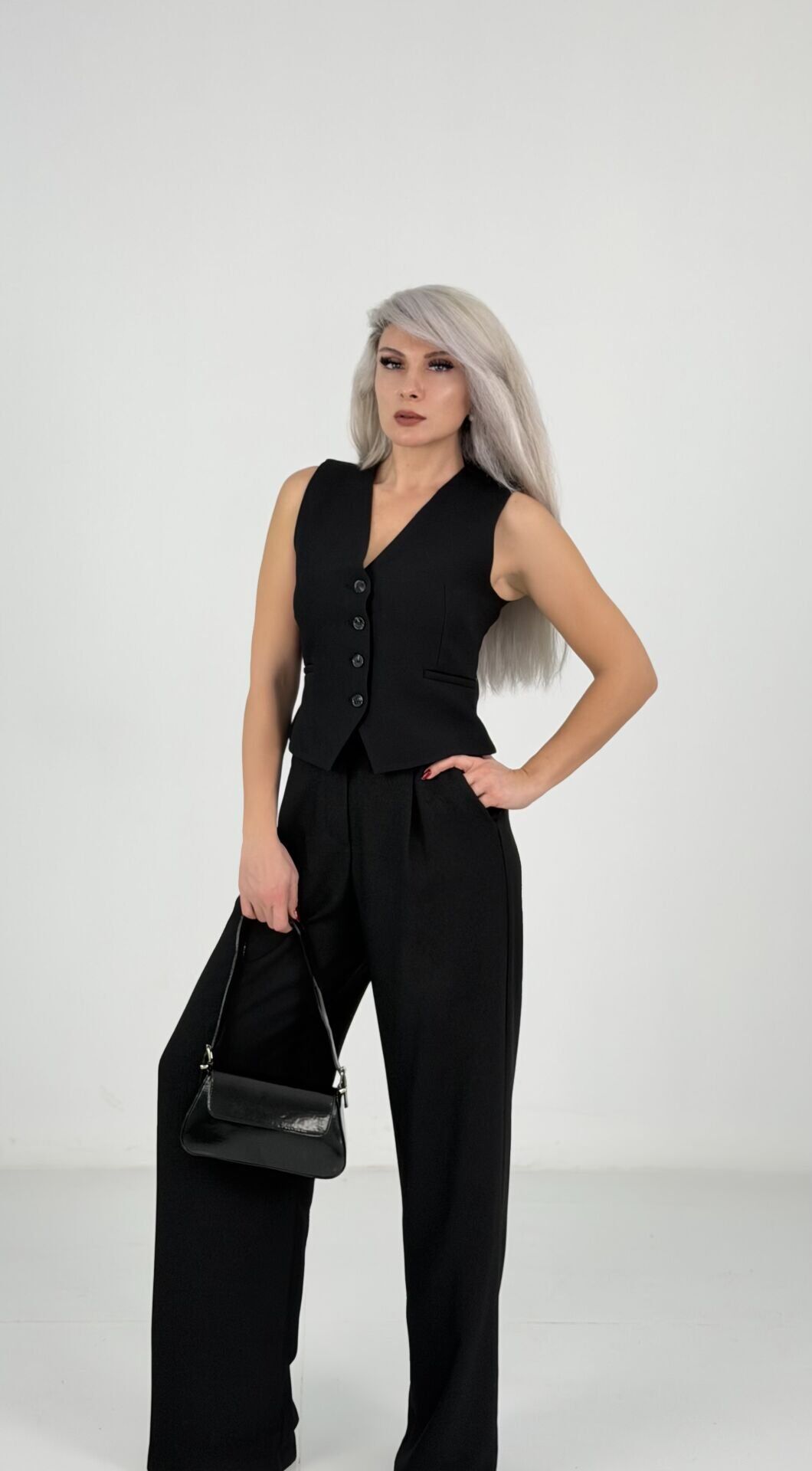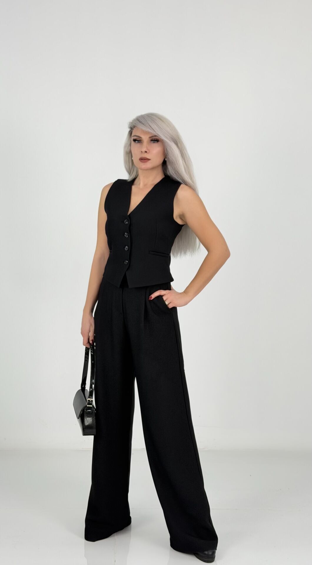 V yaka, düğme detaylı yelek vücuda zarif bir form kazandırırken; yüksek bel, bol paça pantolon rahatlığı ve şıklığı bir arada sunar.